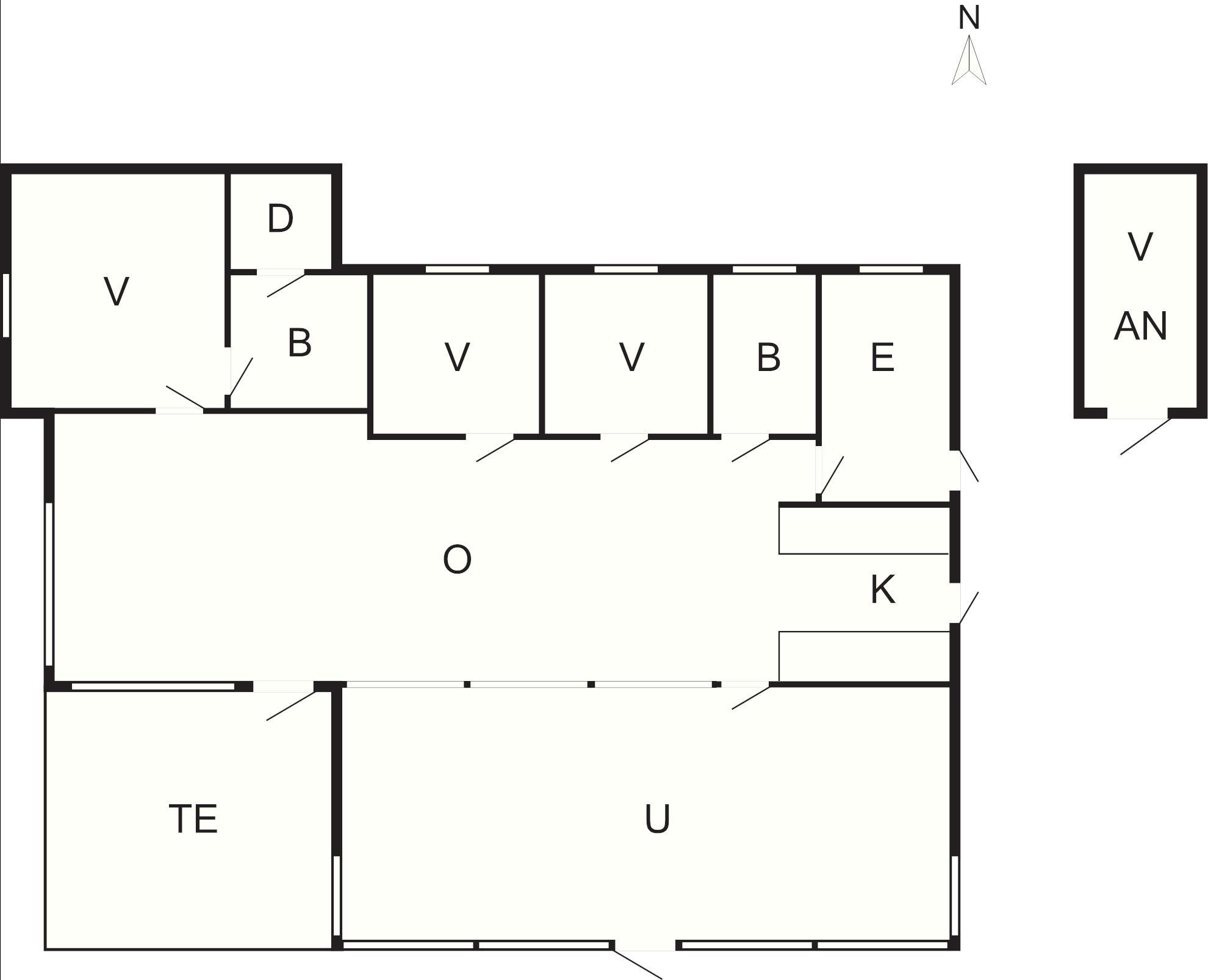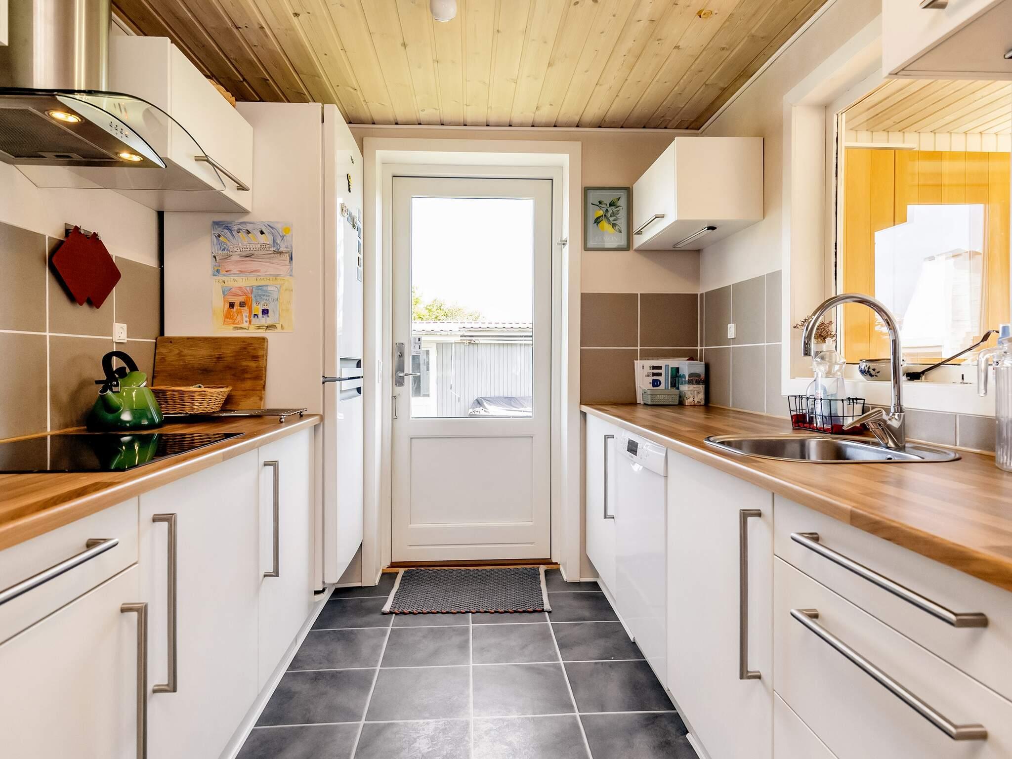 Feriehuset har entré med vaskemaskine, badeværelse og køkken, der åbner ud til stuen, som begge er renoveret i 2016. Der er installeret brændeovn og luft-til-luft varmepumpe til køling i forår og efterår. Fra stuen er der udgang til en skøn, lys udestue. Der er desuden et master bedroom med dobbeltseng og adgang til husets andet badeværelse, et værelse med dobbeltseng, et værelse med en enkeltseng og to køjesenge. Derudover er der tilbygning med dobbeltseng og to køjesenge.