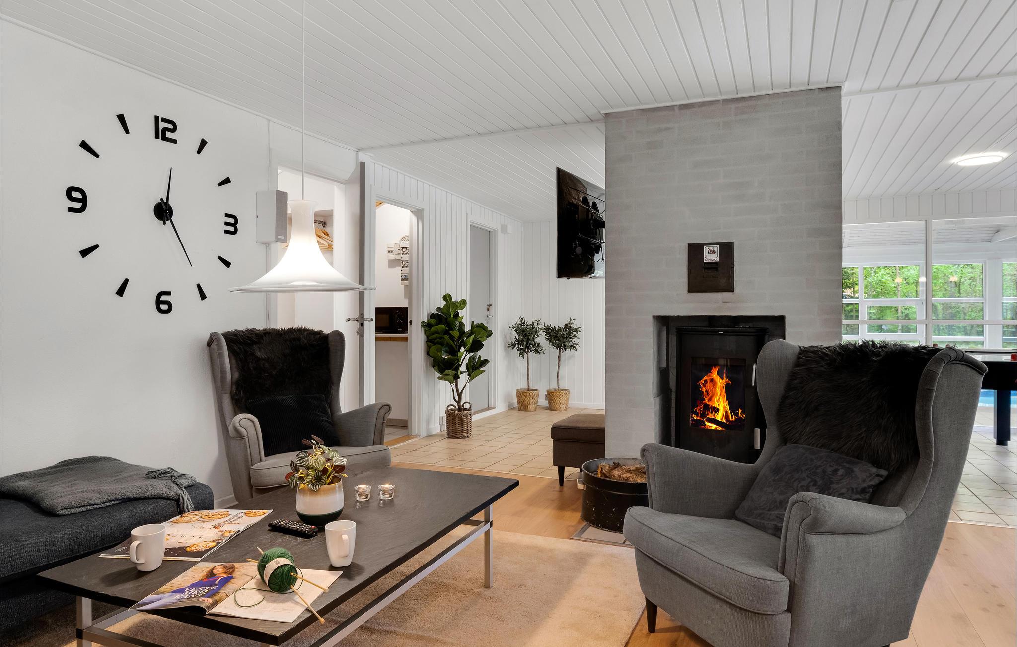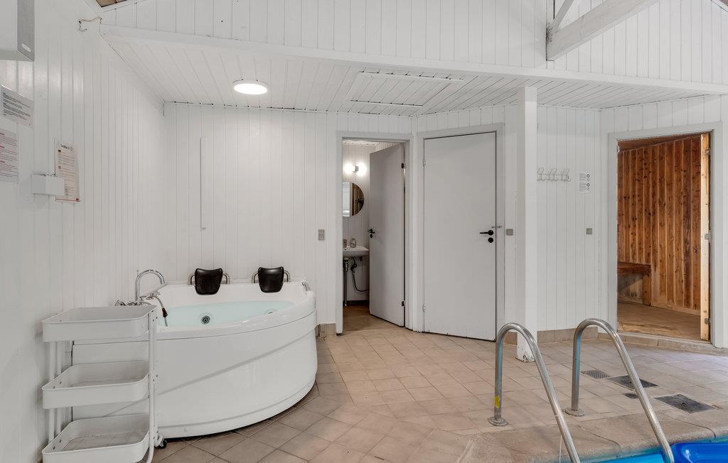 Velkommen til dette rummelige, lyse og moderne feriehus, som er særdeles velegnet til familier eller større grupper. Højdepunktet er uden tvivl den store indendørspool, hvor I kan tilbringe timevis med at svømme baner og plaske rundt. Der er udsyn til poolen fra stuen, så I kan holde øje med børnene, mens I slapper af. Efter en dukkert elller en frisk gåtur kan I slappe vidunderligt af i saunaen og spabadet. Om aftenen kan I flade ud foran fjernsynet i komfortable møbler.