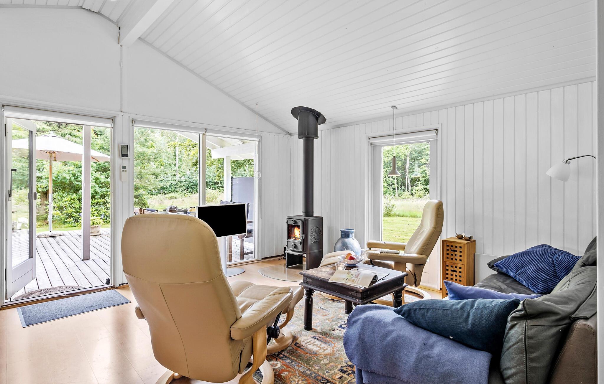 Gå også ud på træterrassen, der omgiver huset, og nyd en god kop kaffe om morgenen. Den overdækkede terrasse giver jer skygge og en hyggelig plads til fælles måltider i det fri. Sol jer på liggestolene, og se børnene lege i haven.