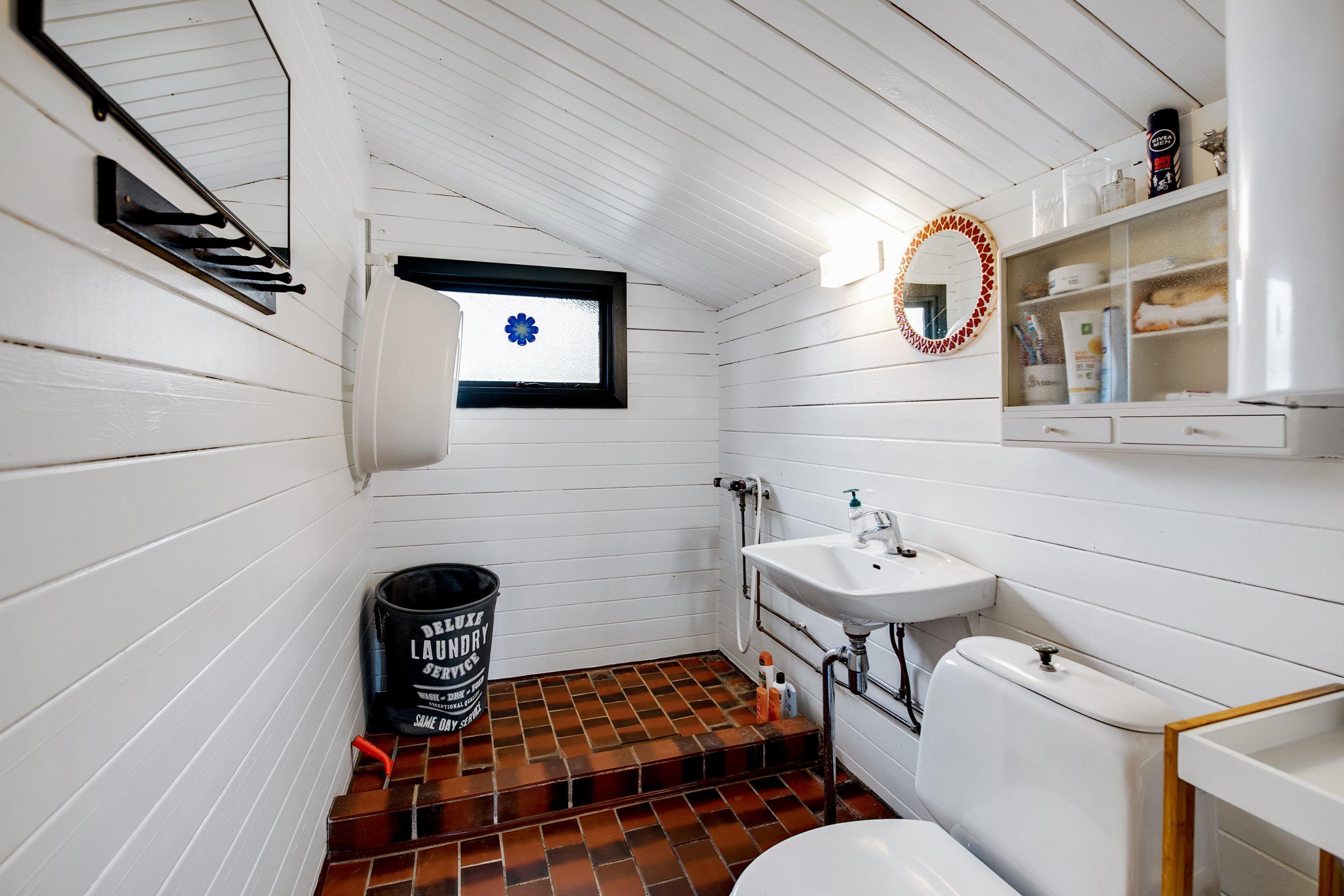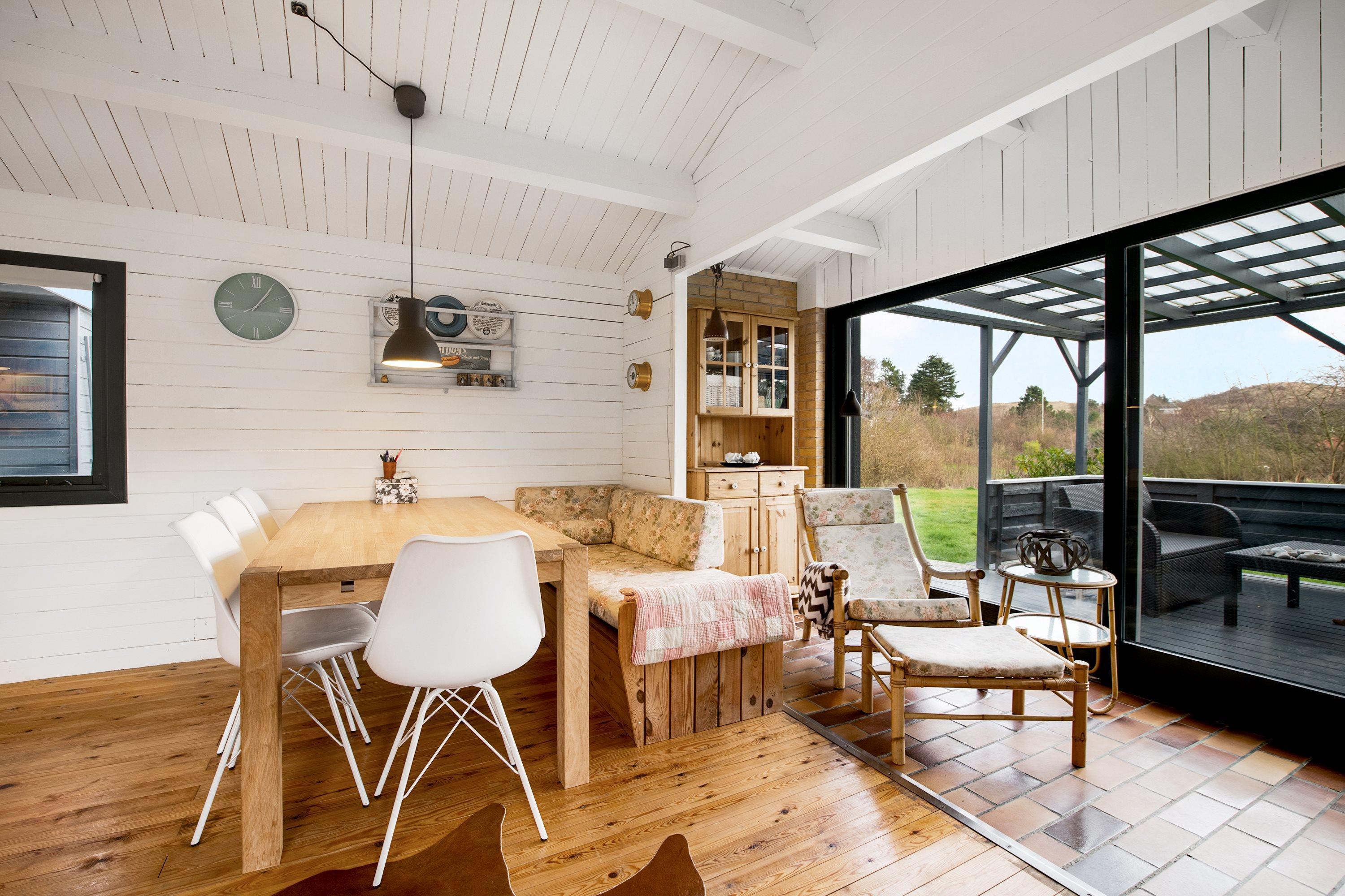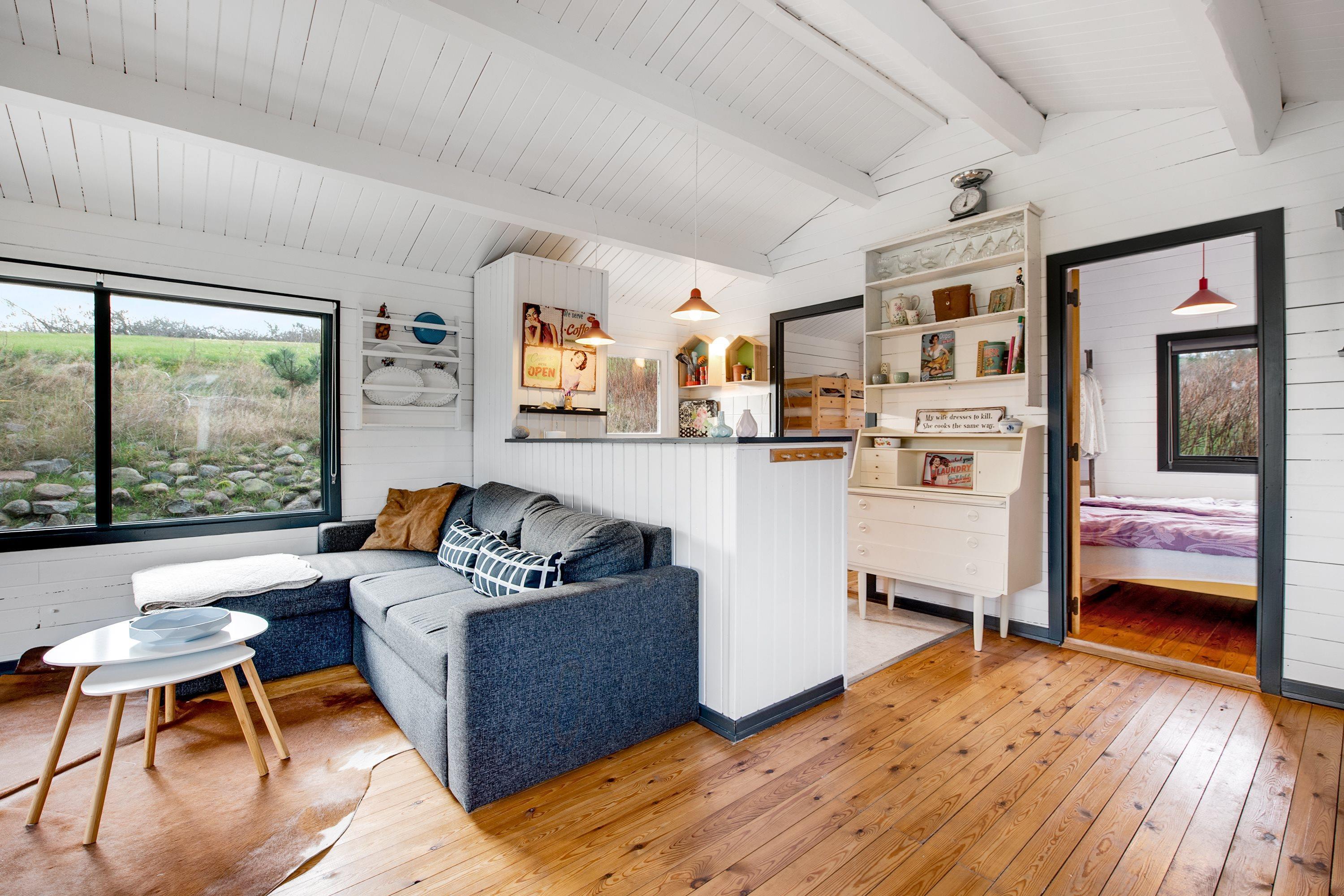 Den hyggelige, velmøblerede opholdsstue med udgang til overdækket terrasse/udestue fremstår som resten af huset lys og indbydende med hvidmalede vægge og lofter til kip. Her er spiseafdeling til 6 personer, brændeovn, dejligt sofahjørne og TV med danske gratis kanaler. Det lille men velindrettede køkken ligger i åben forbindelse med stuen og har komfur med keramiske kogeplader, ovn og køleskab. Husets i alt 6 sengepladser fordeler sig på 1 soveværelse med dobbeltseng, 1 værelse med køjeseng samt stort anneks med dobbeltseng og eget toilet. I hovedhuset er der varmepumpe og der et lyst og praktisk indrettet badeværelse med bruseniche samt badekar til de mindste. Der er ligeledes varmepumpe i annekset. Der er internetadgang.