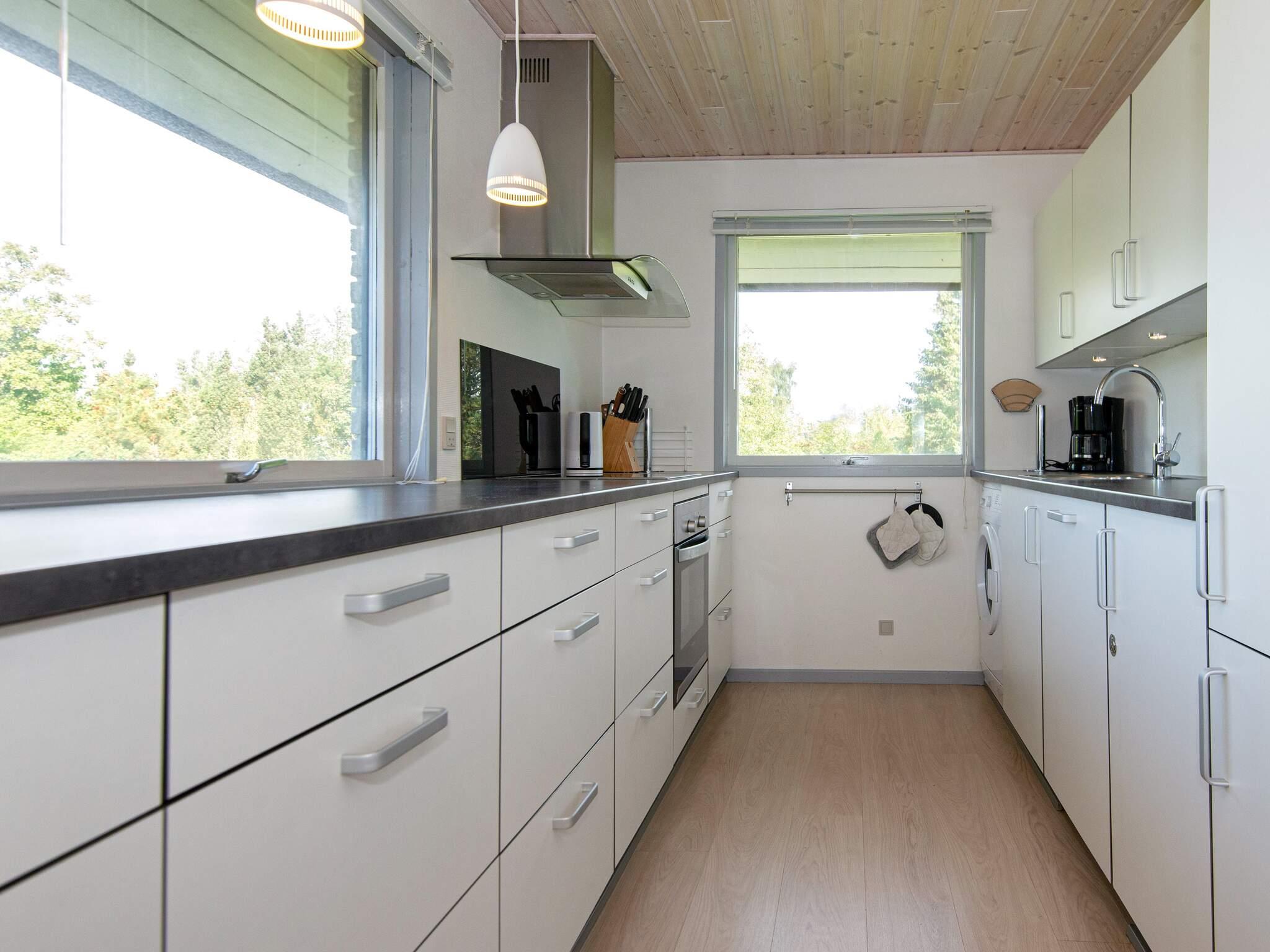 Højtbeliggende sommerhus med dejlig stort græsareal rundt om huset. Huset er møbleret i skandinavisk stil, som giver lyse rum, og vinduerne hjælper også med til at give lys i rummene. Køkkenet ligger i åben forbindelse med stuen, så her kan I ”kokkerere” samtidig med at der spilles spil i stuen og alle kan hygge sig med begge dele samtidigt.Sommerhuset har luft/luft varmepumpe. På terrassen kan I sidde delvist overdækket og nyde maden, samtidig med at I kigger på den smukke natur lige rundt om huset og slapper helt af. Udlejes ikke til ungdomsgrupper.