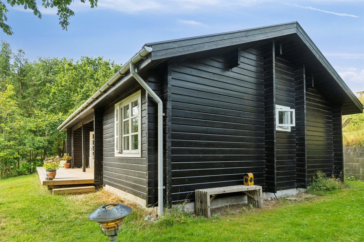 Hyggeligt træsommerhus på Helgenæs med naturgrund, bålsted og tæt på havet.