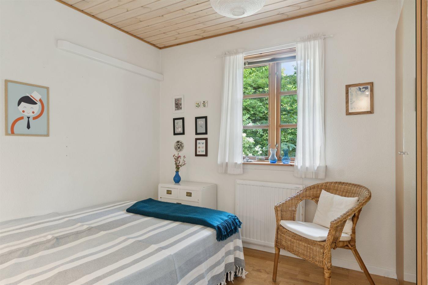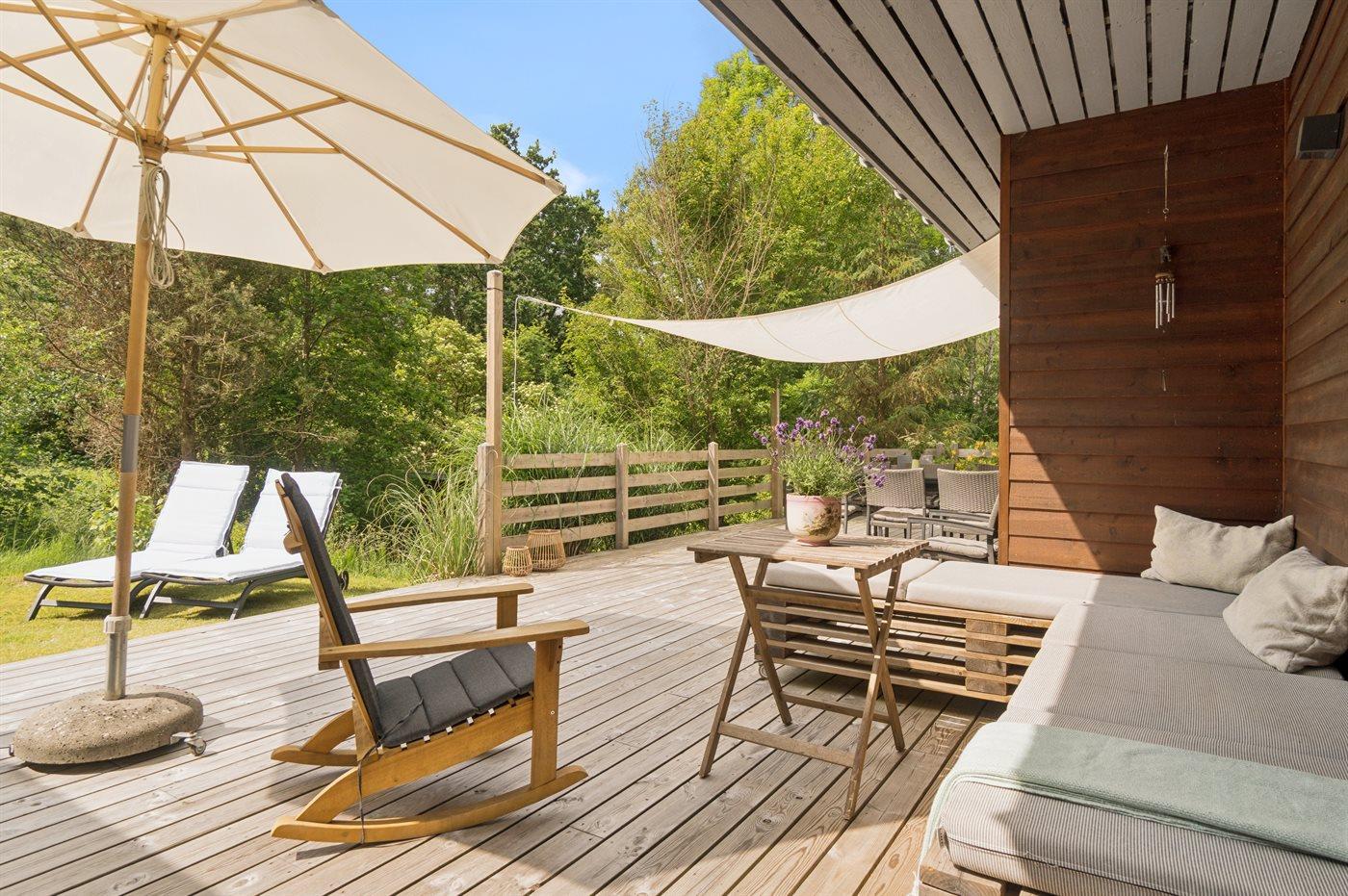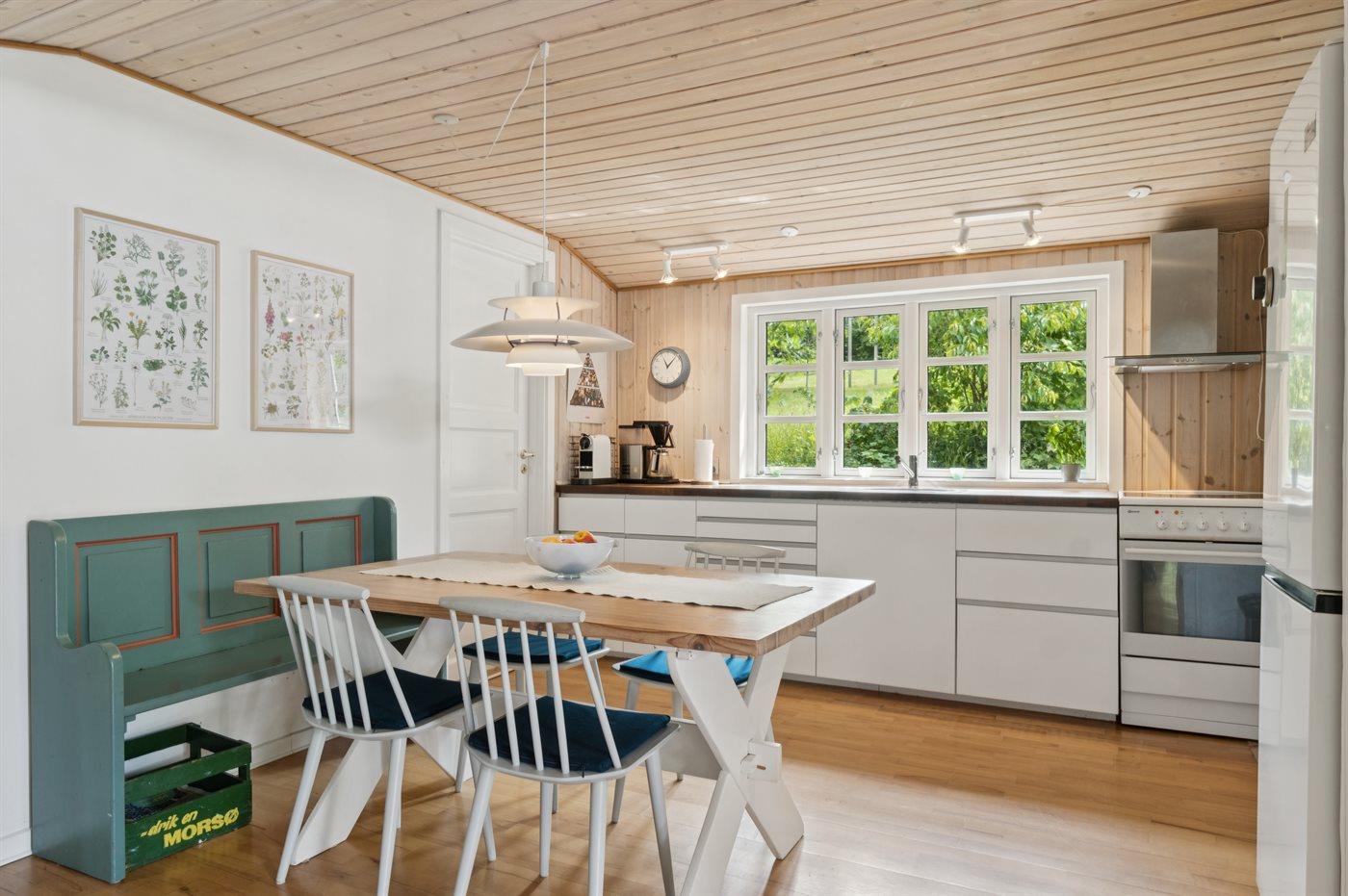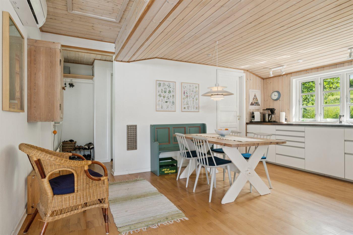 Huset ligger for enden af en lille, fredelig fællesvej - omgivet af skov og åbne vidder. Fra stuen og terrassen fornemmer man straks, at naturen er tæt på – med fuglesang om morgenen og ofte et rådyr, der kigger forbi i skumringen. Det er et sted, der inviterer til nærvær, brætspil, lange gåture og stille aftener foran brændeovnen.