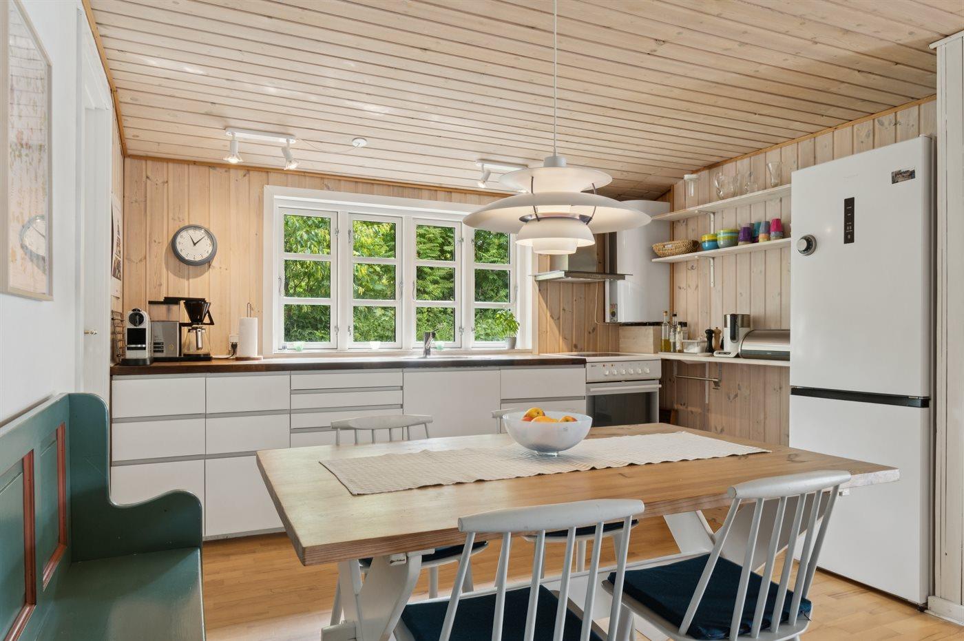 Køkkenet er udstyret med 1 køleskab. Der er 4 keramiske kogeplader, varmluftovn, mikrobølgeovn.