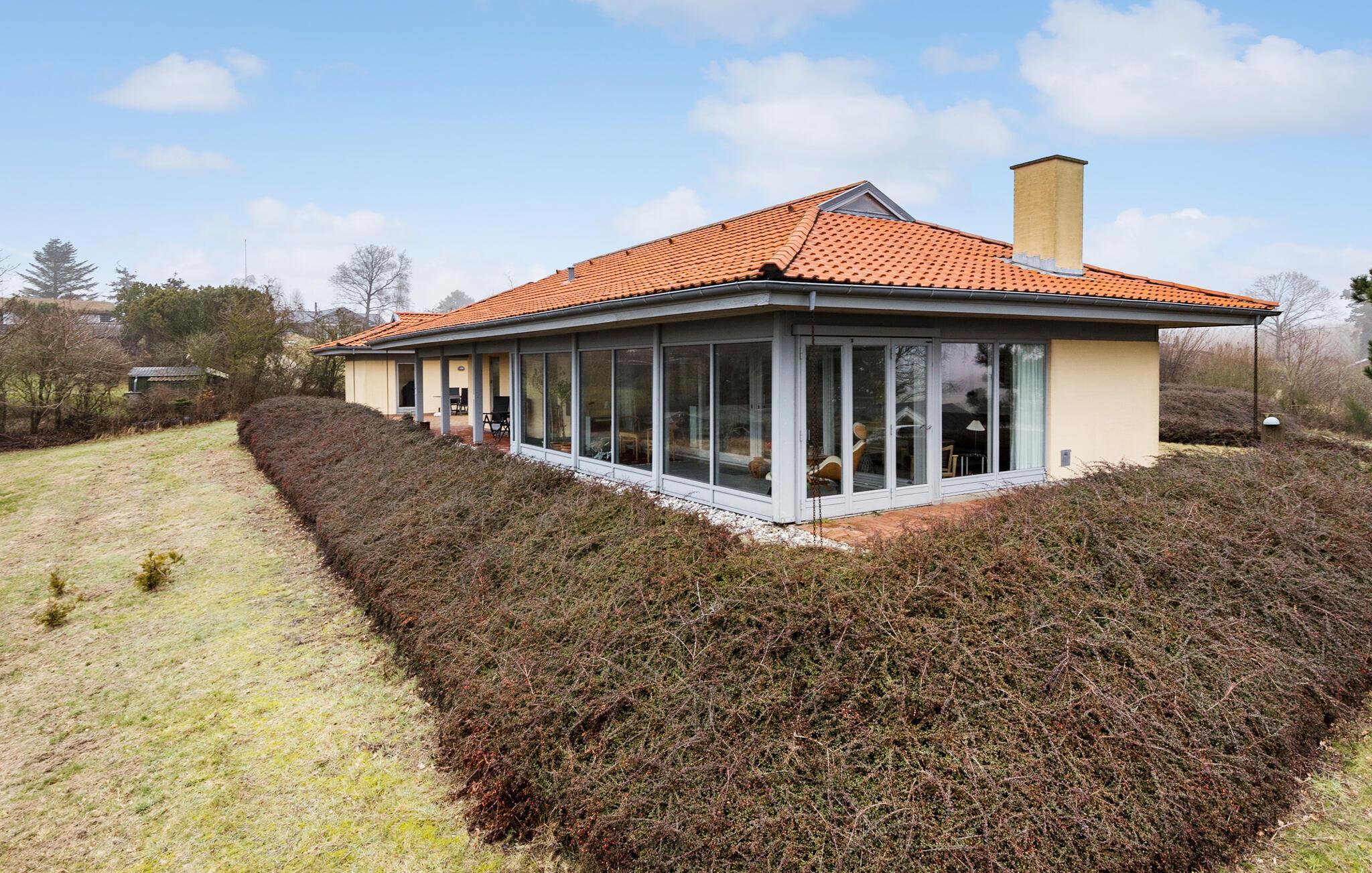 Stilfuldt feriehus på Helgenæs med havudsigt, sauna og stor terrasse i smuk natur.