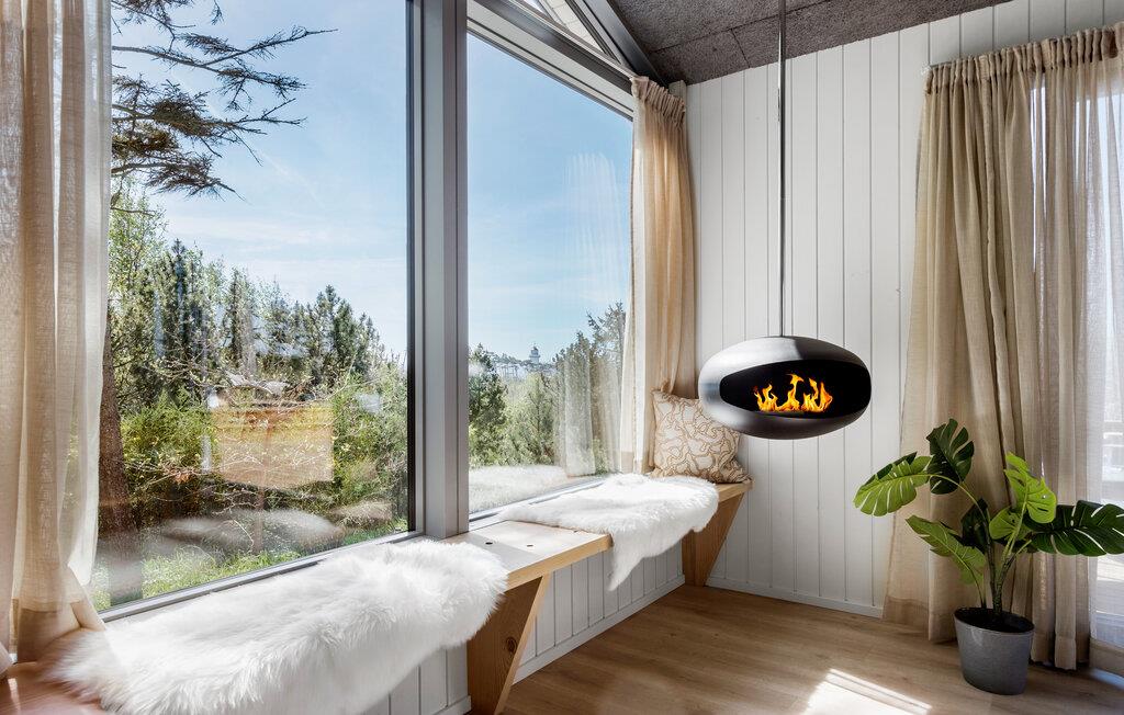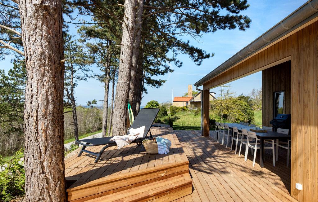 Tilbring jeres næste ferie i dette moderne feriehus, der kombinerer komfort, design og en fantastisk udsigt. Slap af i den rummelige opholdsstue med højt til loftet og panoramavinduer. Nyd det stilfulde interiør med komfortable sofaer, udsøgt kunst på væggene og et harmonisk farvekoncept. Lav maden sammen i det lyse, åbne køkken med kogeø og hvidevarer af høj kvalitet. Tag plads ved det lange spisebord med udsigt over grønne områder og vandet.