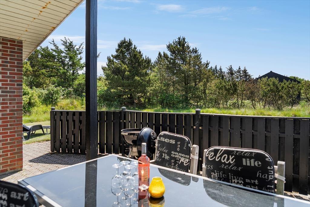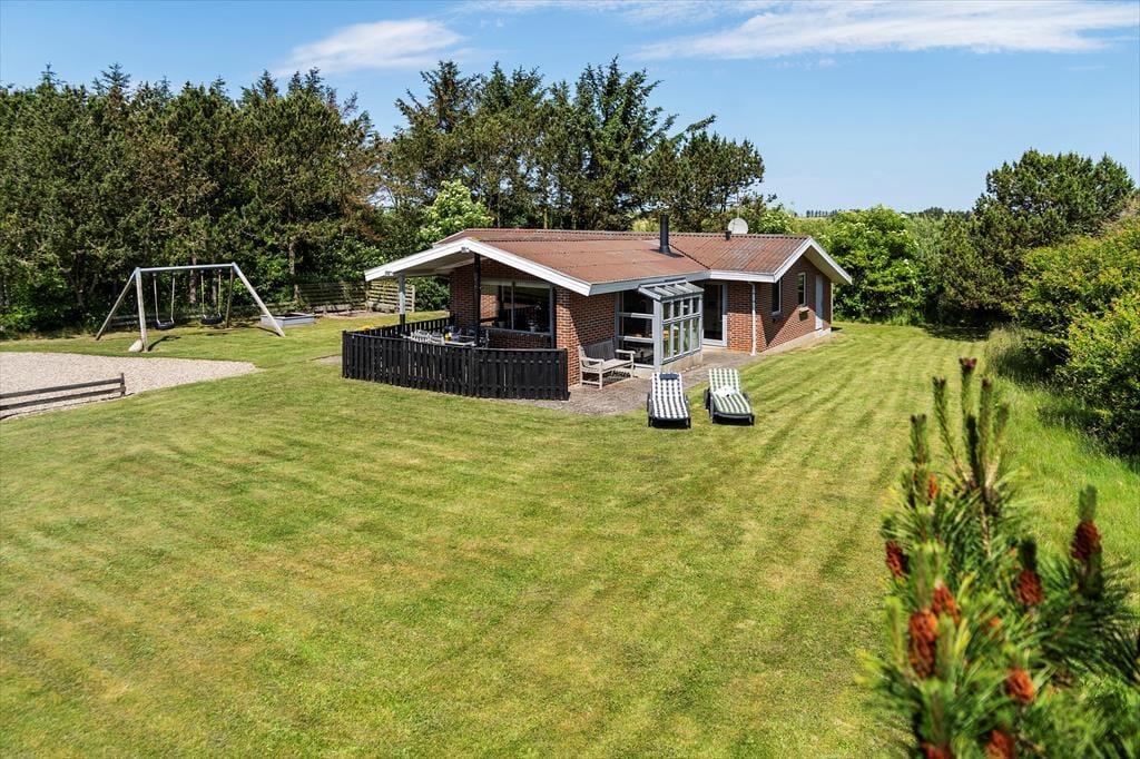Sommerhusgrunden er på 1500 m2, og den rammes smukt ind af tæt randbeplantning, der giver læ og skærmer af mod naboerne. Bilen kan holde i den grusbelagte indkørsel, og på græsplænen har I god plads til leg og boldspil. De yngste feriegæster har også gynge og sandkasse at hygge sig med, og hele familien kan se frem til at sole sig i havestolene på det delvist overdækkede terrassemiljø.