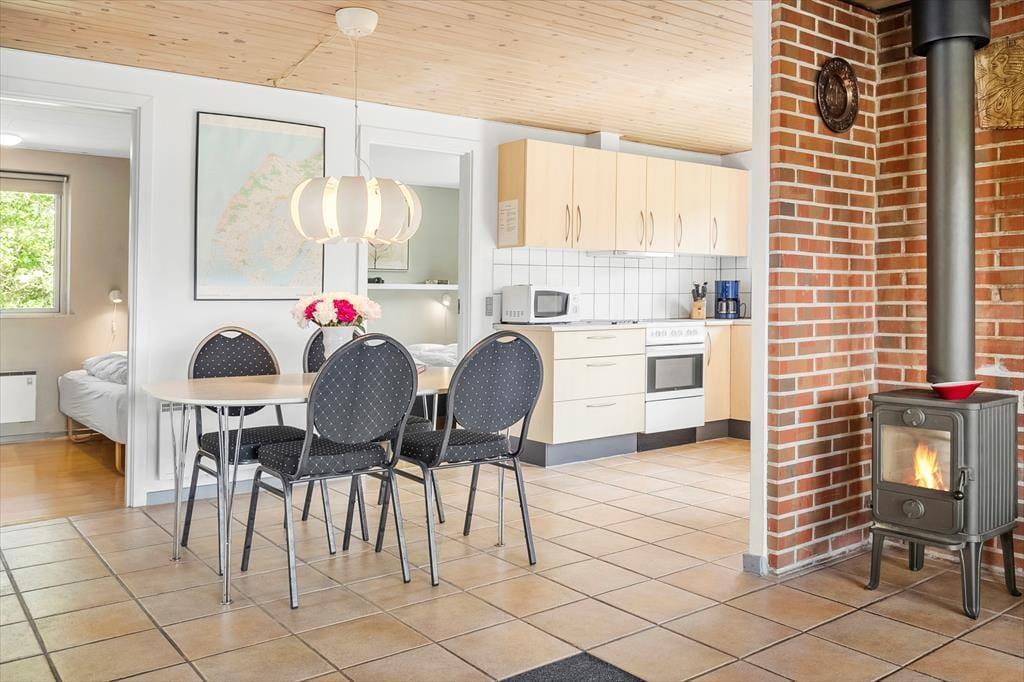 Når I ikke er nede ved stranden eller på udflugt i det flotte lokalområde, er det dejligt bare at tage den med ro i det 100 m2 store sommerhus. I stuen kan I sætte jer i en solstråle i glaskarnappen med en god kop kaffe, hvis I ikke hellere vil slænge jer i sofaafdelingen med en spændende film på fladskærmen nær brændeovnens varme. Hvis I kan lide at lave mad, kan I også bruge lang tid på at kræse om det næste måltid i det åbne køkken – og den kan også stå på wellness og fuldkommen afslapning i spabadet og saunaen på husets store badeværelse. Når feriedagen er ovre, kan I sige godnat, inden I går til ro på de tre gode soveværelser, der er indrettet med henholdsvis en dobbeltseng, en køjeseng og to enkeltsenge.