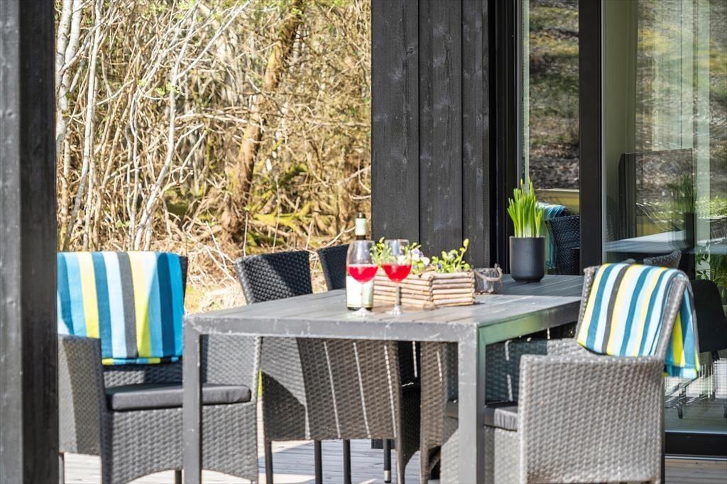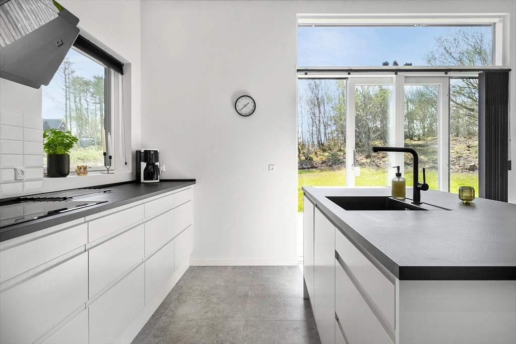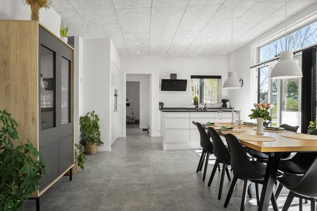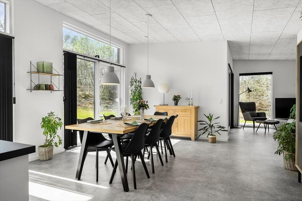 Når du træder ind i sommerhuset, bliver du mødt af en indbydende og lys atmosfære, hvor rummene hænger naturligt sammen. De moderne møbler og store vinduer skaber en åben og luftig følelse, og den varme indretning gør det behageligt at slappe af. Stuen er det perfekte sted at samles, om det er foran brændeovnen en kold aften eller med et brætspil i hænderne på en regnvejrsdag. Her er der plads til at nyde hinandens selskab, mens du kigger ud på den smukke natur. Huset rummer op til 6 personer, så det er ideelt til både familieferie og getaways med venner.