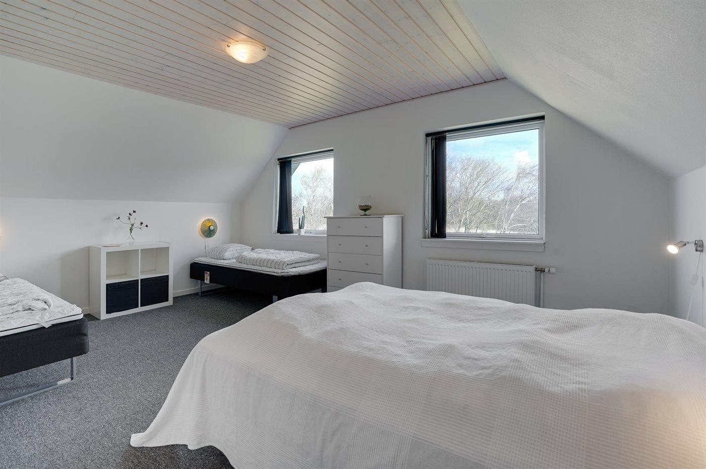 Der er i alt 10 soveværelser. Sovepladserne fordeler sig på: 8 sovepladser i dobbeltsenge. 17 sovepladser i enkeltsenge. Derudover er der 2 stk. barnesenge.