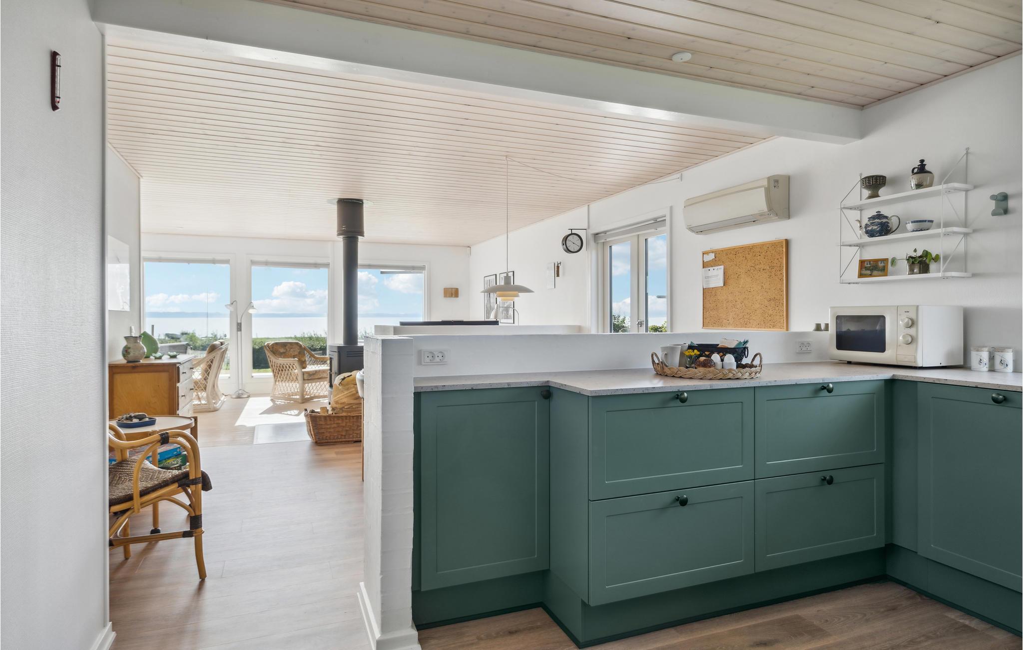 Velkommen til Helnæs og dette store energivenlige sommerhus, hvor I kan tilbringe nogle skønne dage i langsomt tempo. Læn jer tilbage i den hyggelige stue og nyd udsigten over grunden og vandet. Køkkenet er udstyret med flotte, moderne faciliteter, så det bliver en ren fornøjelse at hygge sig med madlavningen. I opholdsrummet er der et dejligt lys og stemningsfulde indretningsløsninger, så her får I gode rammer til måltiderne og de rolige aftener på sofaen. Mens børnene hopper på trampolin eller spiller fodbold, kan I sætte jer med en god bog eller lave strækøvelser på terrassen. De lune dage slutter med grillmad og den fantastiske udsigt over bugten.
