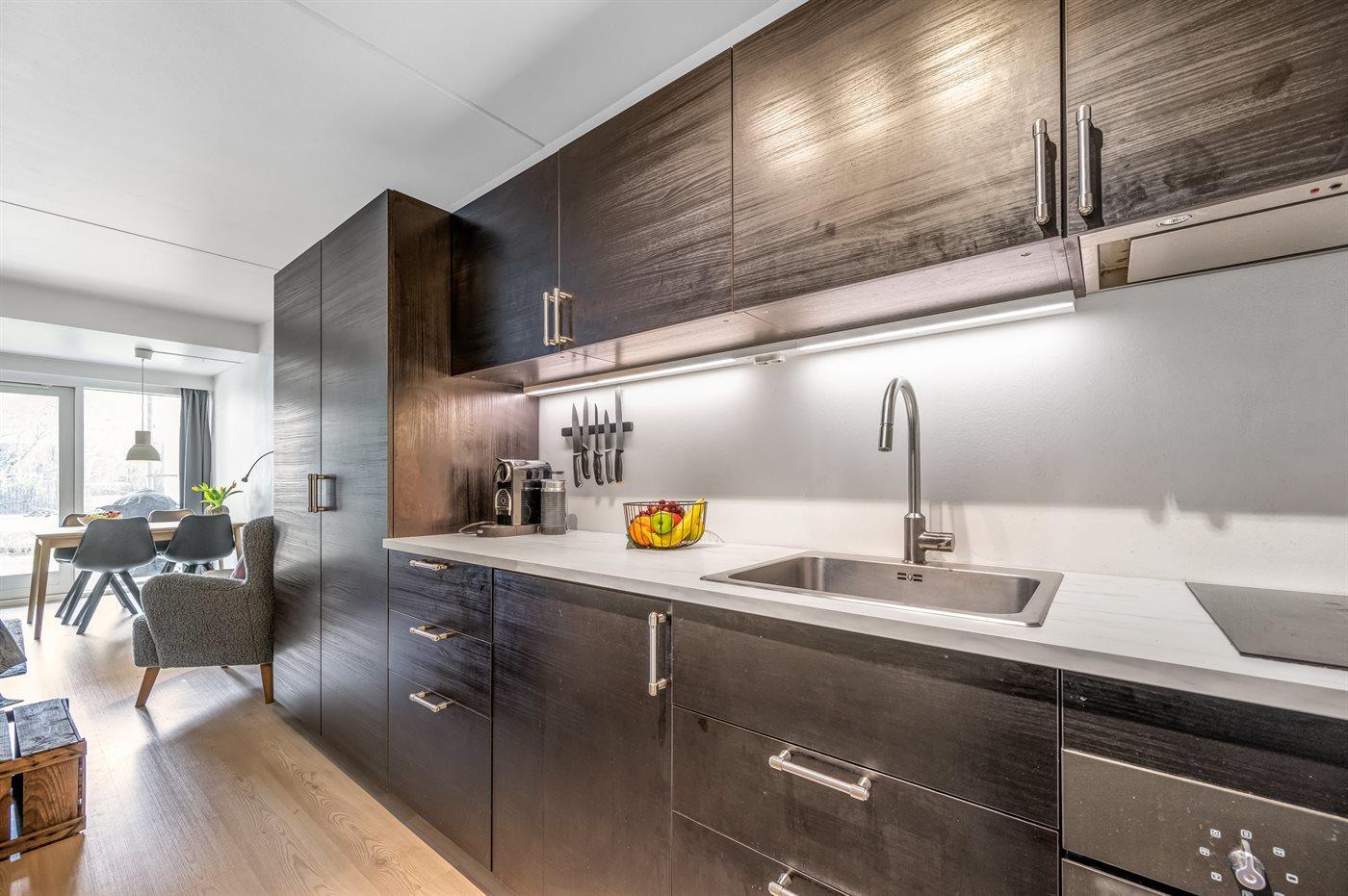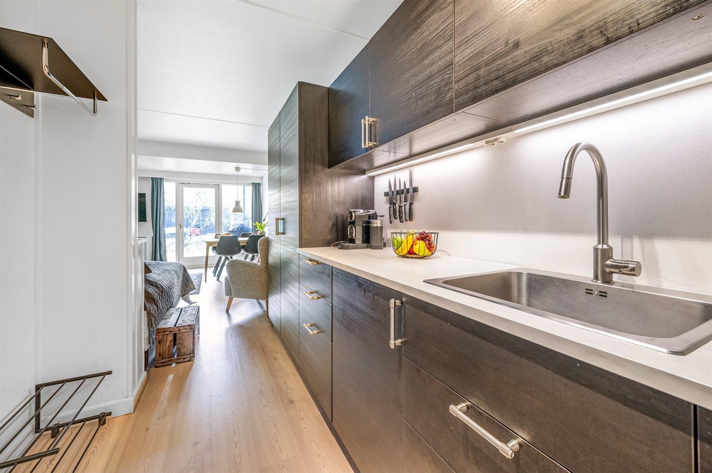 Køkkenet er udstyret med 1 køleskab. Der er 2 keramiske kogeplader, varmluftovn.