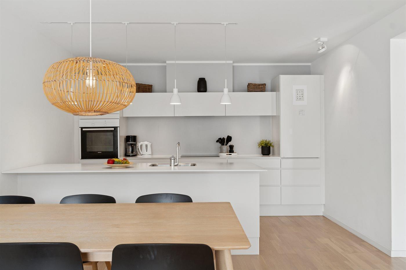 Køkkenet er udstyret med 1 køleskab. Der er 4 keramiske kogeplader, varmluftovn samt opvaskemaskine.