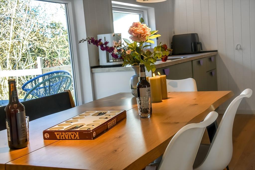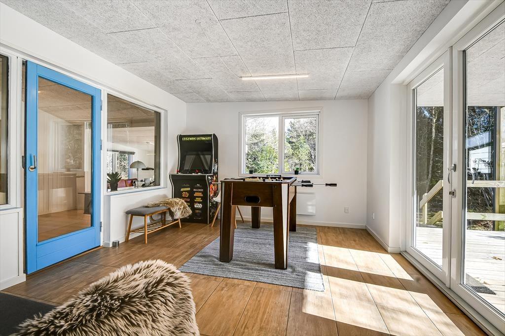Det lyse sommerhus er med sine 161 m2 dejligt stort og rummeligt, og med tre soveværelser og to badeværelser passer planløsningen perfekt til seks personer. Efter seneste renovering fremstår alle rum lyse og indbydende, og ikke mindst opholdsmiljøet er et herligt sted at samles: Her ligger køkken-alrum og stue i åben forbindelse, blot adskilt af et par trin, så det er nemt at bære eftermiddagskaffen hen til sofaafdelingen, hvis I vil drikke den i nærheden af brændeovnen. Hvis I ikke kan sidde stille, kan I rykke ind i aktivitetsrummet for at spille bordfodbold eller dyste i arkadespil – når ikke I hellere vil plaske, svømme og lege i sommerhusets dejlige swimmingpool.