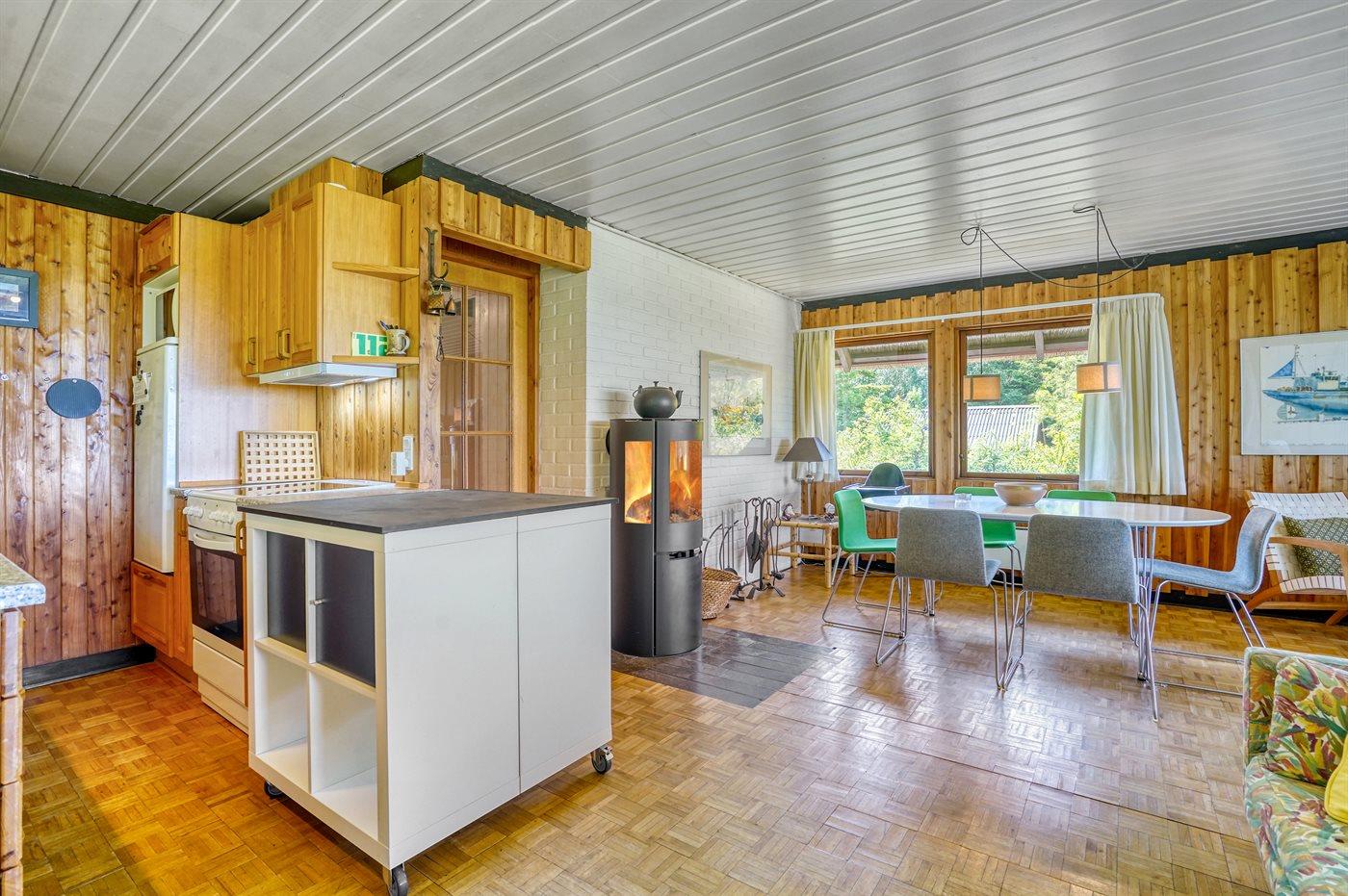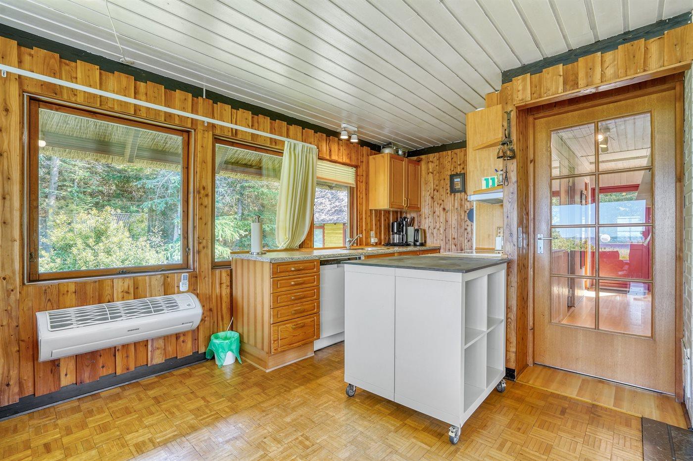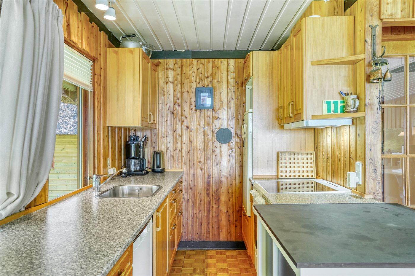 Køkkenet er udstyret med 1 køleskab. Der er 4 keramiske kogeplader, bageovn, mikrobølgeovn samt opvaskemaskine.