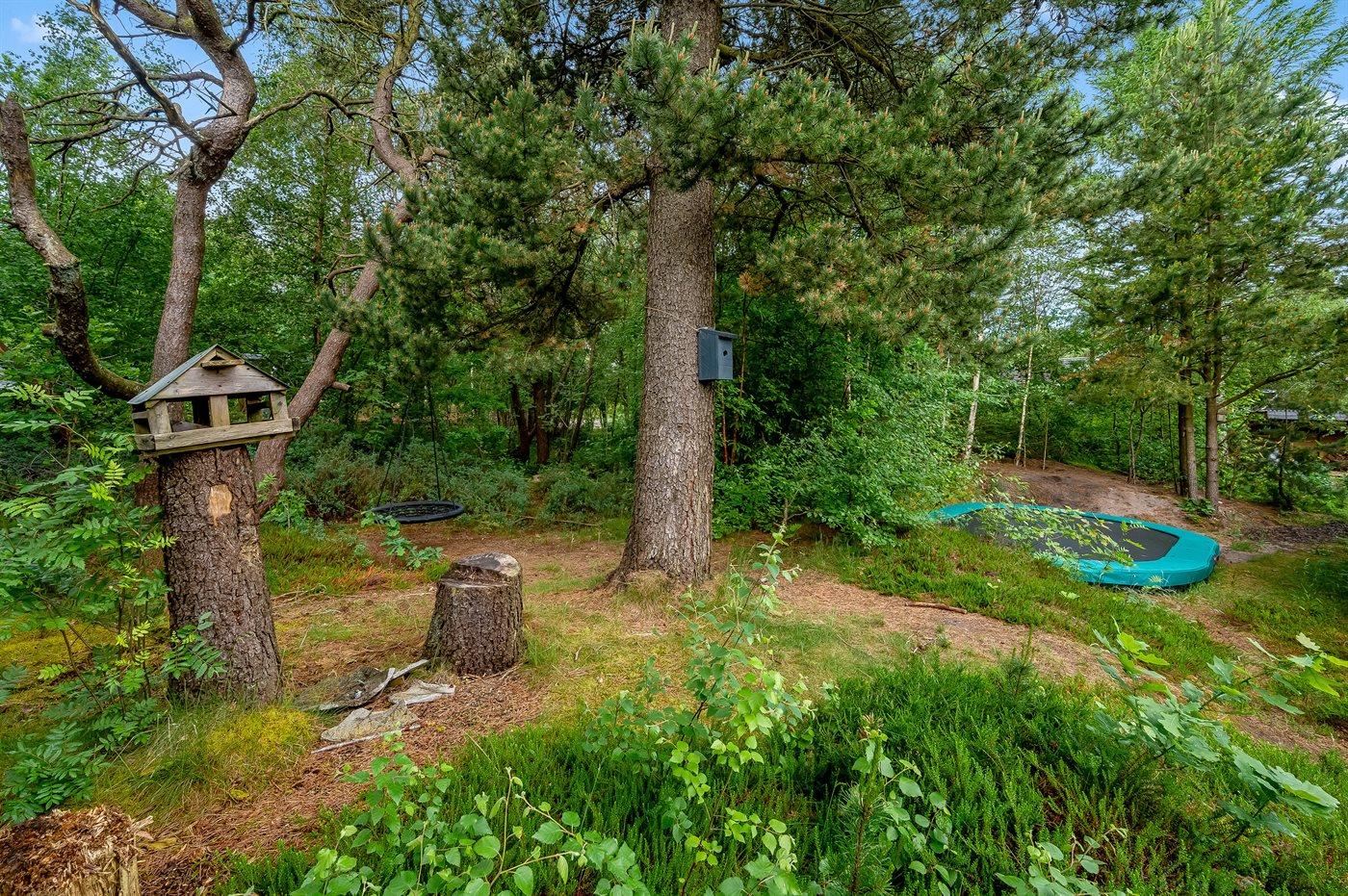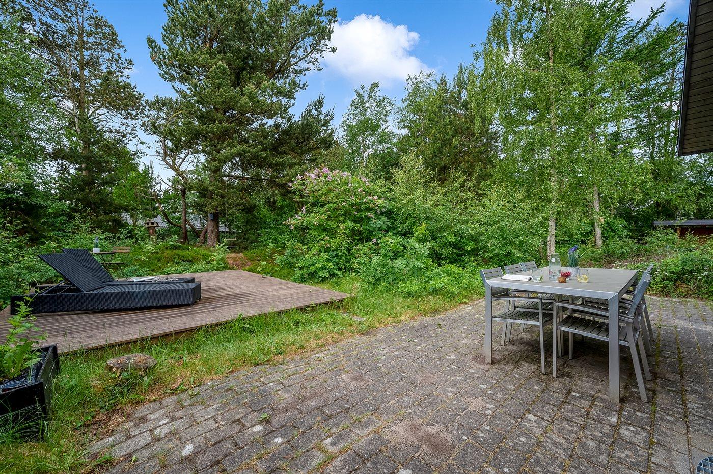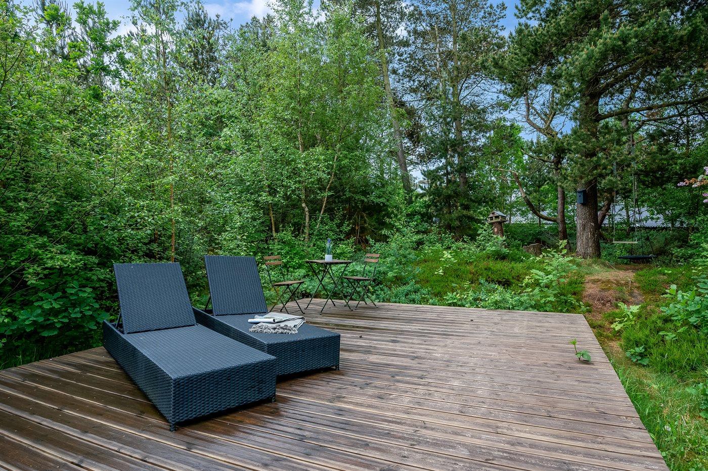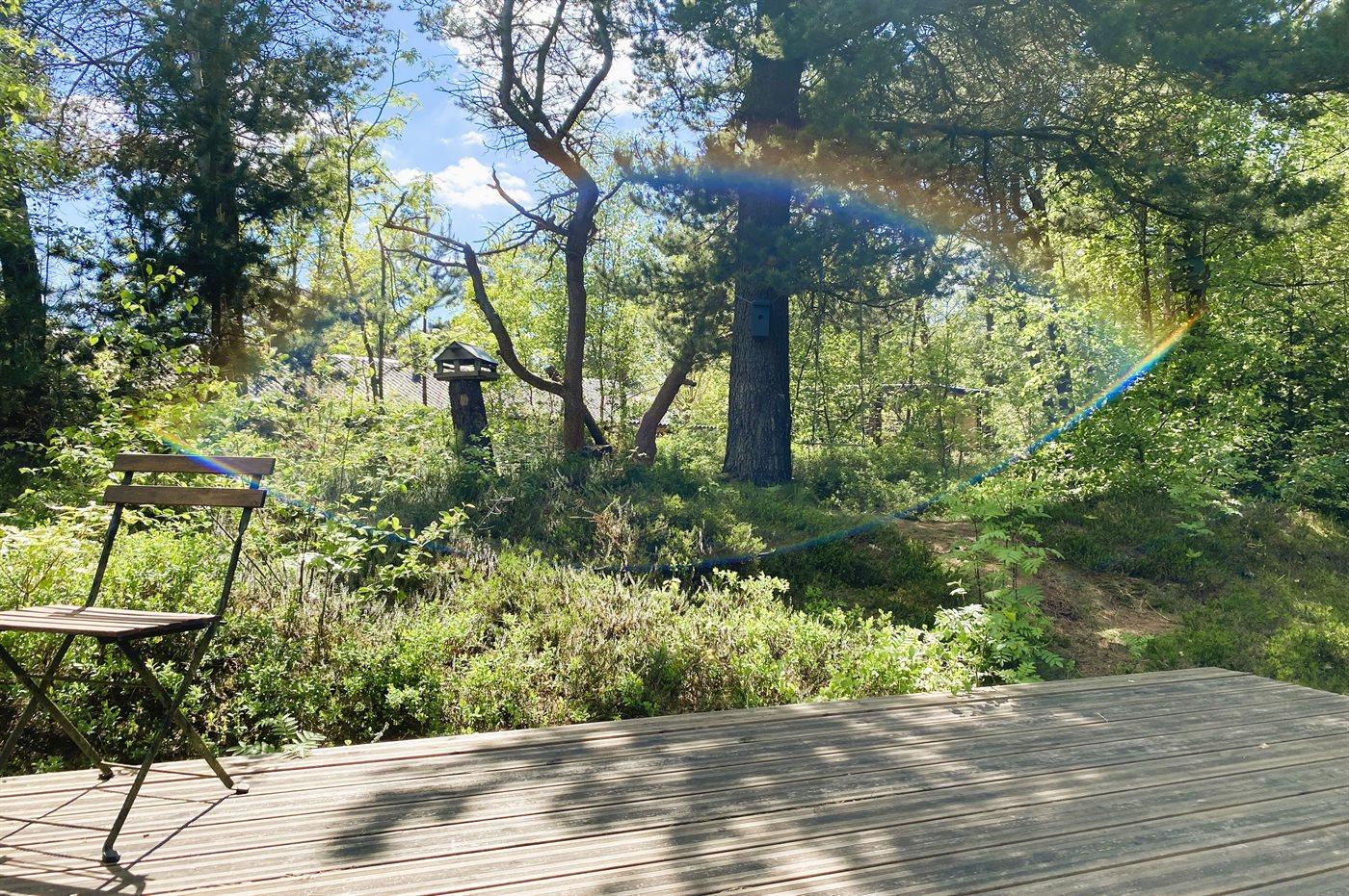 Indenfor byder sommerhuset på både spa og sauna, og i stuen er der store panoramavinduer ud mod skoven. Her kan du sidde og slappe af i sofaen, mens du følger med i fuglelivet. Der kommer meget ofte egern og harer forbi og hilser på. Udenfor skaber grundens mange træer en helt speciel stemning. På de store terrasser giver beplantningen læ, og der er rig mulighed for at nyde solen fra morgen til aften. På grunden findes der også en trampolin, hvor børn og barnlige sjæle kan tilbringe mange hyggelige timer.