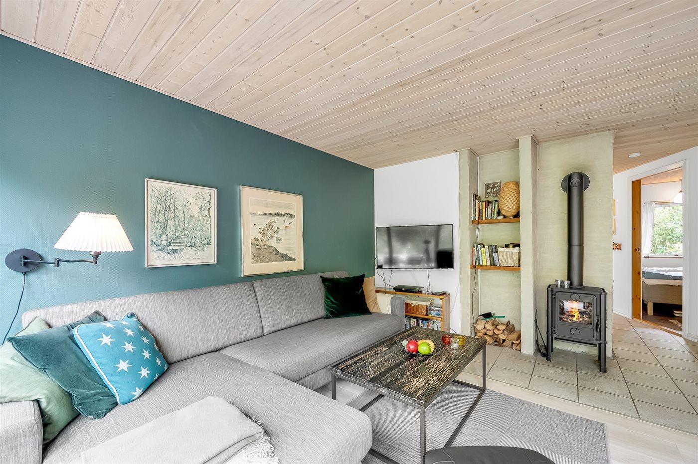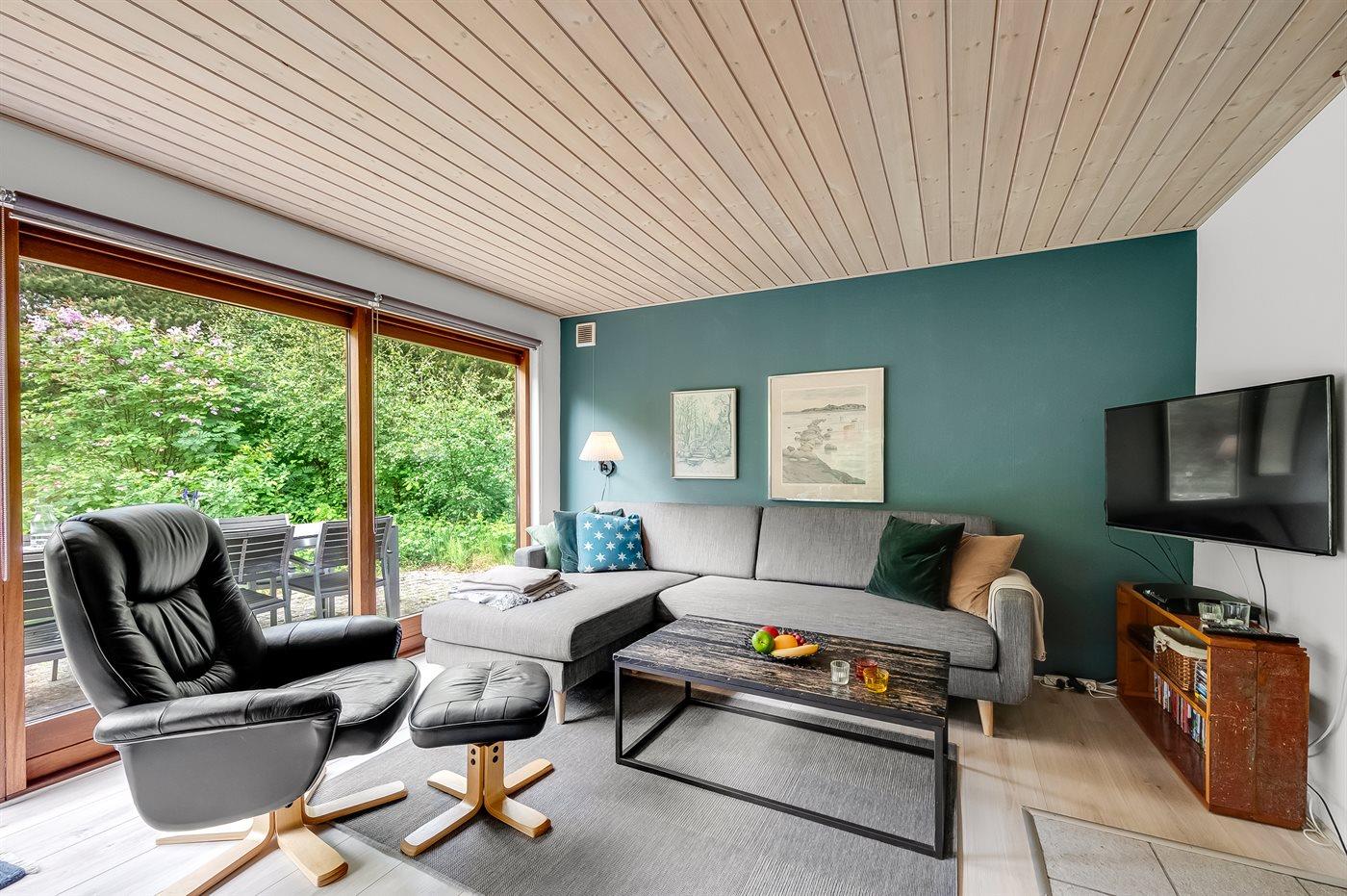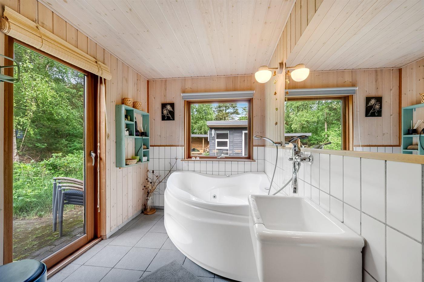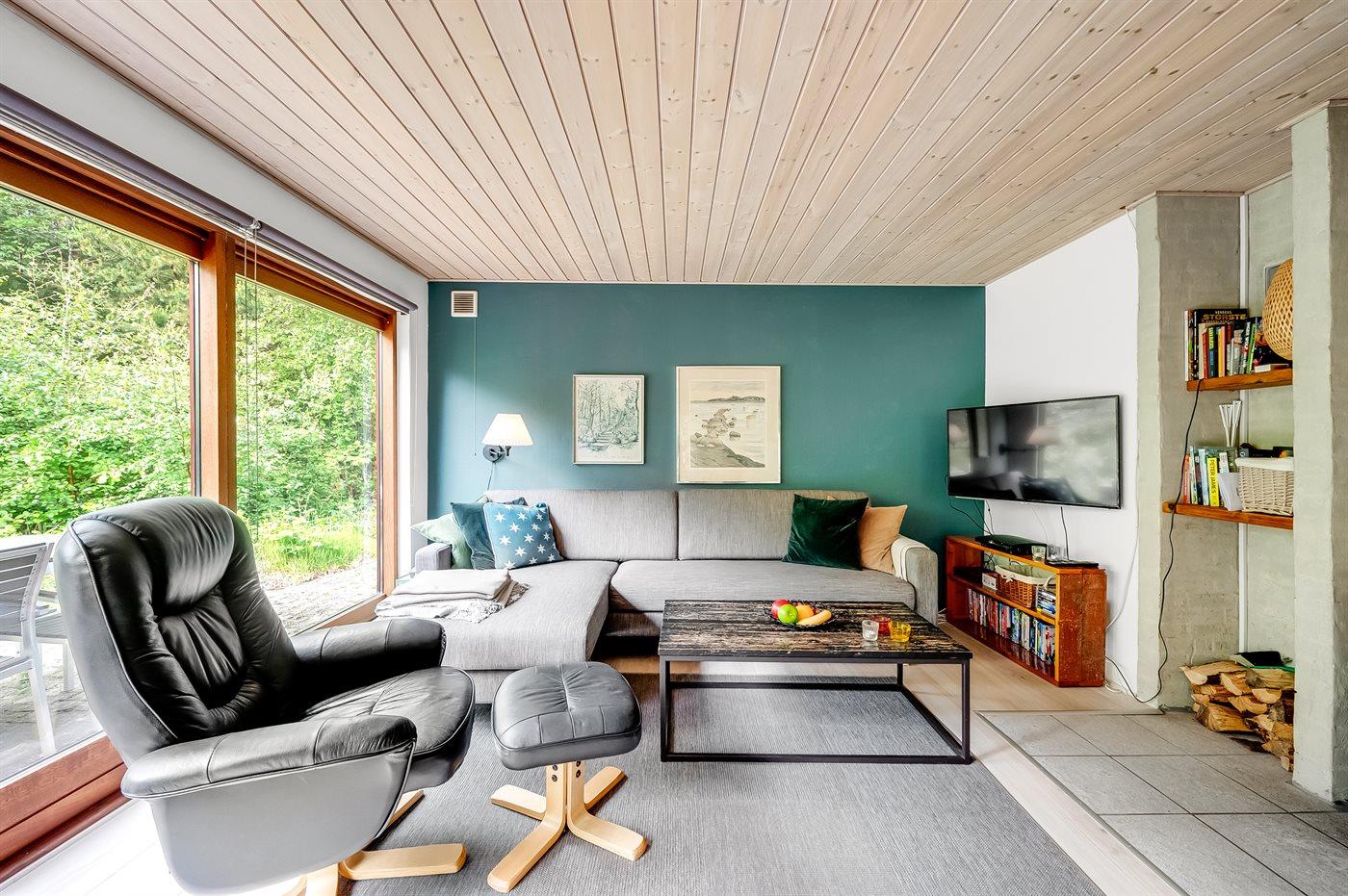 Indenfor byder sommerhuset på både spa og sauna, og i stuen er der store panoramavinduer ud mod skoven. Her kan du sidde og slappe af i sofaen, mens du følger med i fuglelivet. Der kommer meget ofte egern og harer forbi og hilser på. Udenfor skaber grundens mange træer en helt speciel stemning. På de store terrasser giver beplantningen læ, og der er rig mulighed for at nyde solen fra morgen til aften. På grunden findes der også en trampolin, hvor børn og barnlige sjæle kan tilbringe mange hyggelige timer.