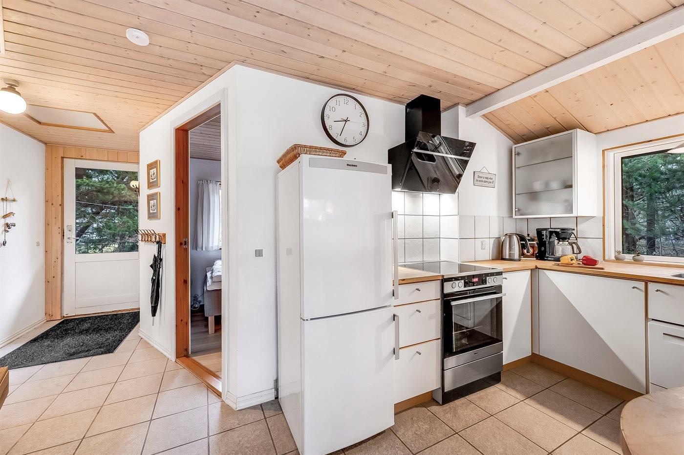 Køkkenet er udstyret med 1 køleskab. Der er 4 keramiske kogeplader, varmluftovn, mikrobølgeovn samt opvaskemaskine.