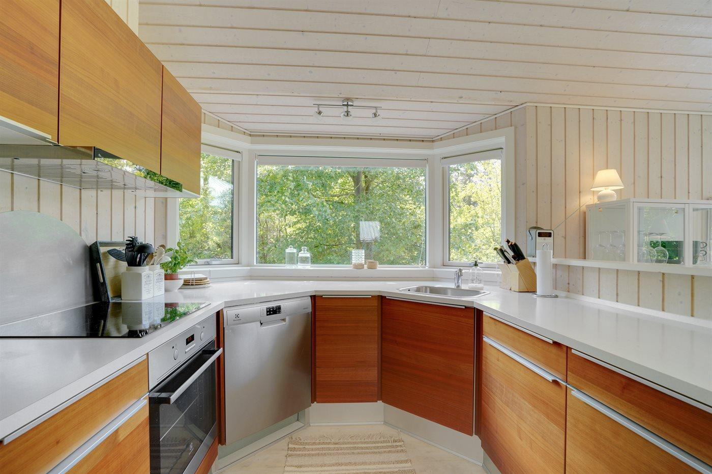Køkkenet er udstyret med 1 køleskab. Der er 4 keramiske kogeplader, varmluftovn, mikrobølgeovn samt opvaskemaskine.