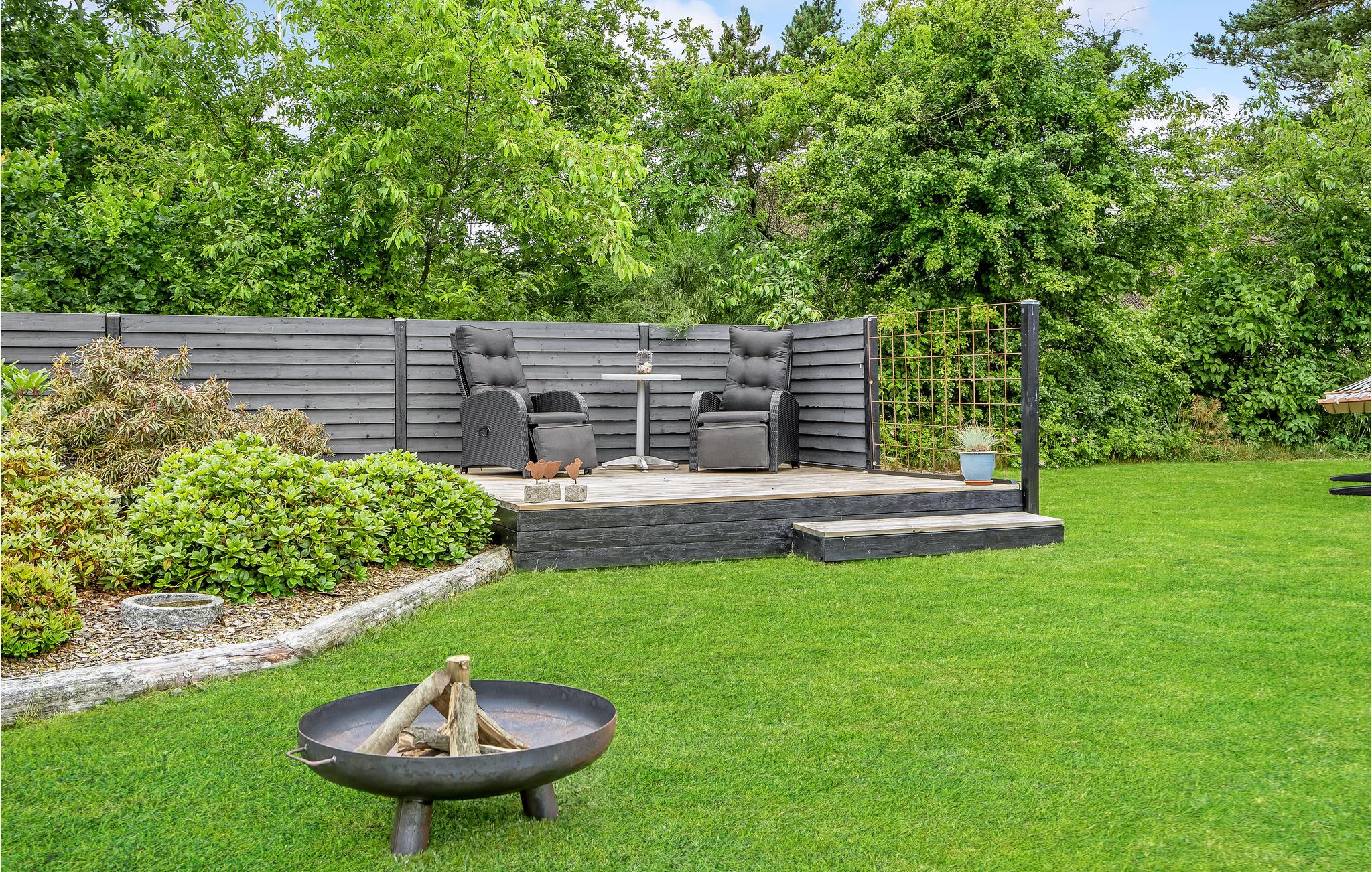Ved huset er der en træterrasse og en fliseterrasse med bålfad, hvor I kan varme jer om aftenen og bage snobrød. I kan også tænde op i vildmarksbadet og nyde de lyse aftener i det varme vand.