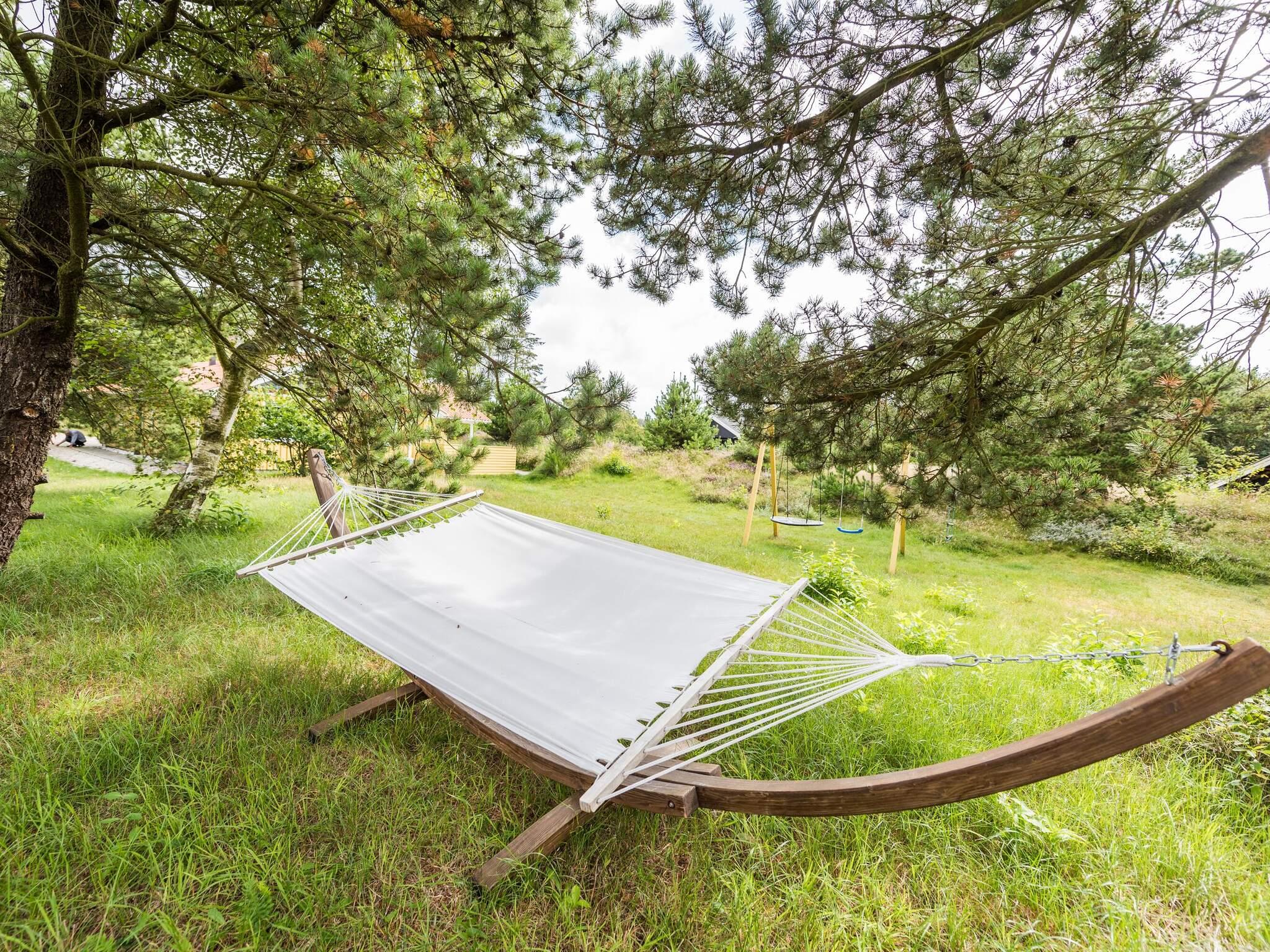 Udenfor åbner sommerhuset sig op mod en skøn, delvist overdækket terrasse, hvor du kan nyde solrige morgener med kaffe i hånden og lange sommeraftener med grill og god vin. Børnene vil elske at boltre sig med de tilhørende legeredskaber, mens de voksne kan finde fred i de grønne omgivelser - en lille naturpark helt for jer selv.