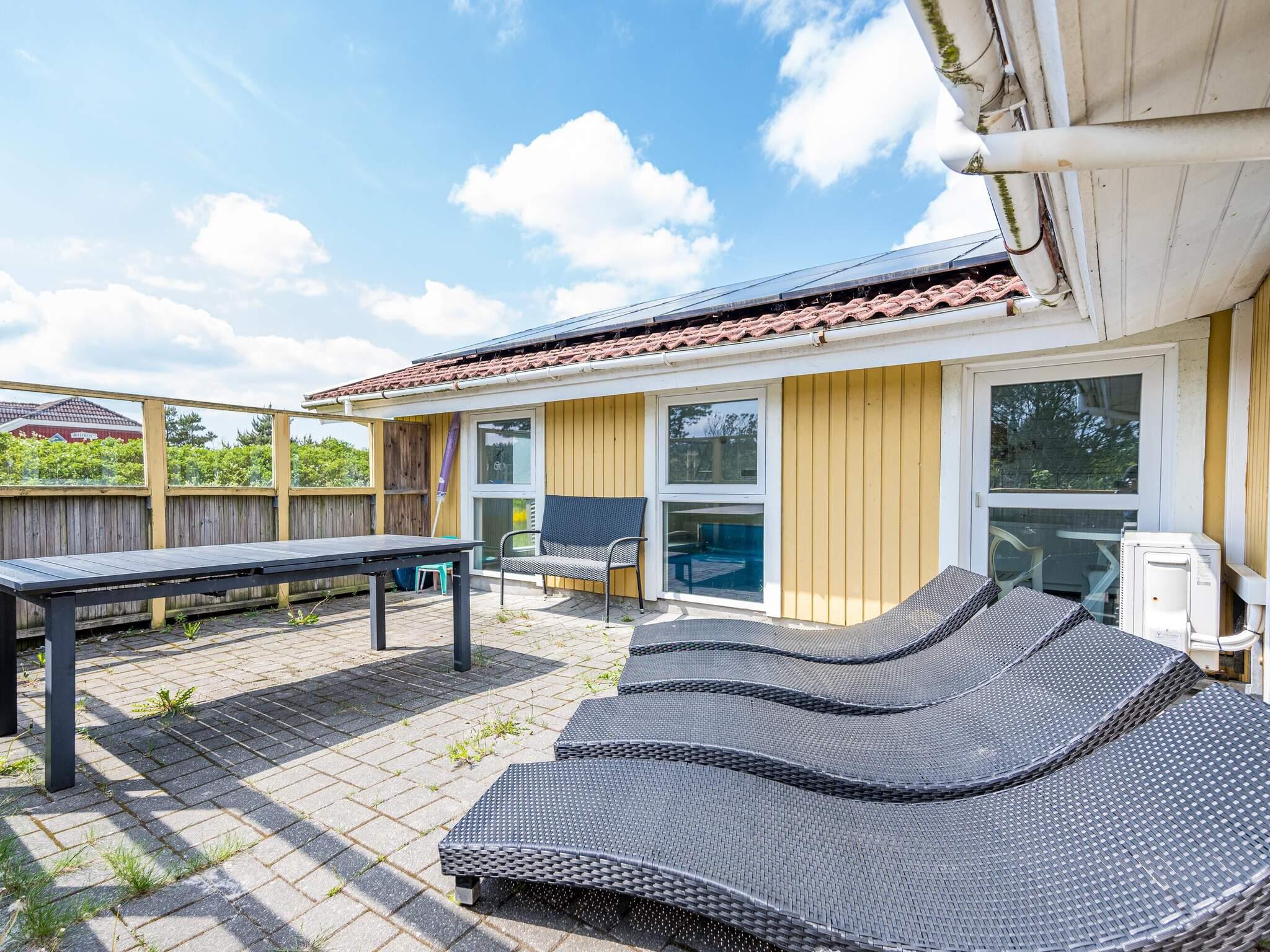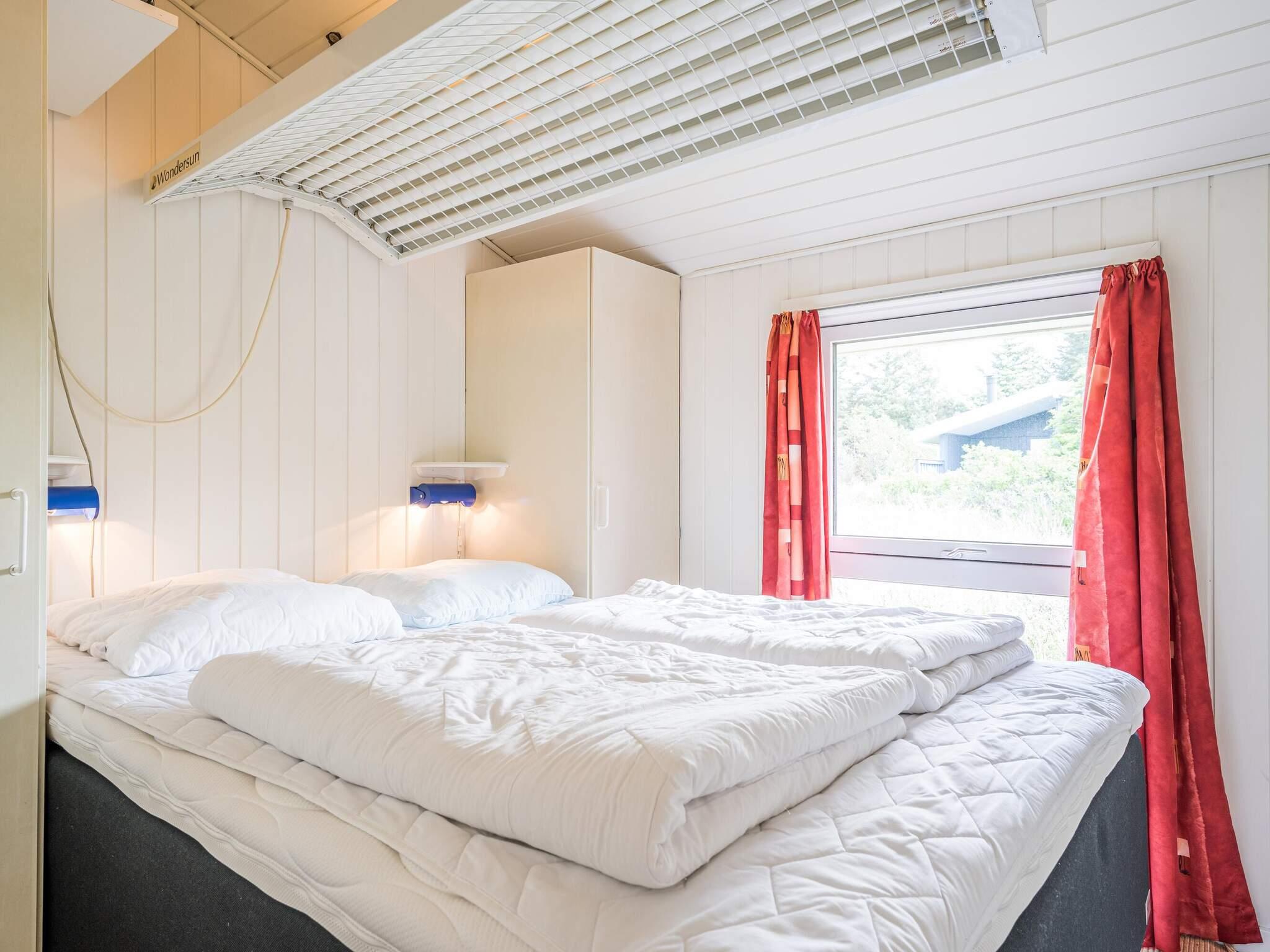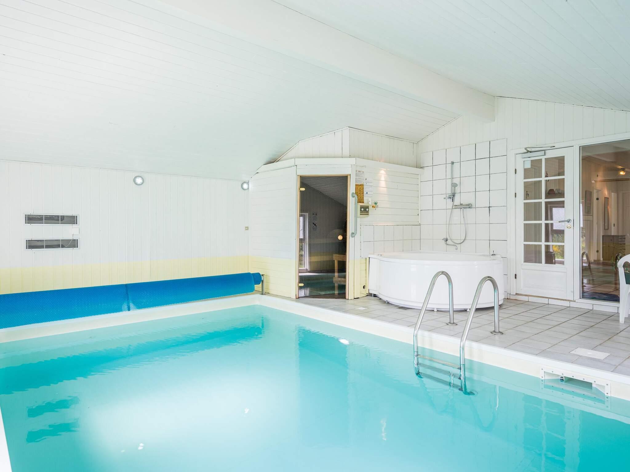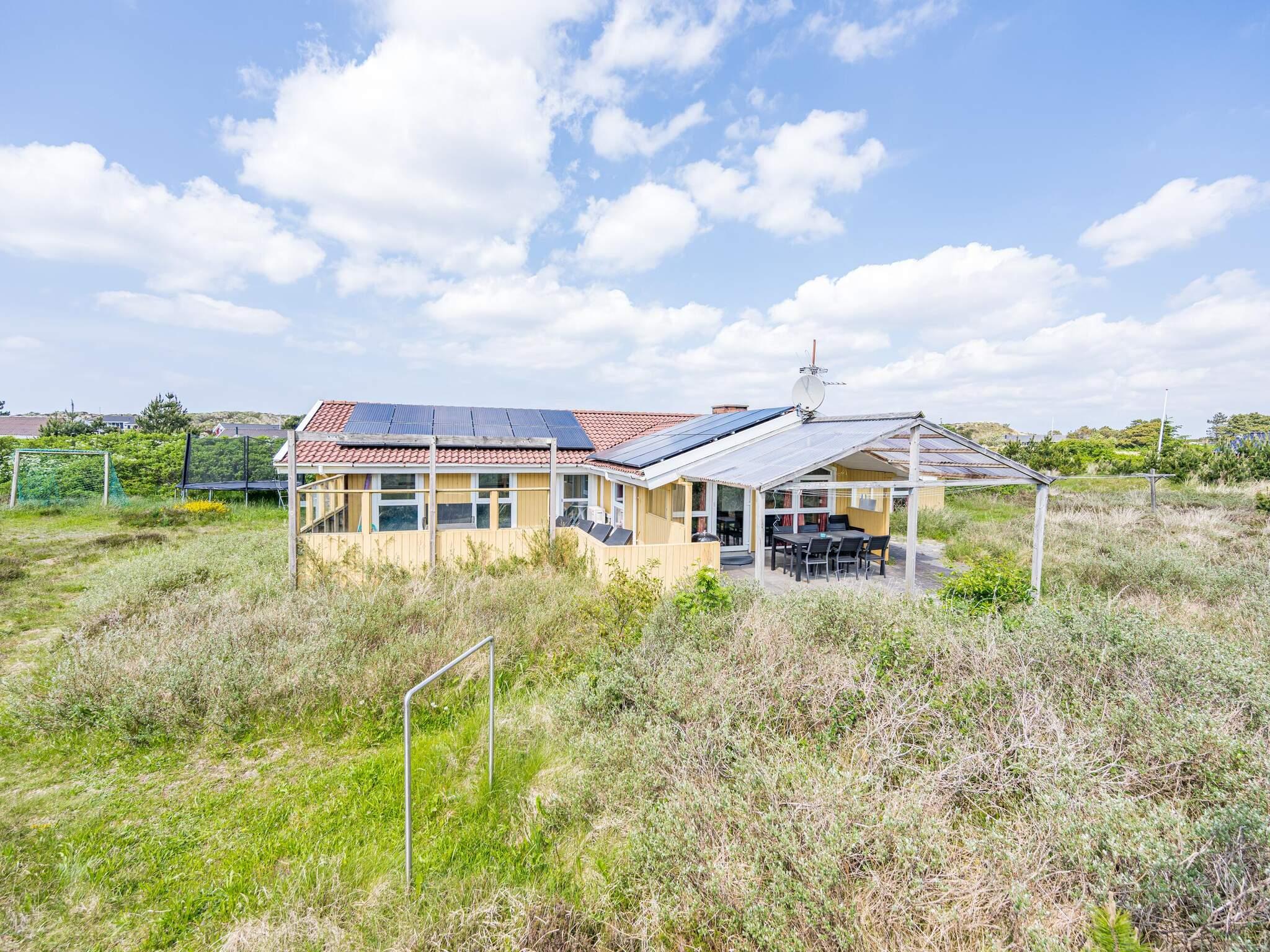 På en herlig naturgrund lige op ad fredet hedeområde ligger dette dejlige "oplevelseshus". Indendøre lokker stort poolrum, spabad og Henne Strands måske største sauna. Udendørsaktiviteterne omfatter gynger, en trampolin og en lille fodboldbane. Er du til mere rolige adspredelser, kan du nyde udsigten mod syd over det fredede hedeområde, som går ned til Henne-mølle å - til tider kan du opleve rådyr, og de morgenfriske kan til tider være heldige at se krondyr fra sommerhuset. Der er 4 værelser med boksmadrasser, et stort badeværelse med vaskemaskine og tørretumbler samt et ekstra badeværelse. Køkkenet er i åben forbindelse med spiseafdeling og stue hvorfra aktiviteterne i poolrummet kan iagttages. Fra stuen er der adgang til den 25 m2 store ovedækkede terrasse, og herfra igen er der adgang til den store lukkede terrasse. Både sommerhuset og poolen bliver opvarmet med varmepumpe. Et rigtig skønt sommerhus med pool i Henne Strand ved Vestkysten! Gratis slutrengøring!
