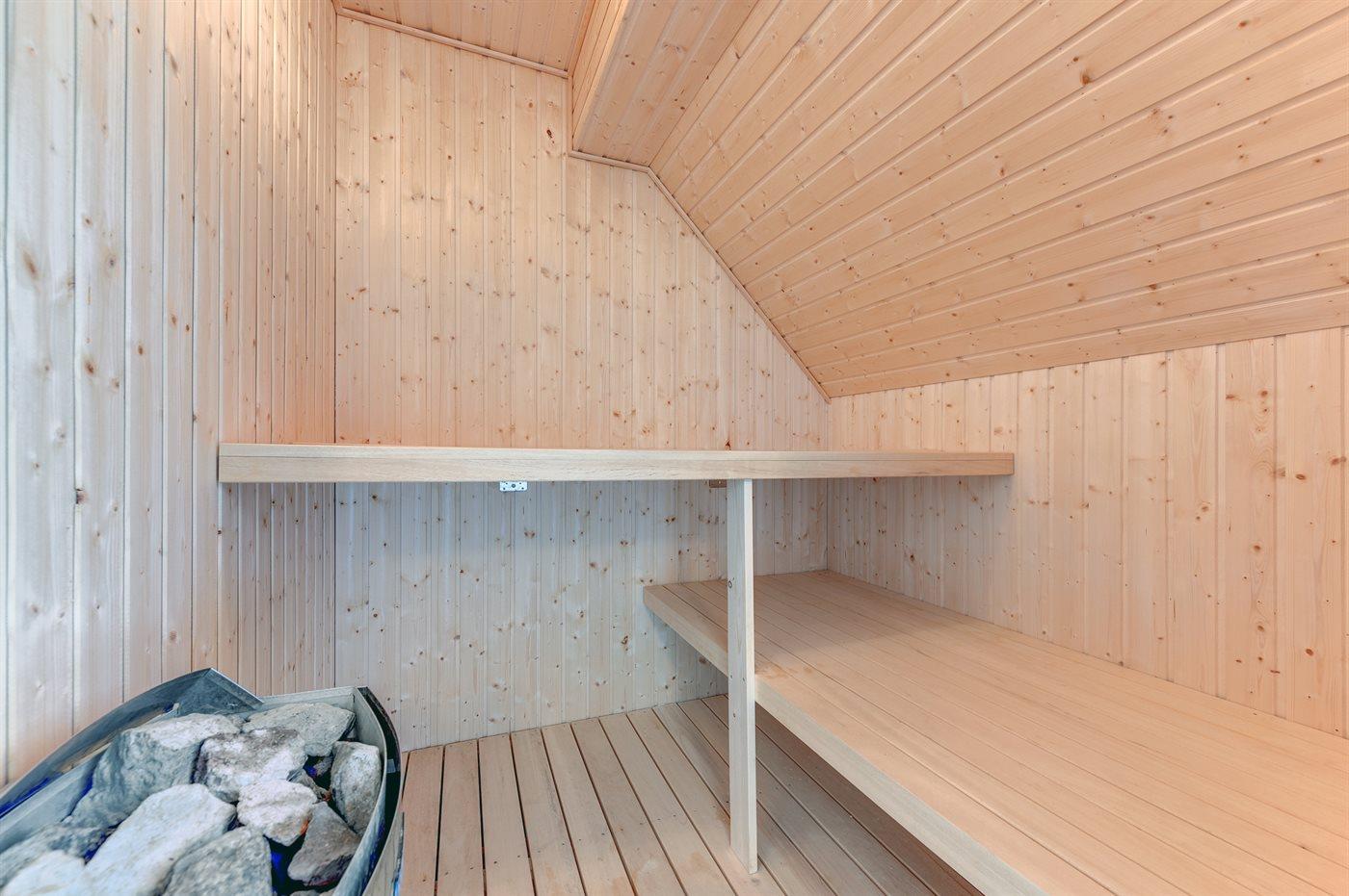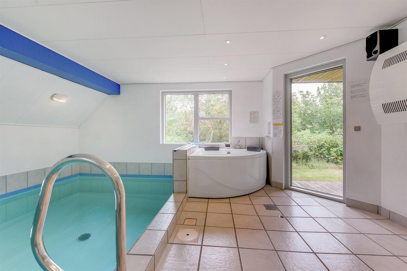 I stueetagen findes swimmingpool-afdeling med swimmingpool (5 x 3 x 1,45 m), 2-pers. spa og et stort badeværelse med opvarmet klinkegulv, bruseniche, vaskemaskine og tørretumbler. Fra badeværelset er der direkte adgang til husets sauna. Desuden er der et ekstra badeværelse, ligeledes med gulvvarme og bruseniche.