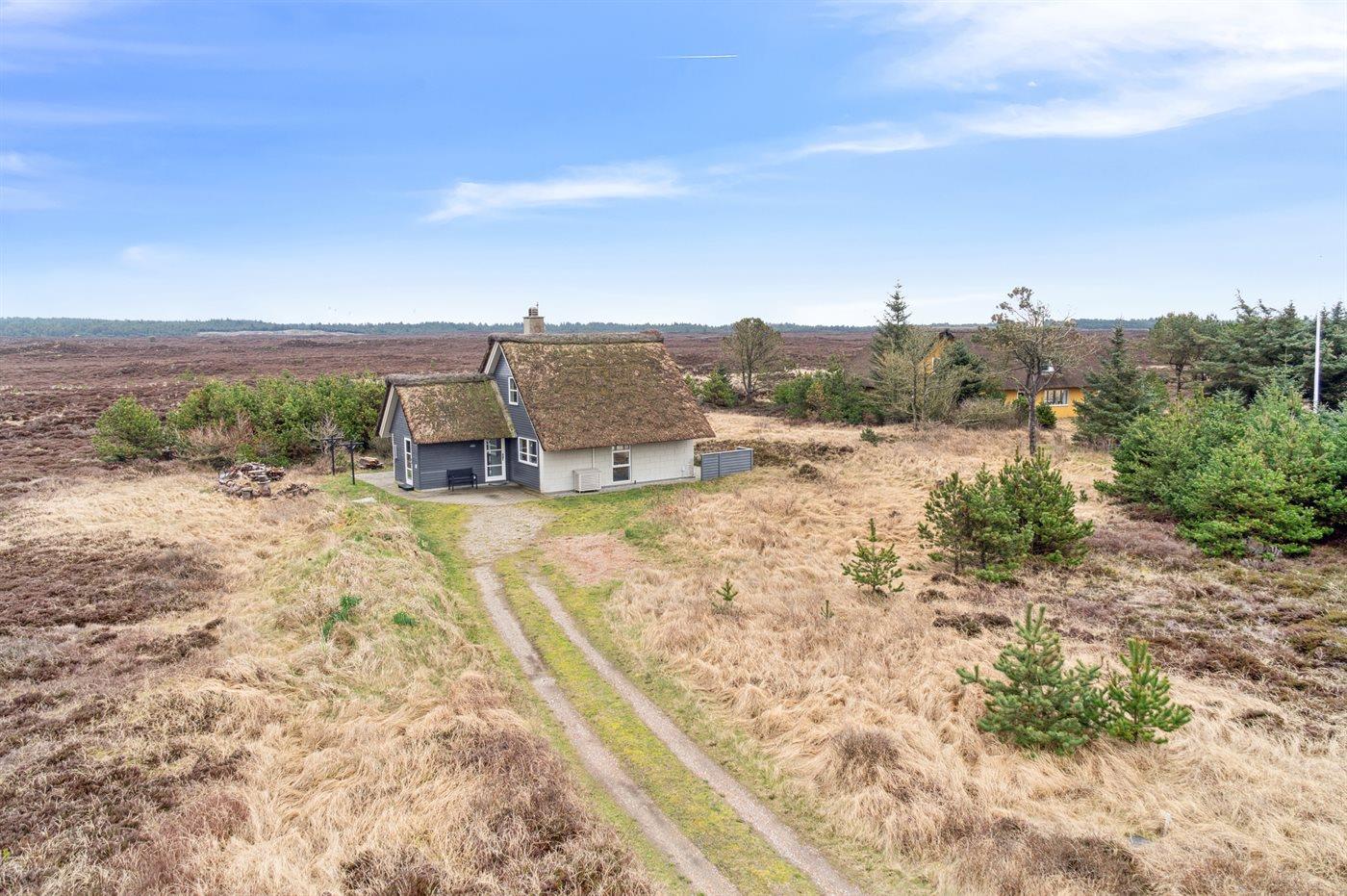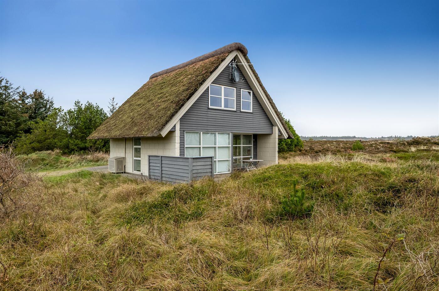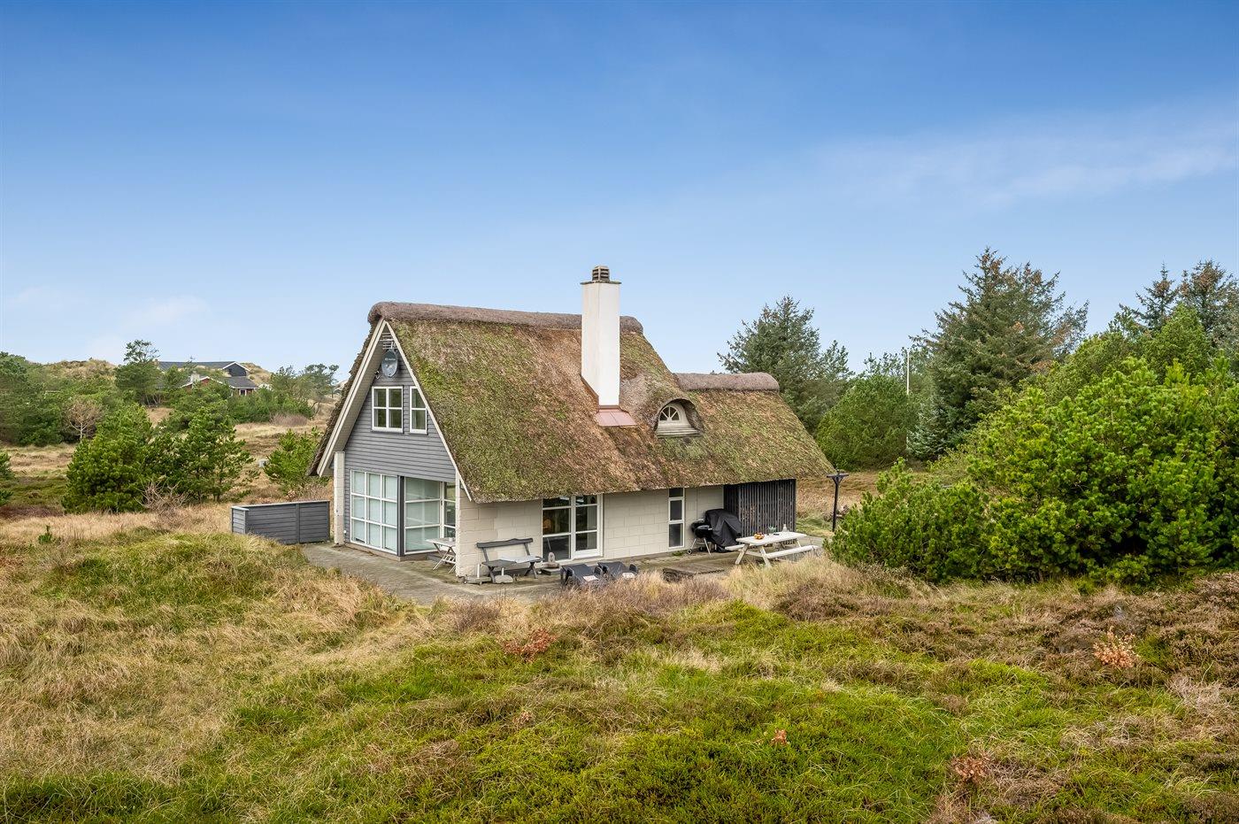 Charmerende og lyst sommerhus med stråtag nær Henne Strand omgivet af natur.