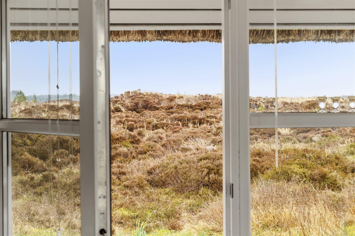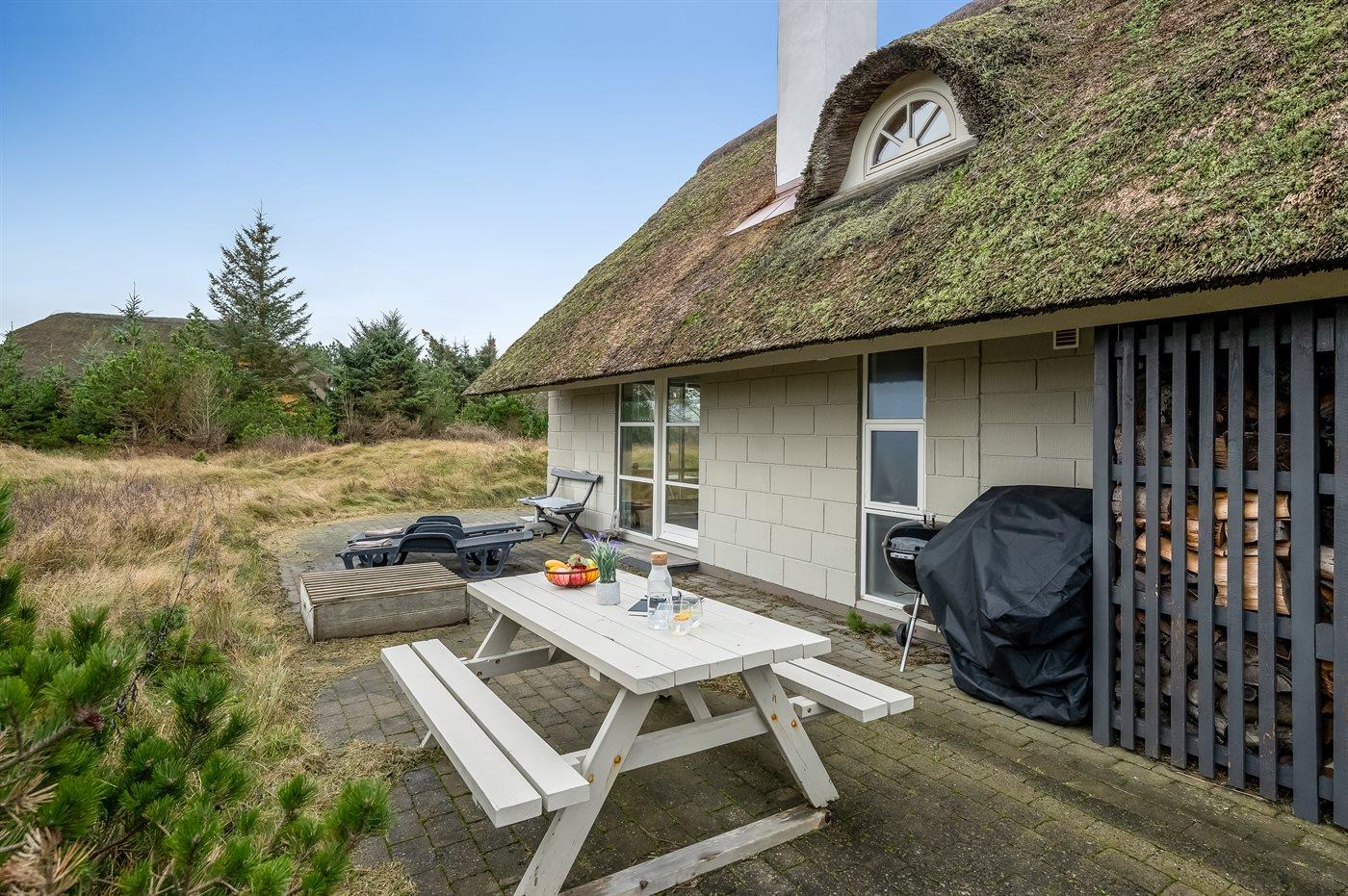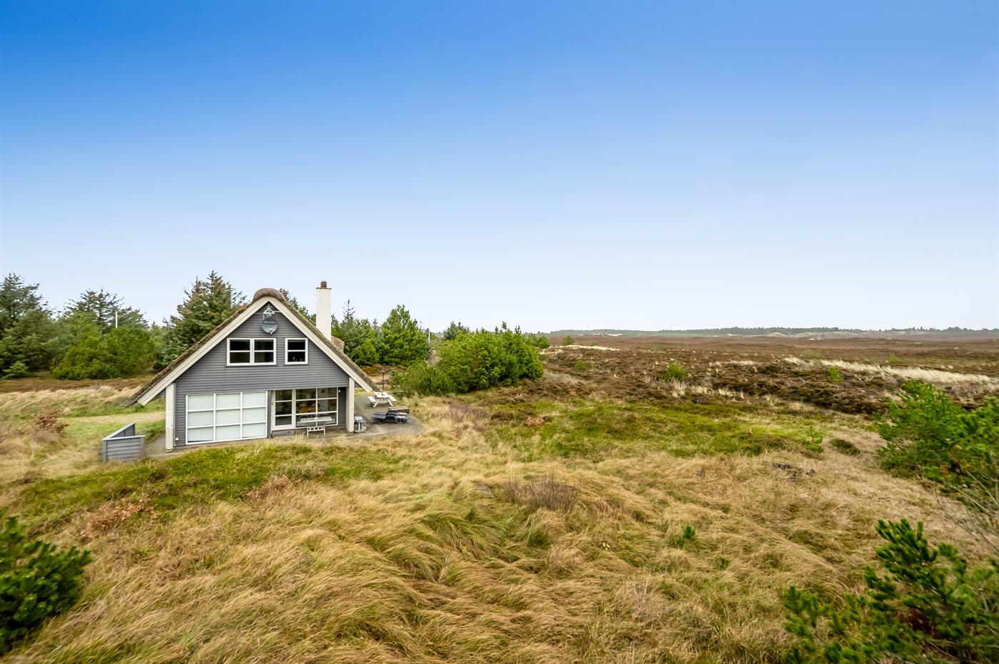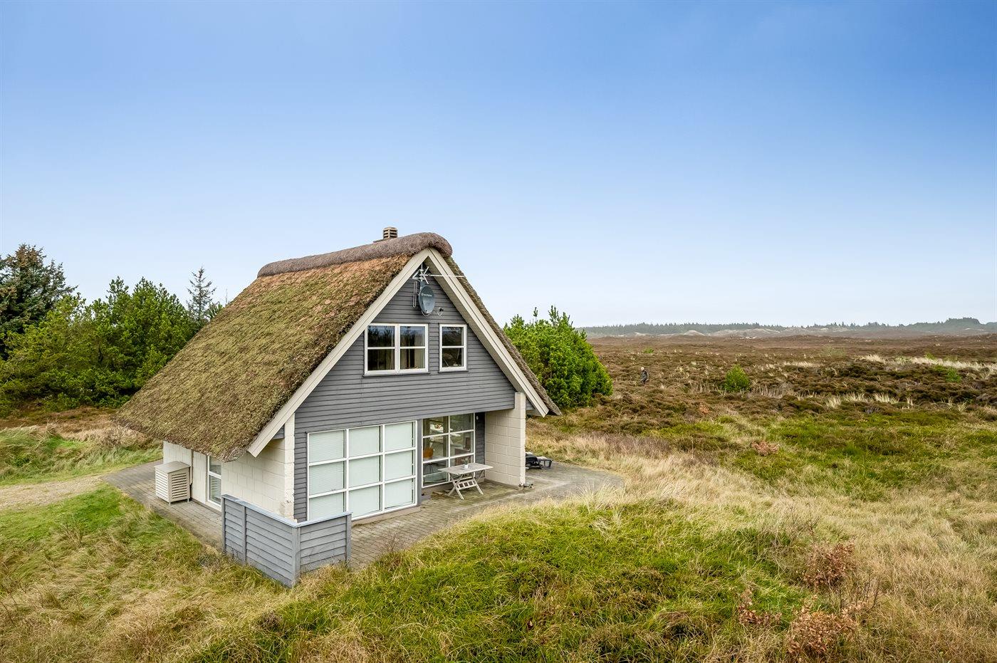 Charmerende og lyst sommerhus med stråtag nær Henne Strand omgivet af natur.