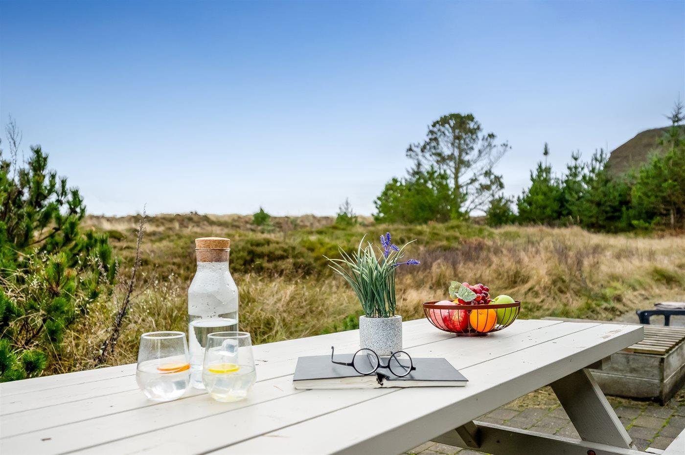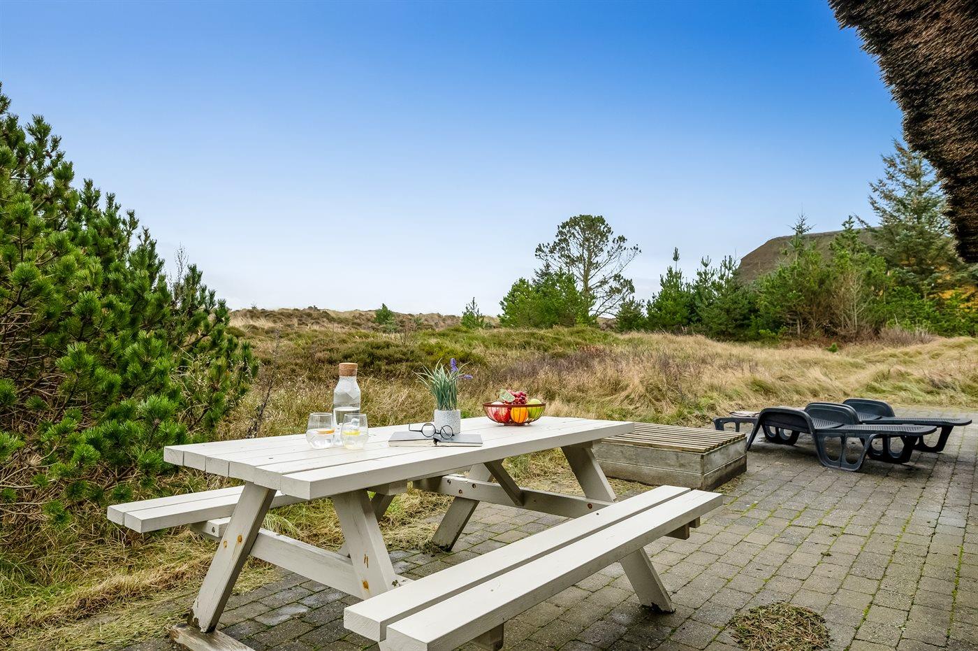 Fra huset er der direkte adgang til både åben og overdækket terrasse med havemøbler – ideelle steder at nyde morgenkaffen, solrige eftermiddage eller aftener i læ og stilhed. Den 2.000 m² store naturgrund giver god plads til udeliv og afslapning, og til børnene er der en sandkasse.