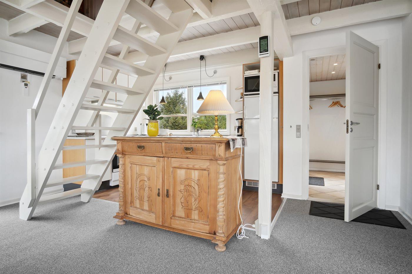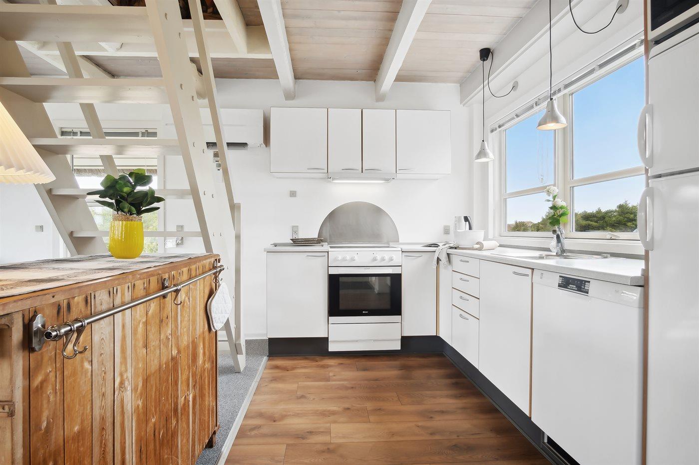 Køkkenet er udstyret med 1 køleskab. Der er 4 elkogeplader, varmluftovn, mikrobølgeovn samt opvaskemaskine.
