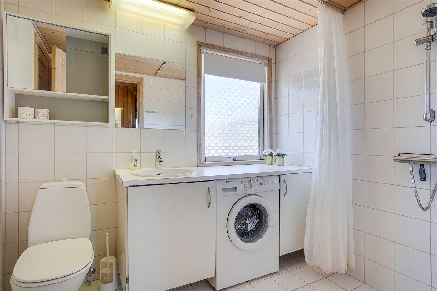 Der er 1 badeværelse med bruser og 1 toilet.. Der er gulvvarme på 1 badeværelse. I saunaen er der mulighed for afslapning.