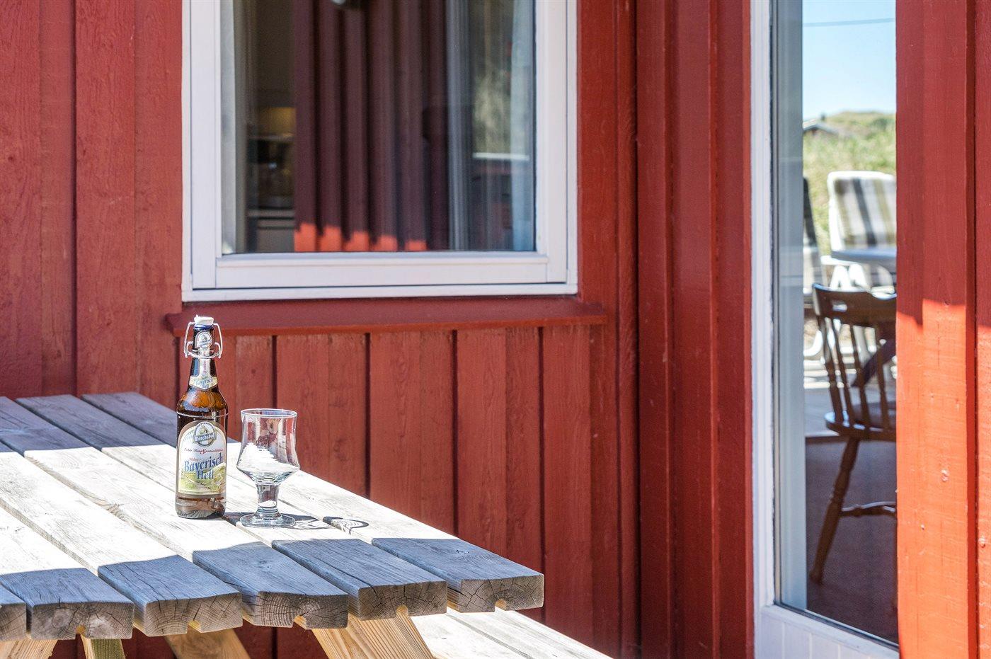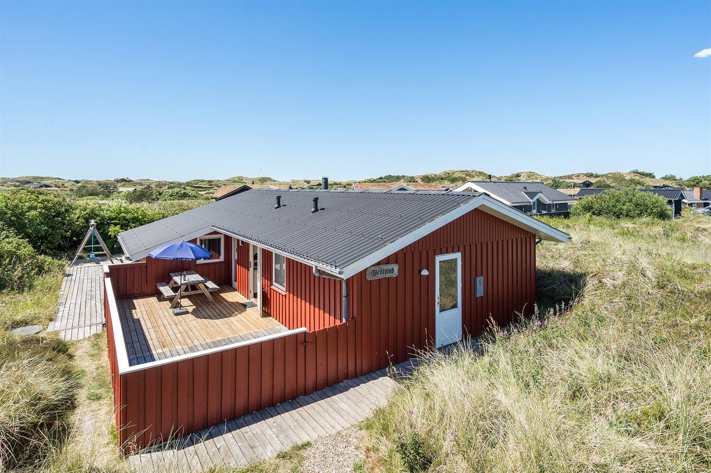 Hyggeligt sommerhus i Henne med sauna, brændeovn og stor terrasse, tæt på natur og strand.