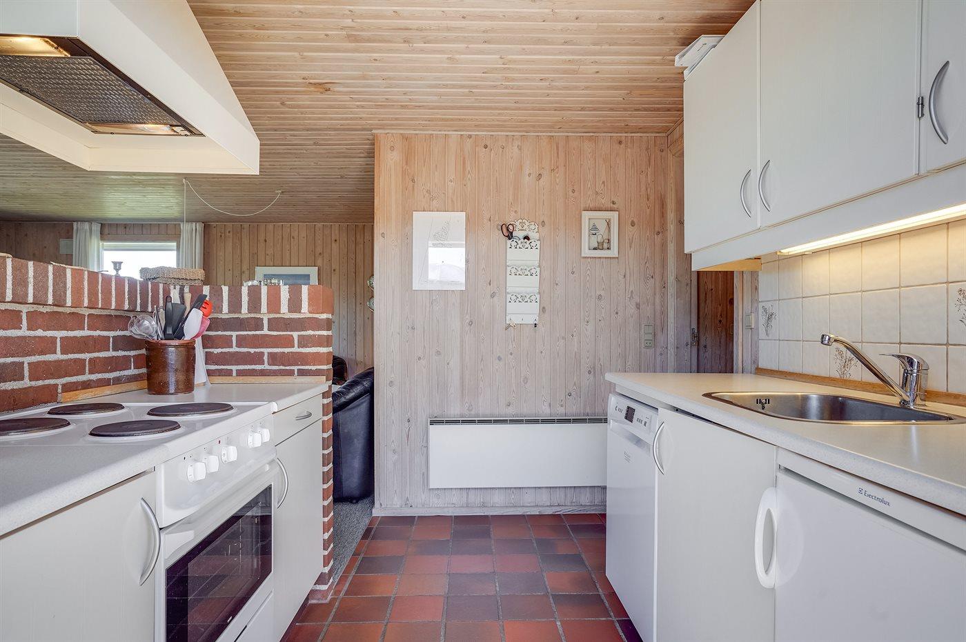 Køkkenet er udstyret med 1 køleskab. Der er 4 elkogeplader, bageovn, mikrobølgeovn samt opvaskemaskine.