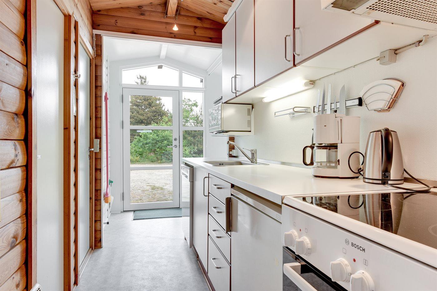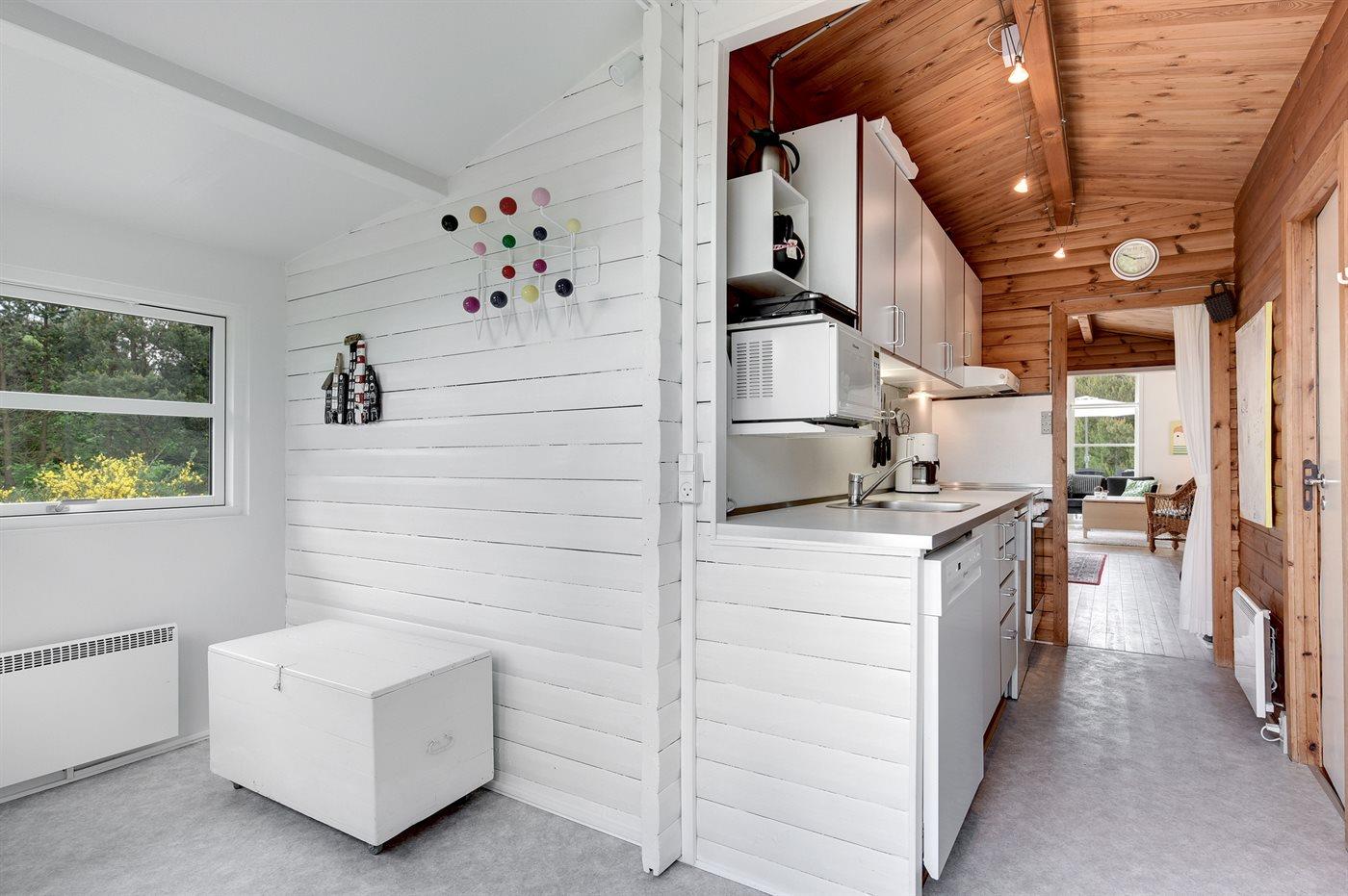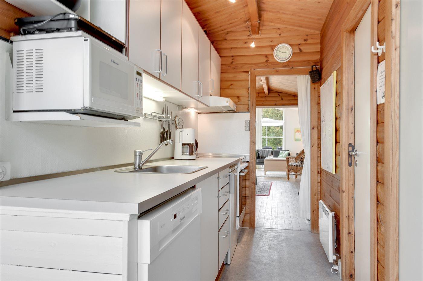 Køkkenet er udstyret med 1 køleskab. Der er 4 elkogeplader, bageovn, mikrobølgeovn samt opvaskemaskine.