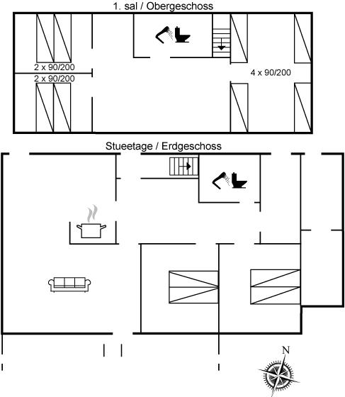 Der er i alt 5 soveværelser. Sovepladserne fordeler sig på: 8 sovepladser i dobbeltsenge. 4 sovepladser i enkeltsenge. Derudover er der 1 stk. barneseng.
