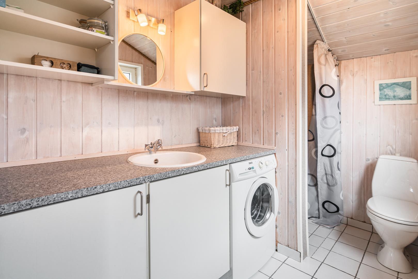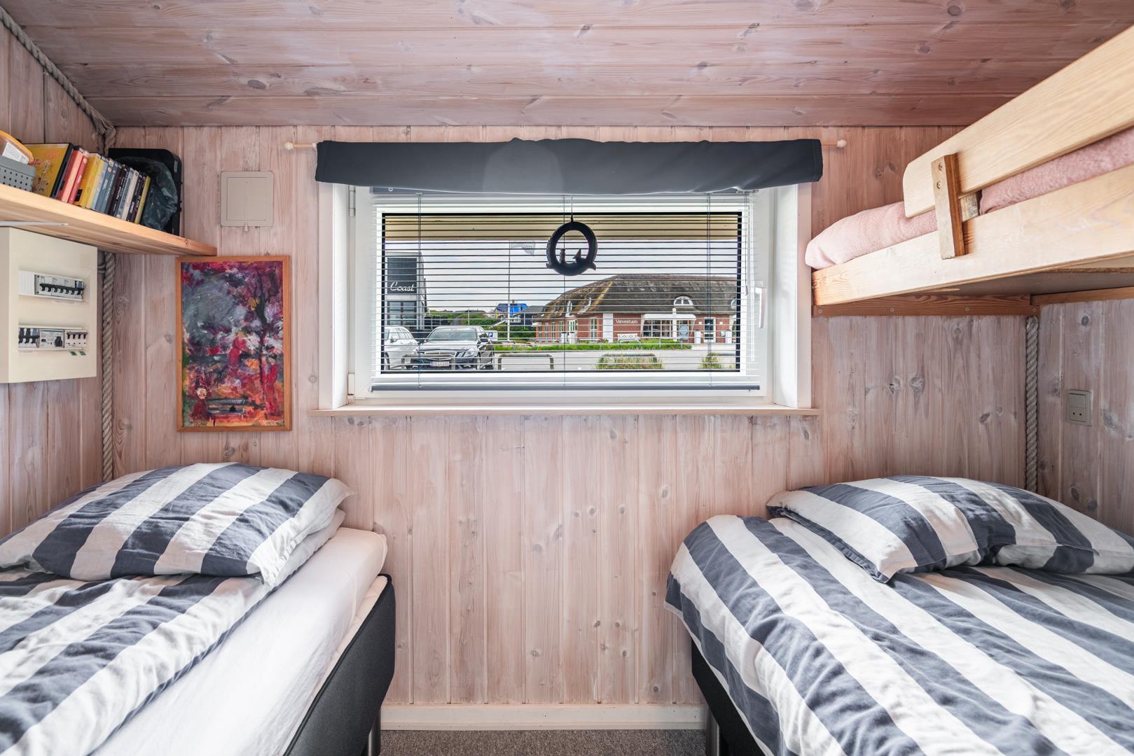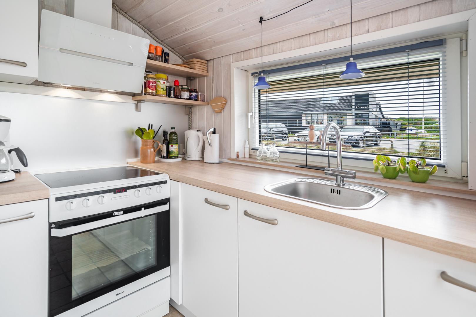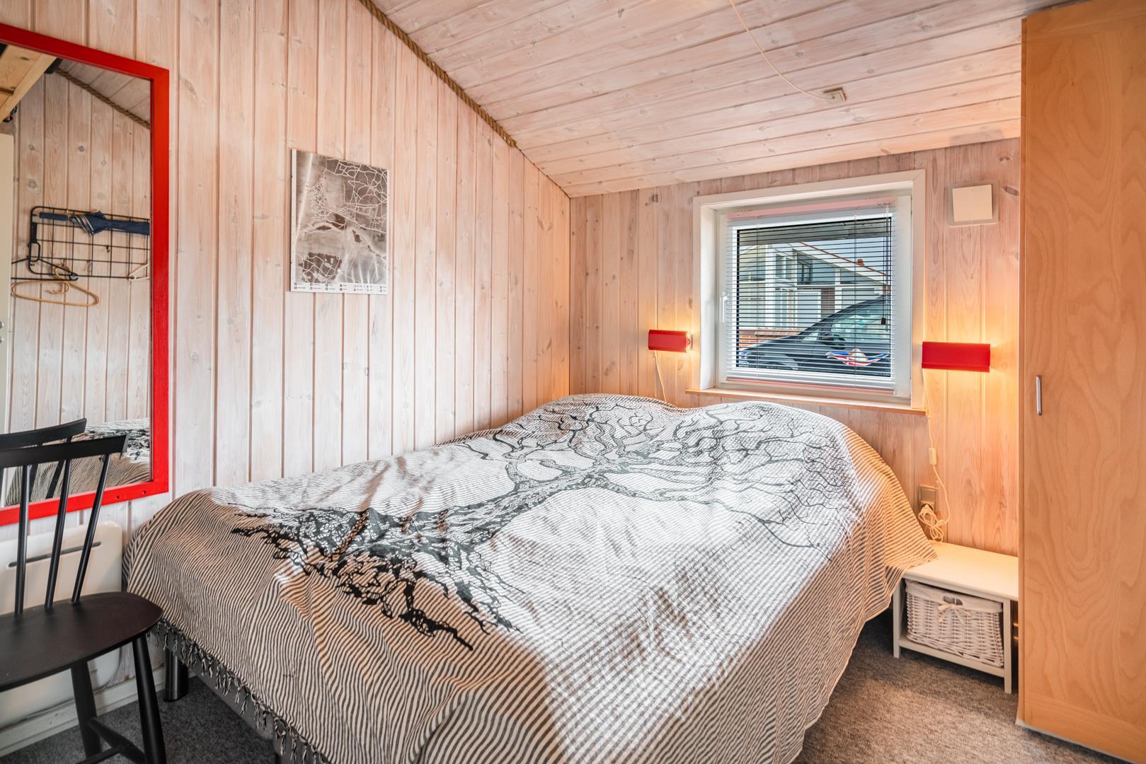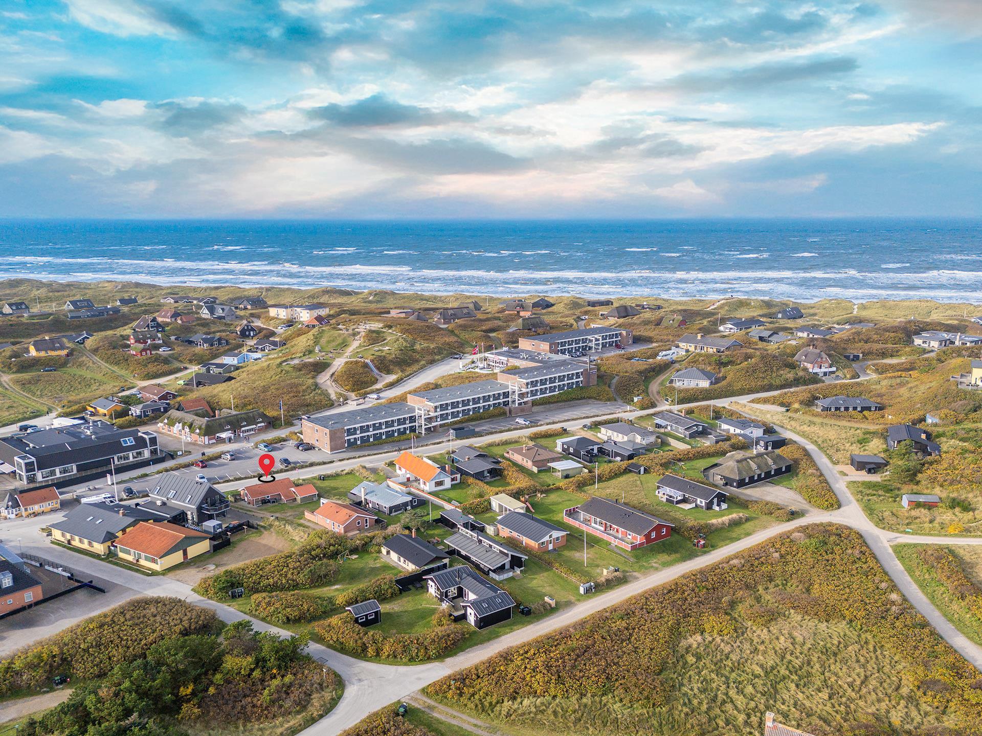 Stuen er i åben forbindelse med husets køkken. Sommerhuset er indrettet med to soverum og et godt badeværelse med gulvvarme og vaskemaskine. Et rigtig dejligt sommerhus midt i Henne Strand for den lille familie eller to par, der blot ønsker at kunne nyde alle mulighederne i byen i gåafstand.