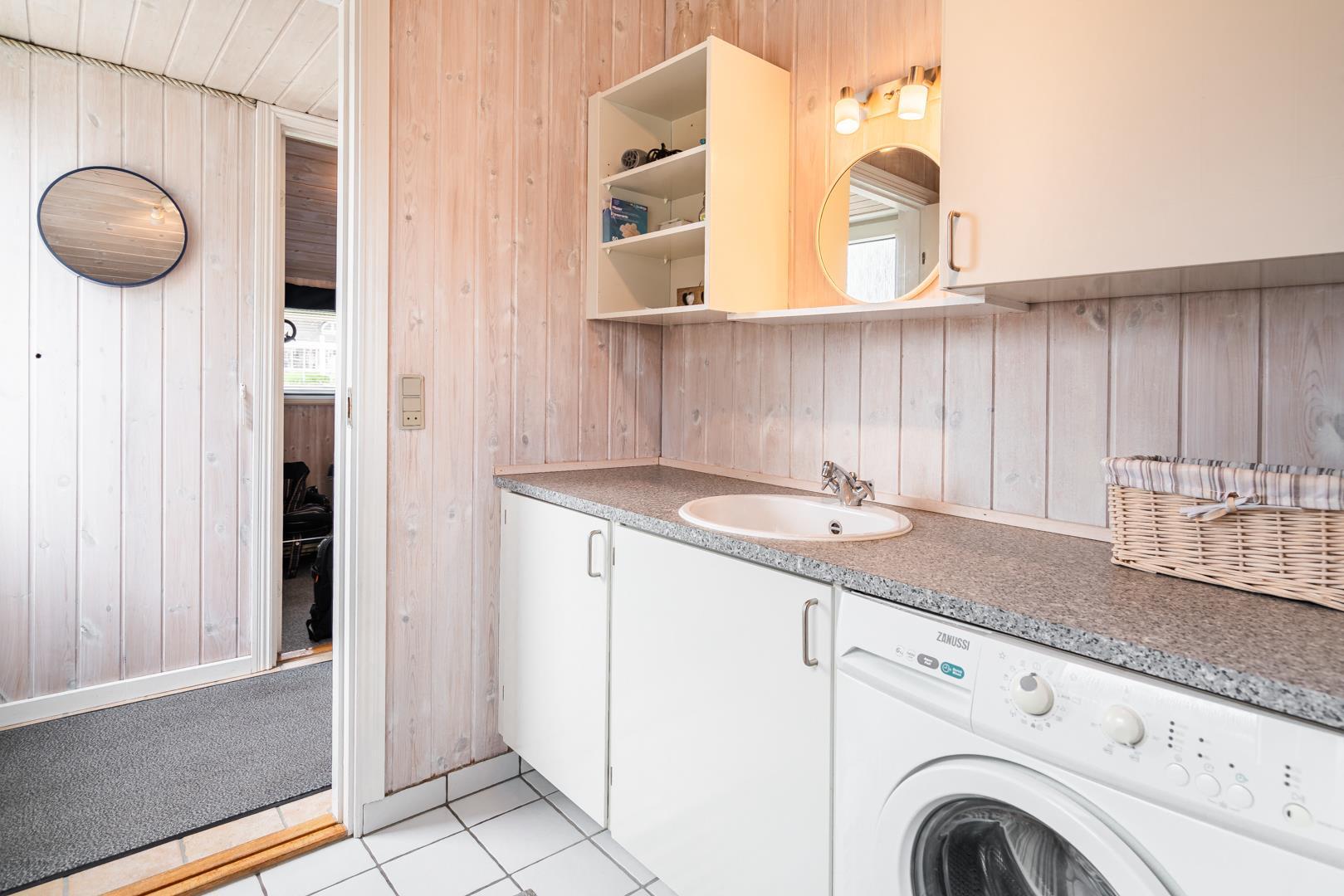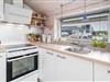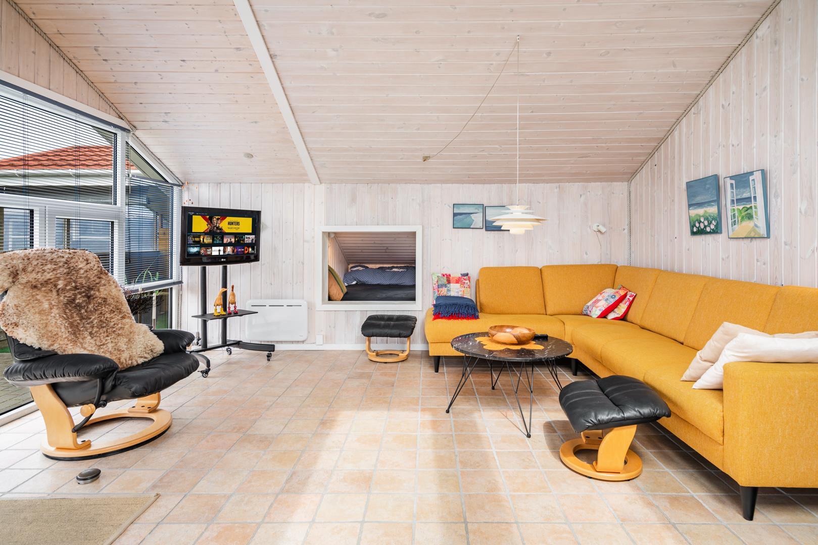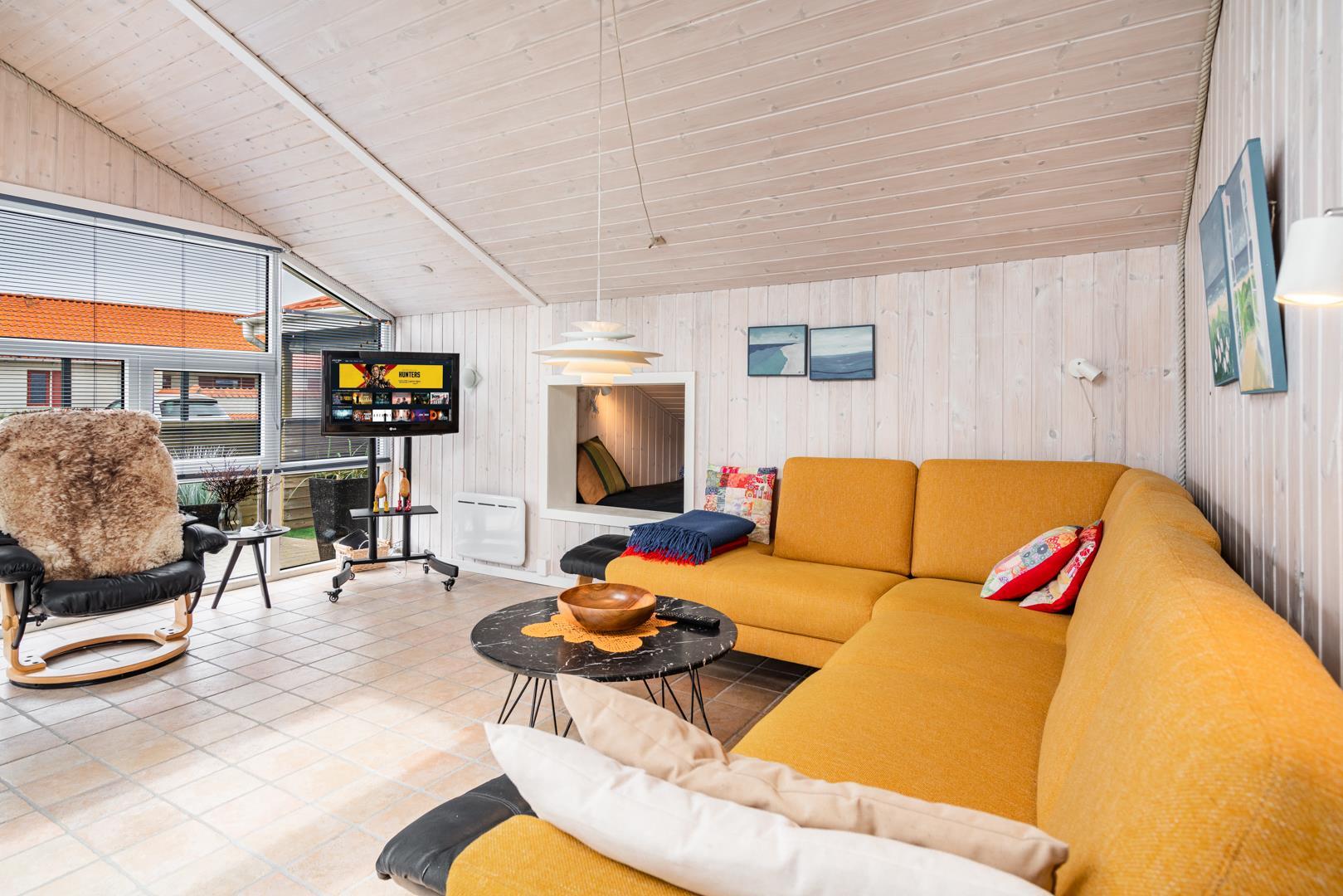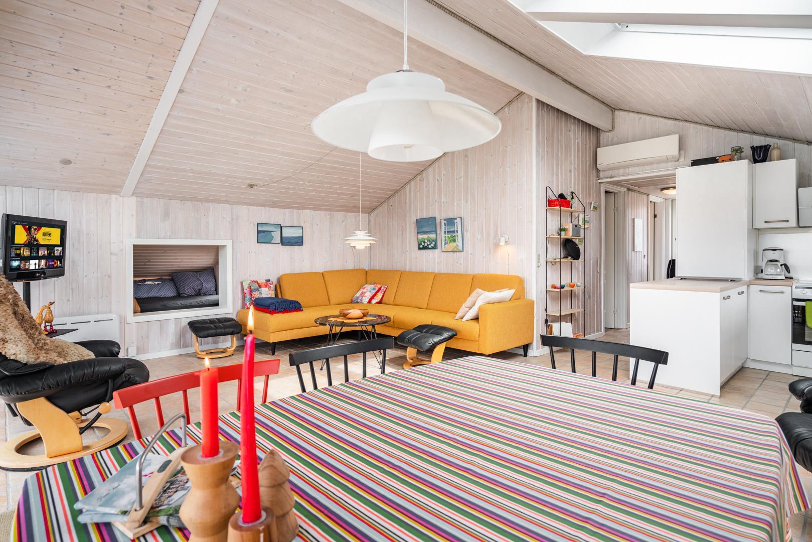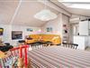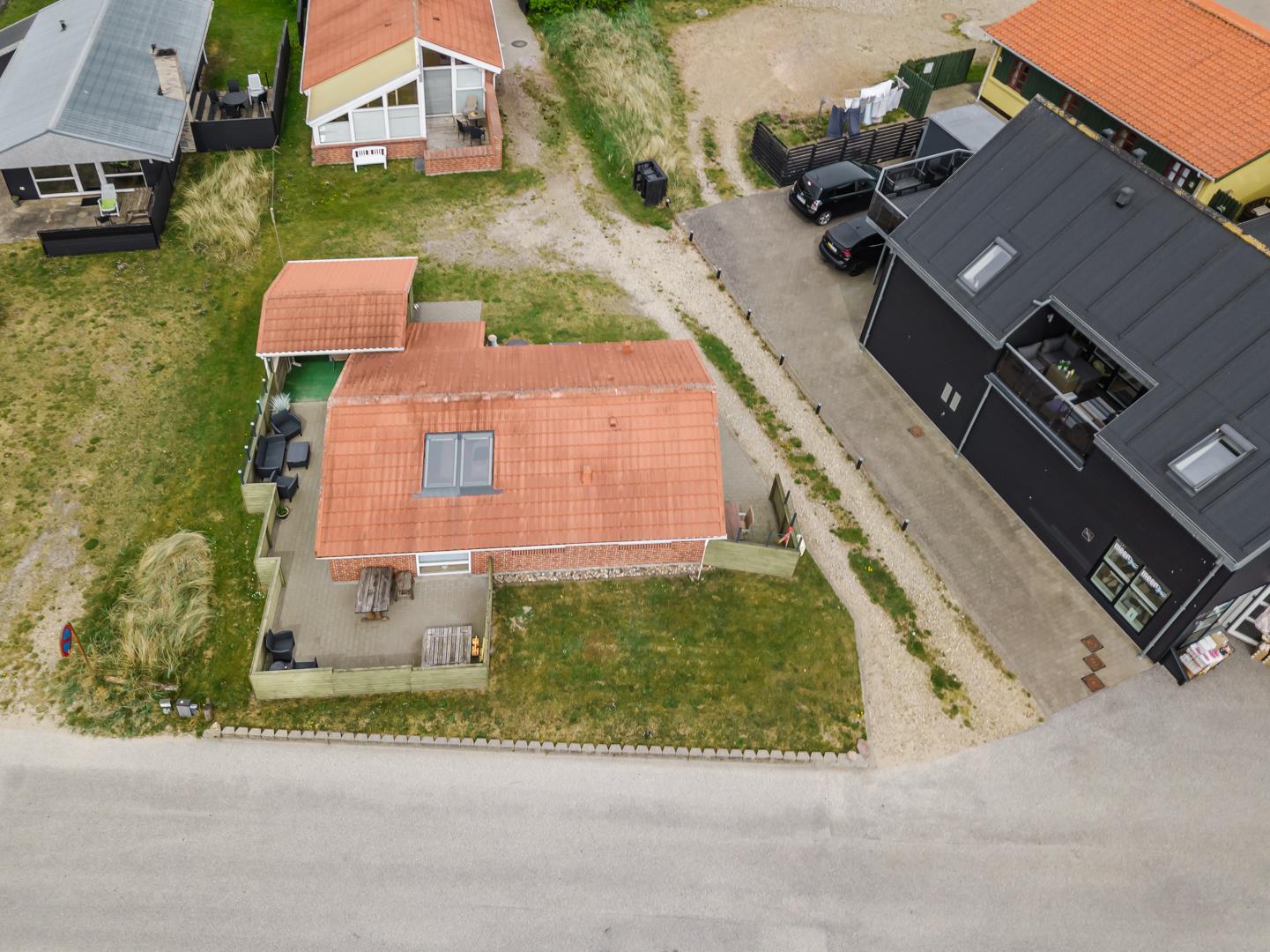Stuen er i åben forbindelse med husets køkken. Sommerhuset er indrettet med to soverum og et godt badeværelse med gulvvarme og vaskemaskine. Et rigtig dejligt sommerhus midt i Henne Strand for den lille familie eller to par, der blot ønsker at kunne nyde alle mulighederne i byen i gåafstand.