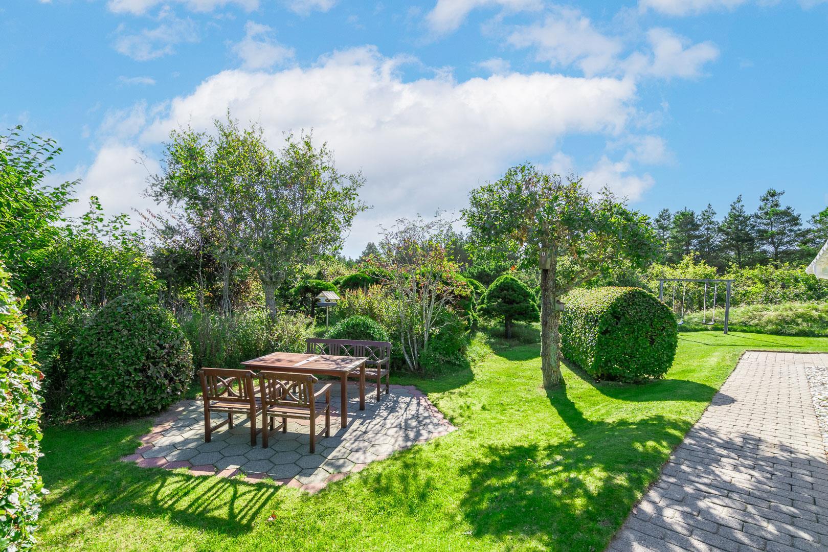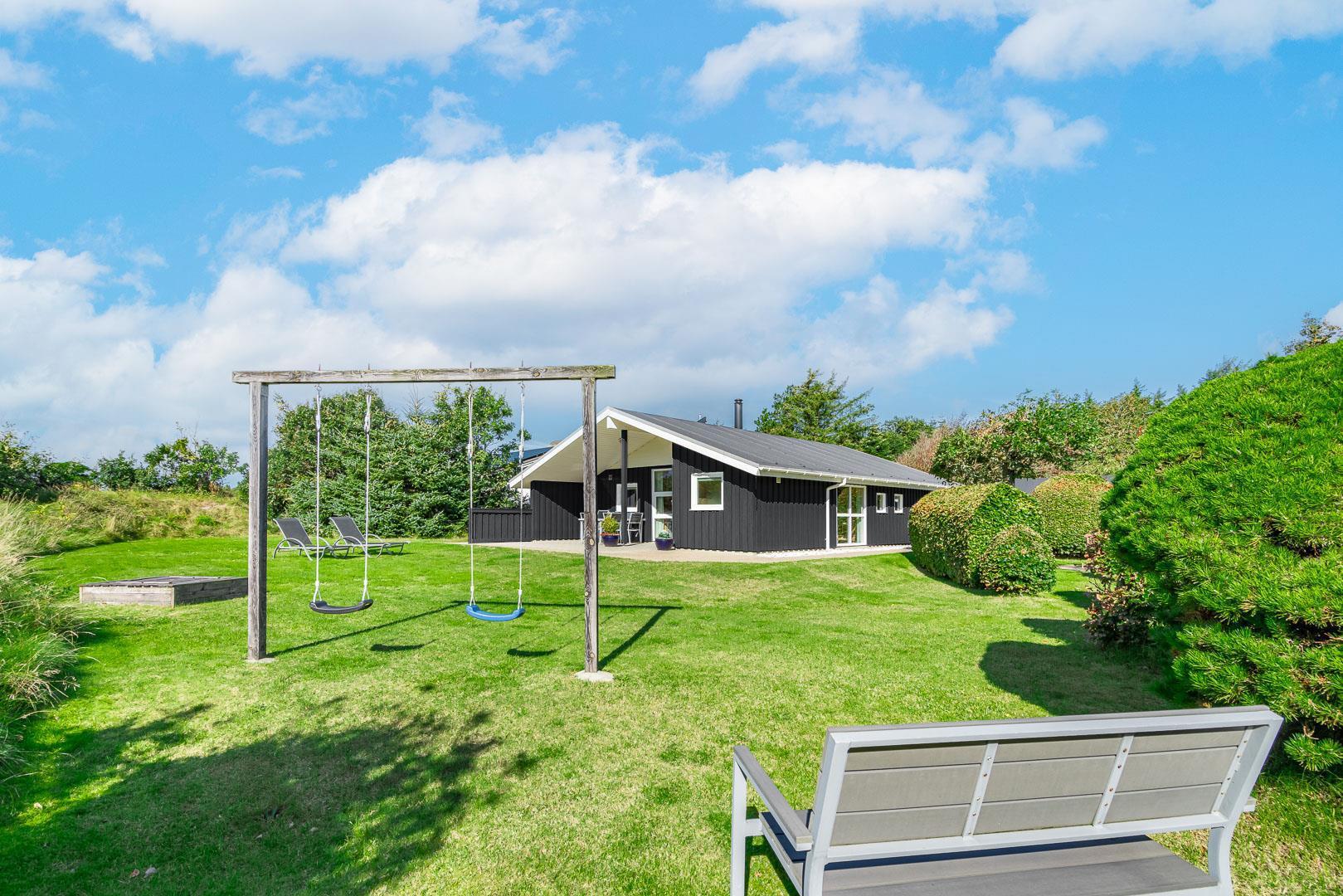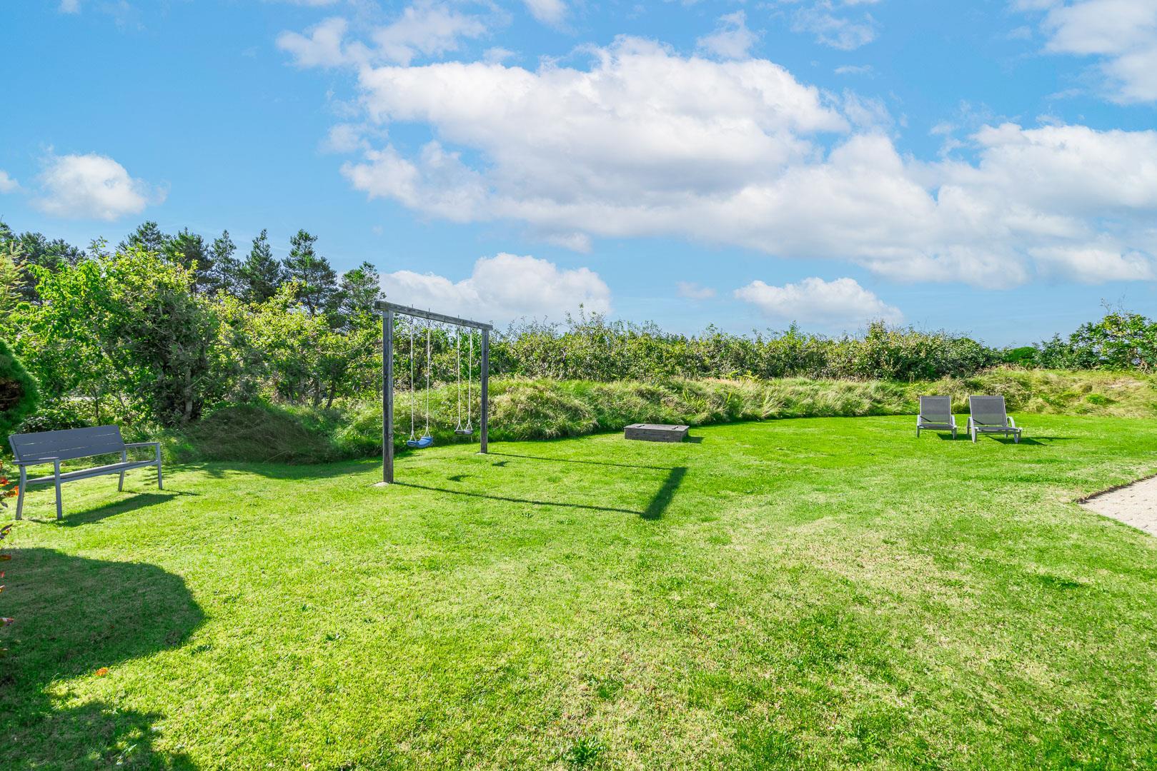 Til sommerhuset hører et roligt udeområde med gynge og sandkasse samt god plads til leg og ophold. Området egner sig også fint til ferie med hund, da der er gode muligheder for gåture direkte fra huset.