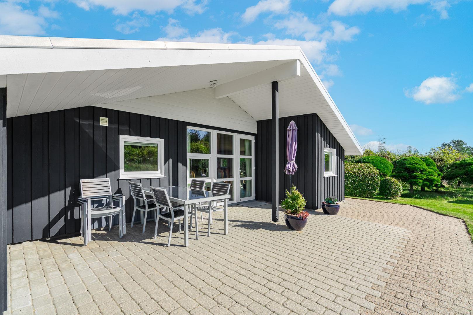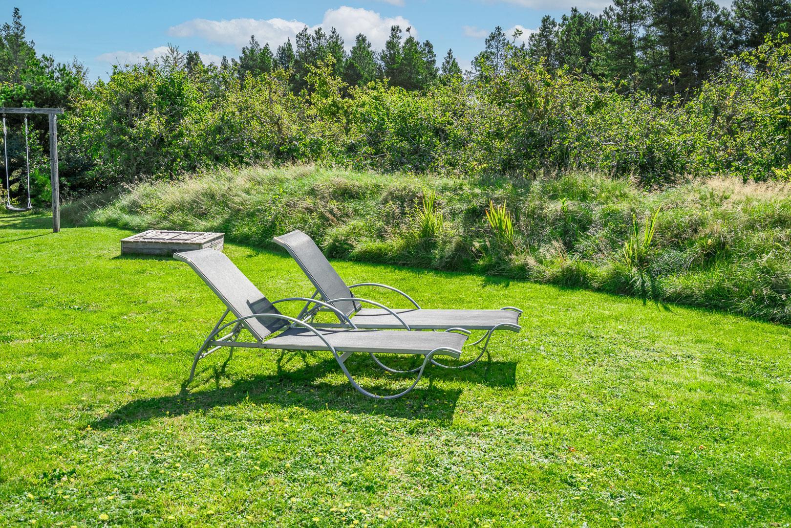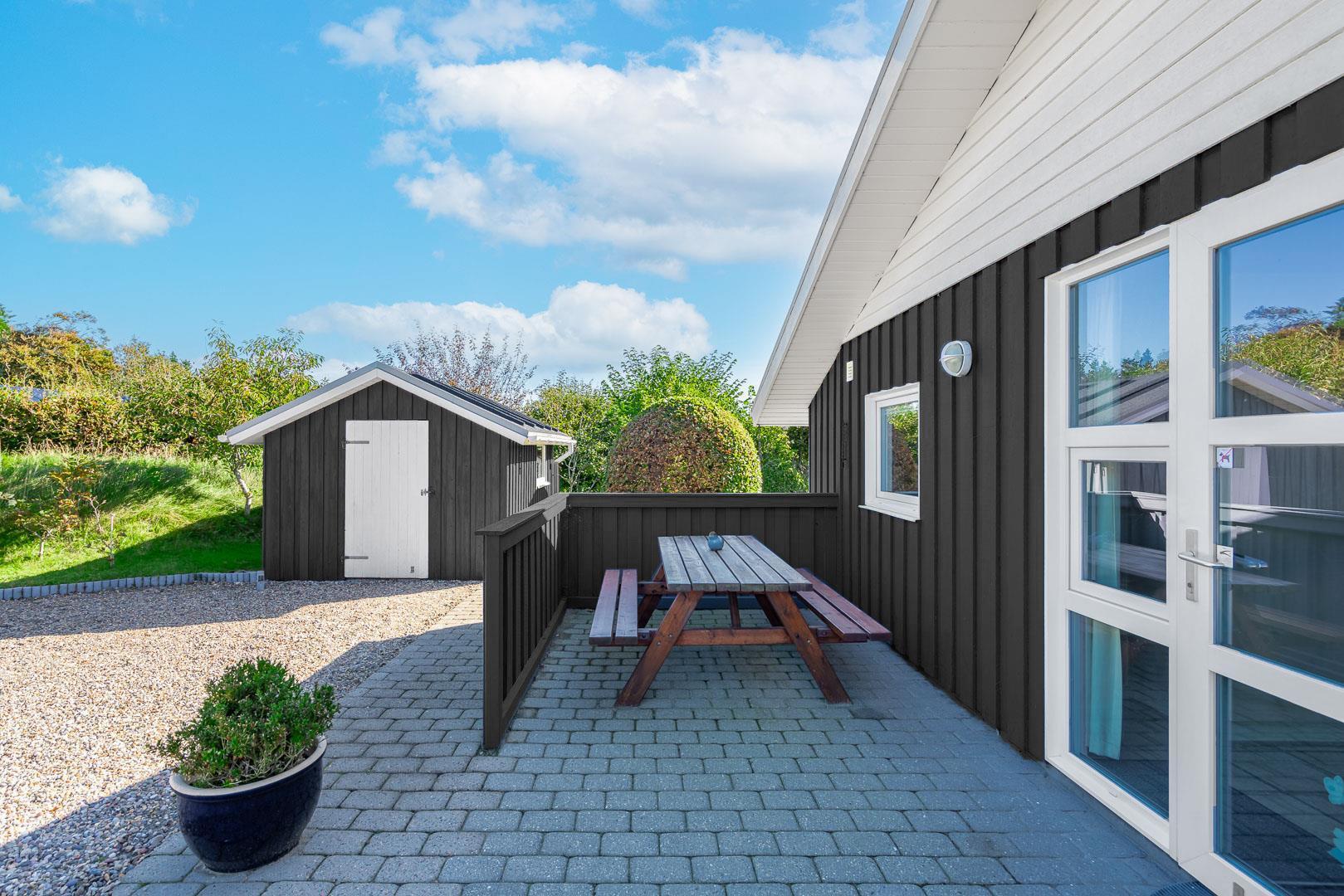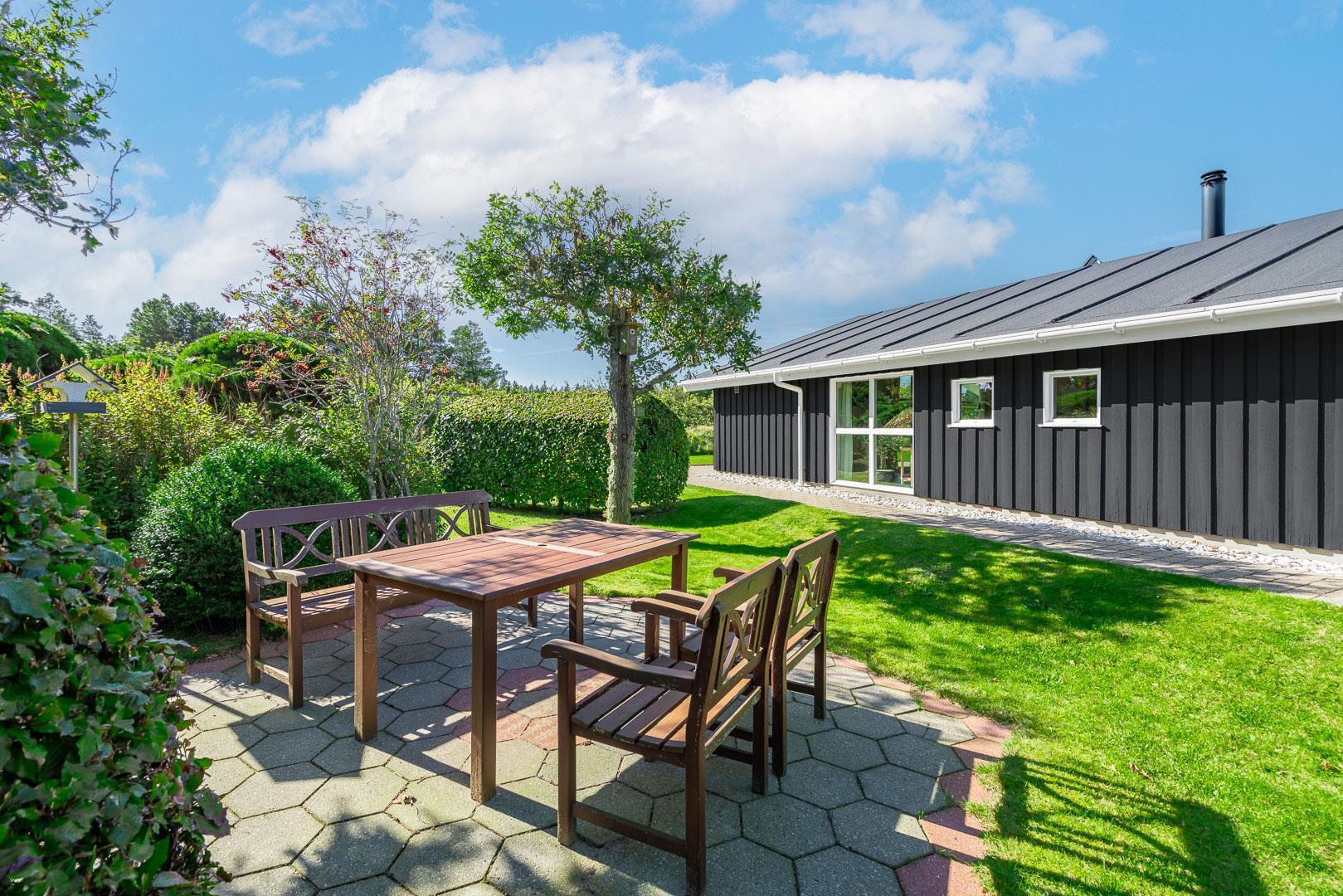 Til sommerhuset hører et roligt udeområde med gynge og sandkasse samt god plads til leg og ophold. Området egner sig også fint til ferie med hund, da der er gode muligheder for gåture direkte fra huset.
