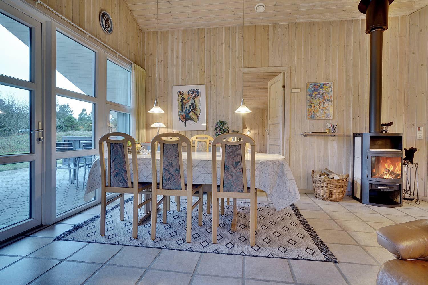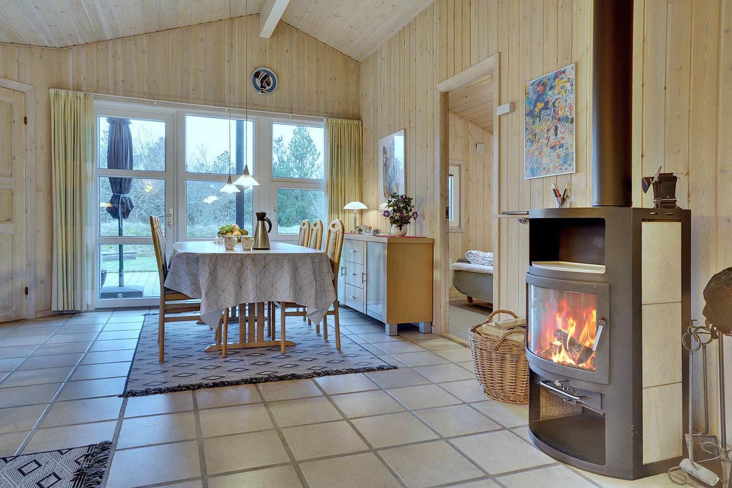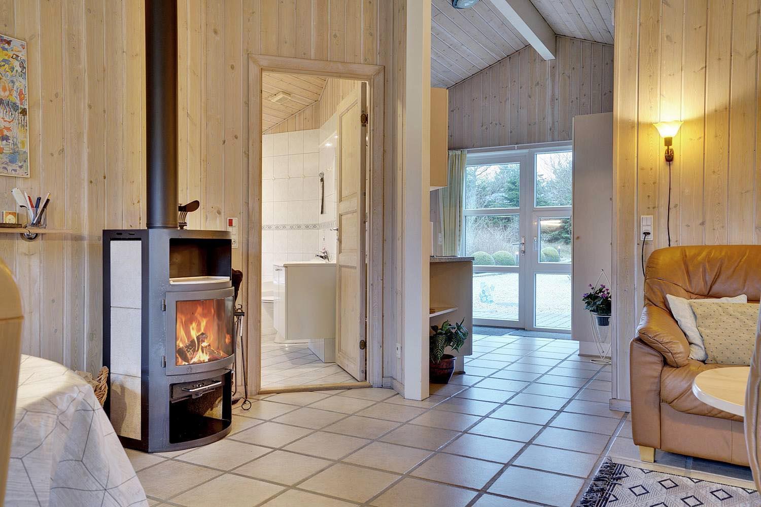 Indenfor fremstår huset lyst, hyggeligt og funktionelt. Opholdsafdelingen har brændeovn og gulvvarme, som skaber en behagelig atmosfære – især efter en dag ved stranden eller i naturen. Køkken, spiseplads og stue er samlet i ét åbent rum, der gør det nemt at være sammen. Køkkenet er praktisk indrettet og udstyret med opvaskemaskine.