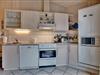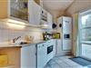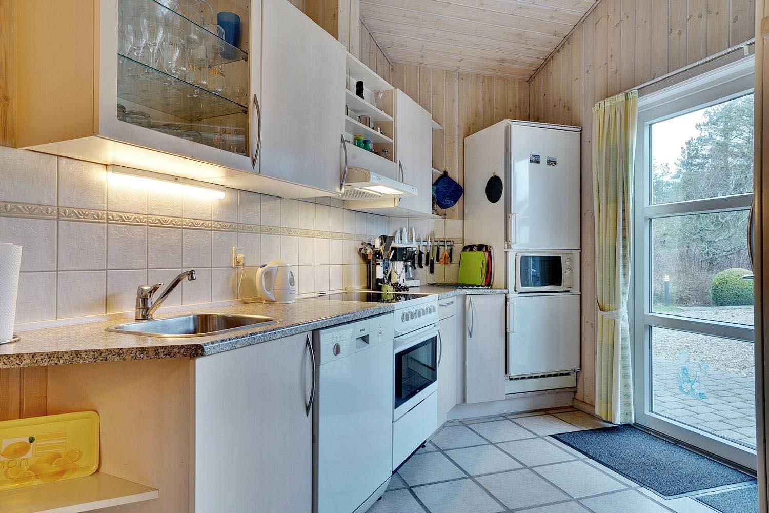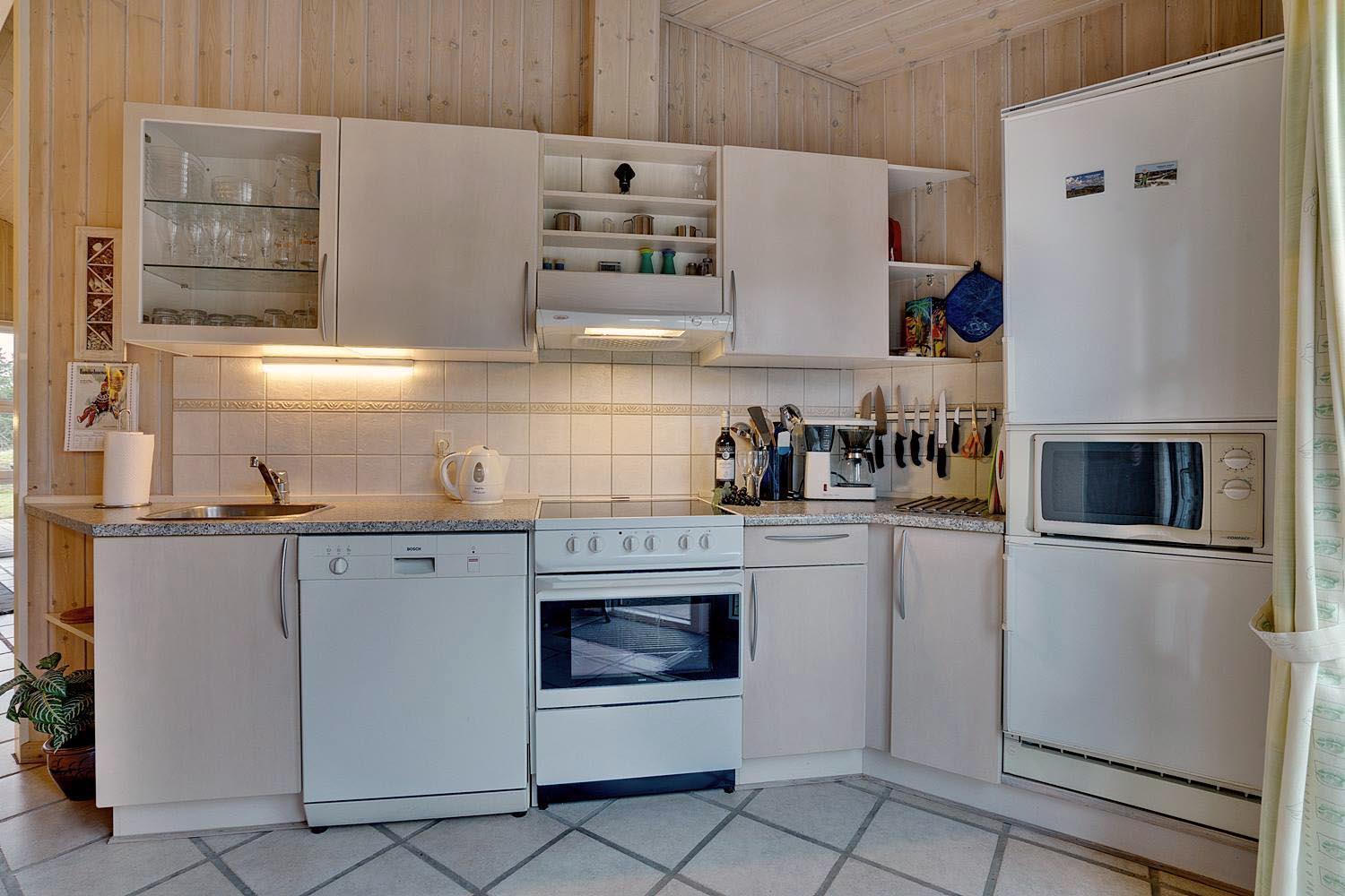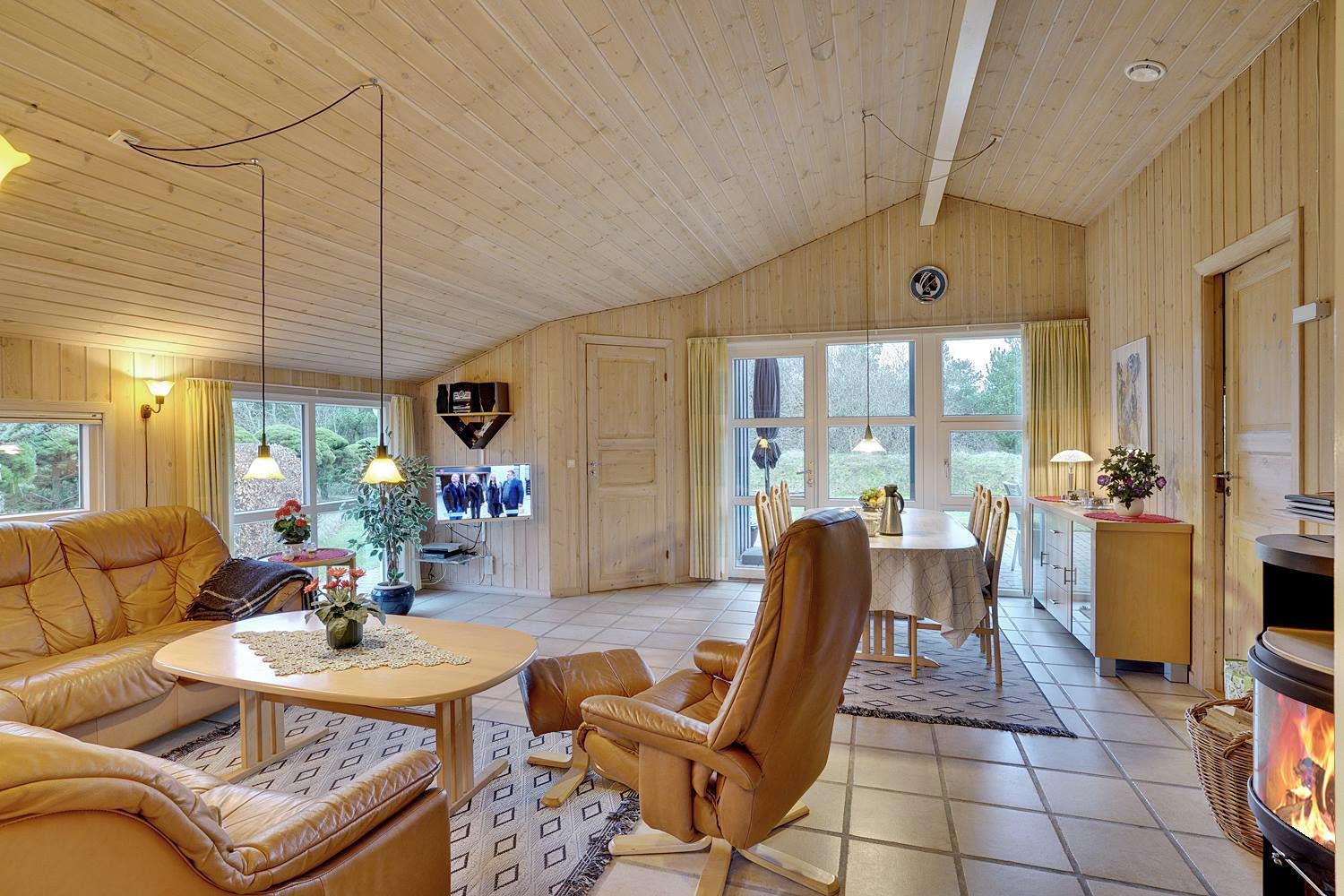 Indenfor fremstår huset lyst, hyggeligt og funktionelt. Opholdsafdelingen har brændeovn og gulvvarme, som skaber en behagelig atmosfære – især efter en dag ved stranden eller i naturen. Køkken, spiseplads og stue er samlet i ét åbent rum, der gør det nemt at være sammen. Køkkenet er praktisk indrettet og udstyret med opvaskemaskine.
