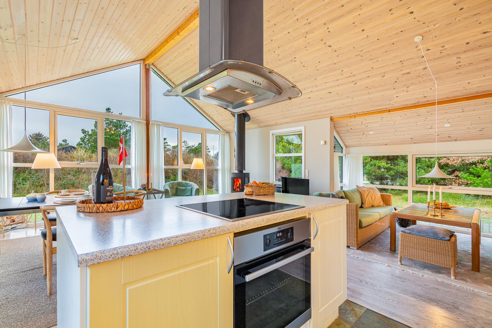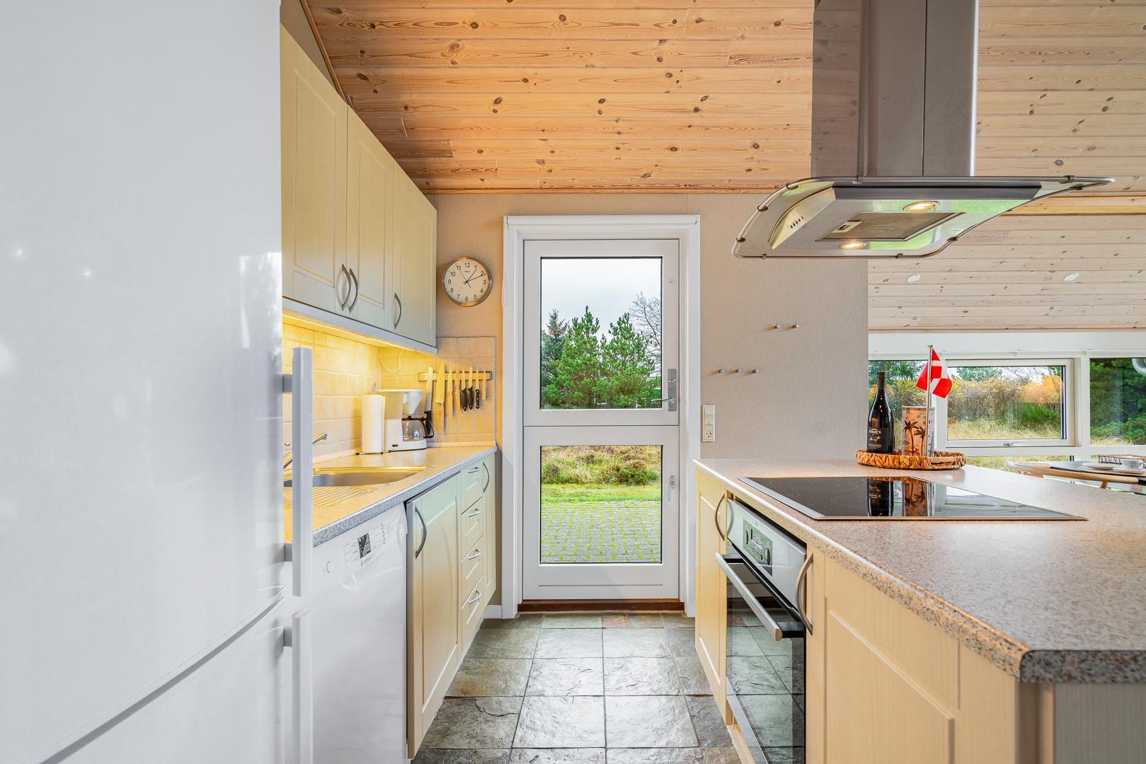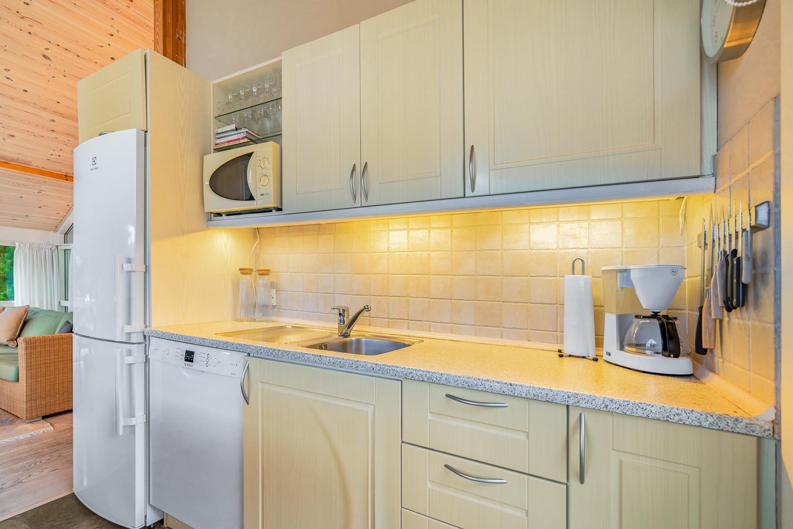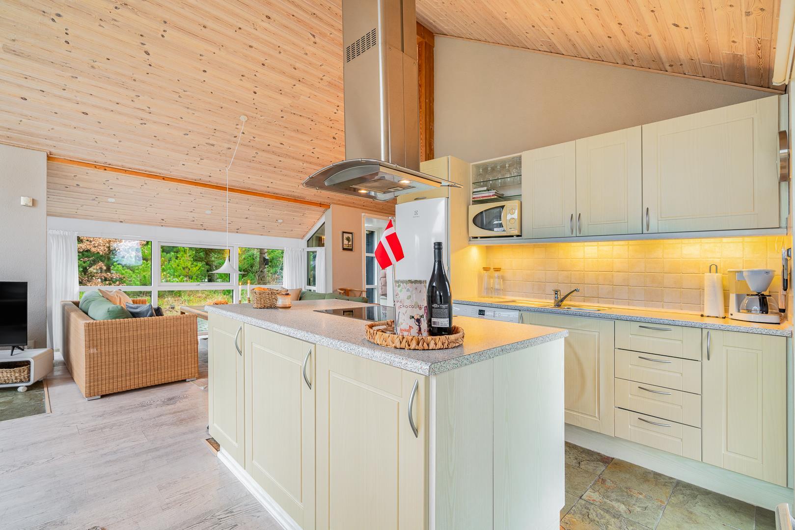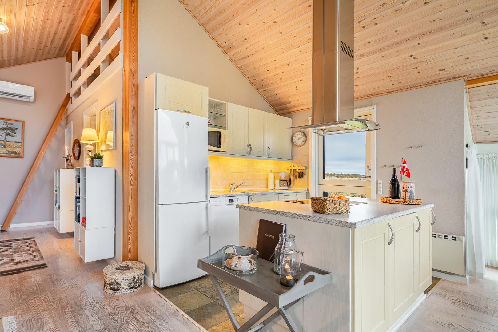 Sommerhuset har en lyst og godt indrettet køkken/alrum med brændeovn samt varmepumpe. Herfra er der direkte udgang til husets terrasser. Fra husets badeværelse, er der afgang til saunaen. Der er her tale om et sommerhus, hvor der er kræset om alle detaljerne.