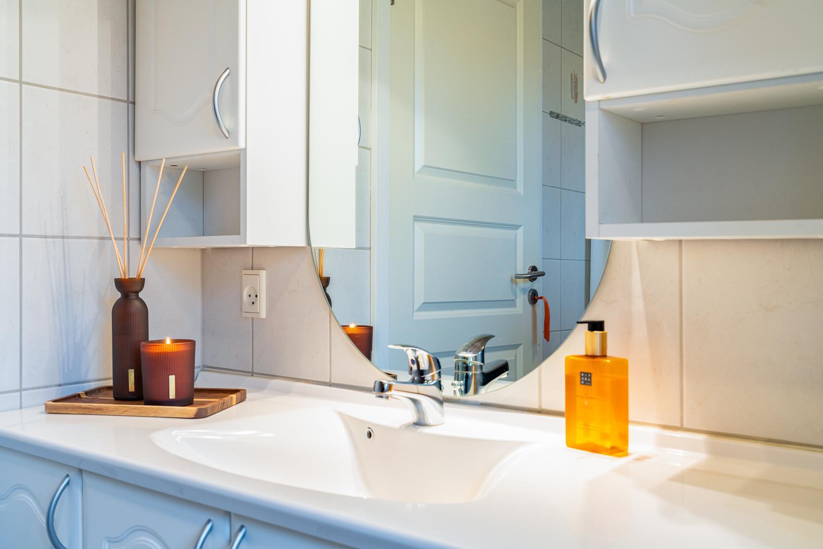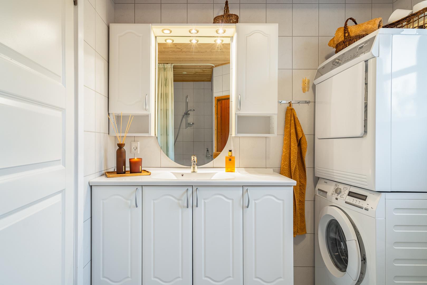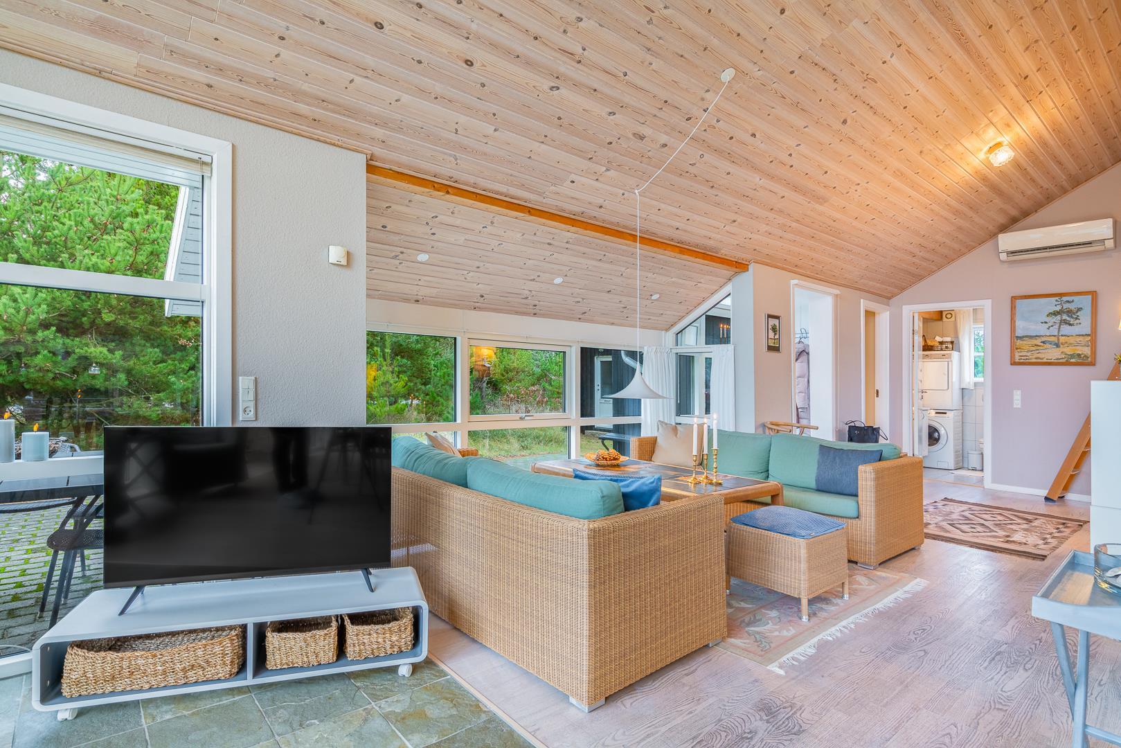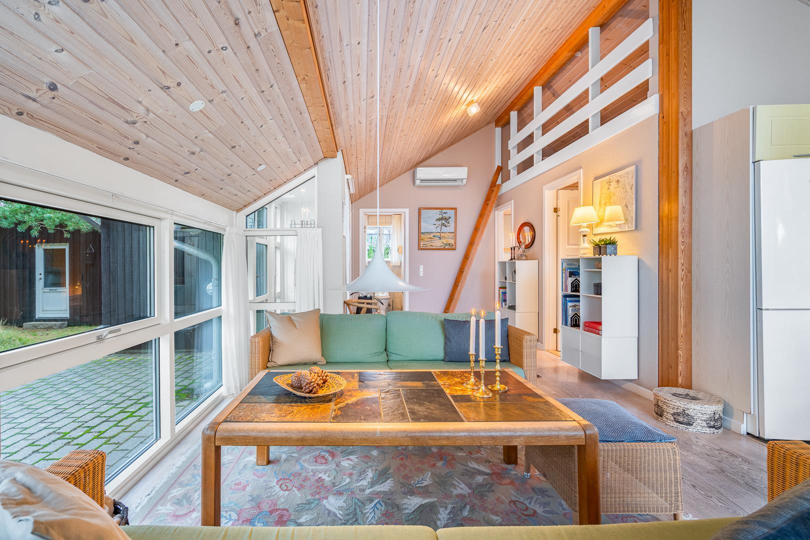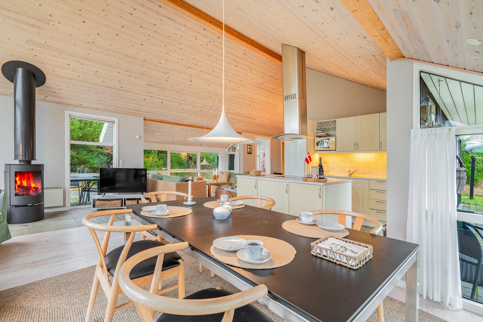 Sommerhuset har en lyst og godt indrettet køkken/alrum med brændeovn samt varmepumpe. Herfra er der direkte udgang til husets terrasser. Fra husets badeværelse, er der afgang til saunaen. Der er her tale om et sommerhus, hvor der er kræset om alle detaljerne.