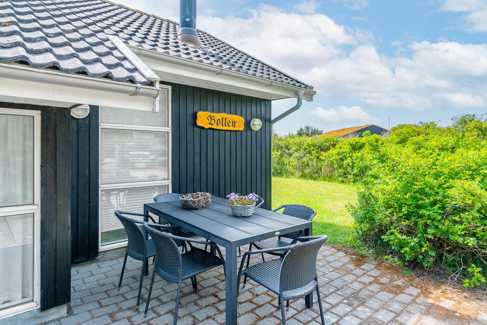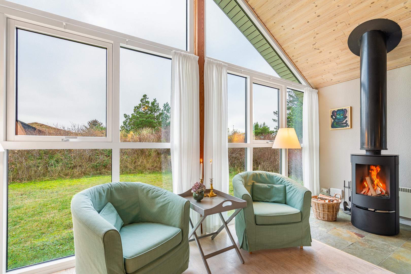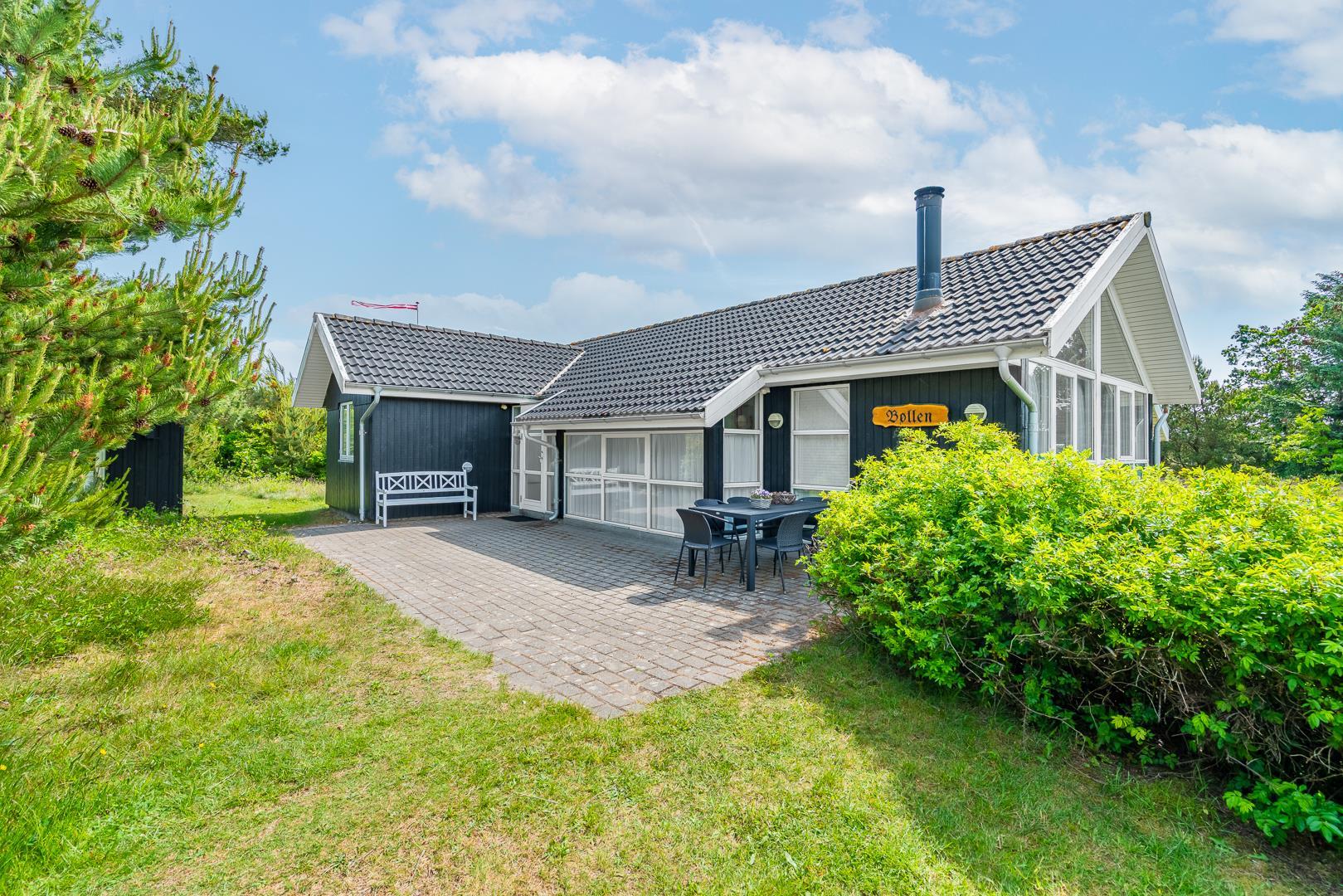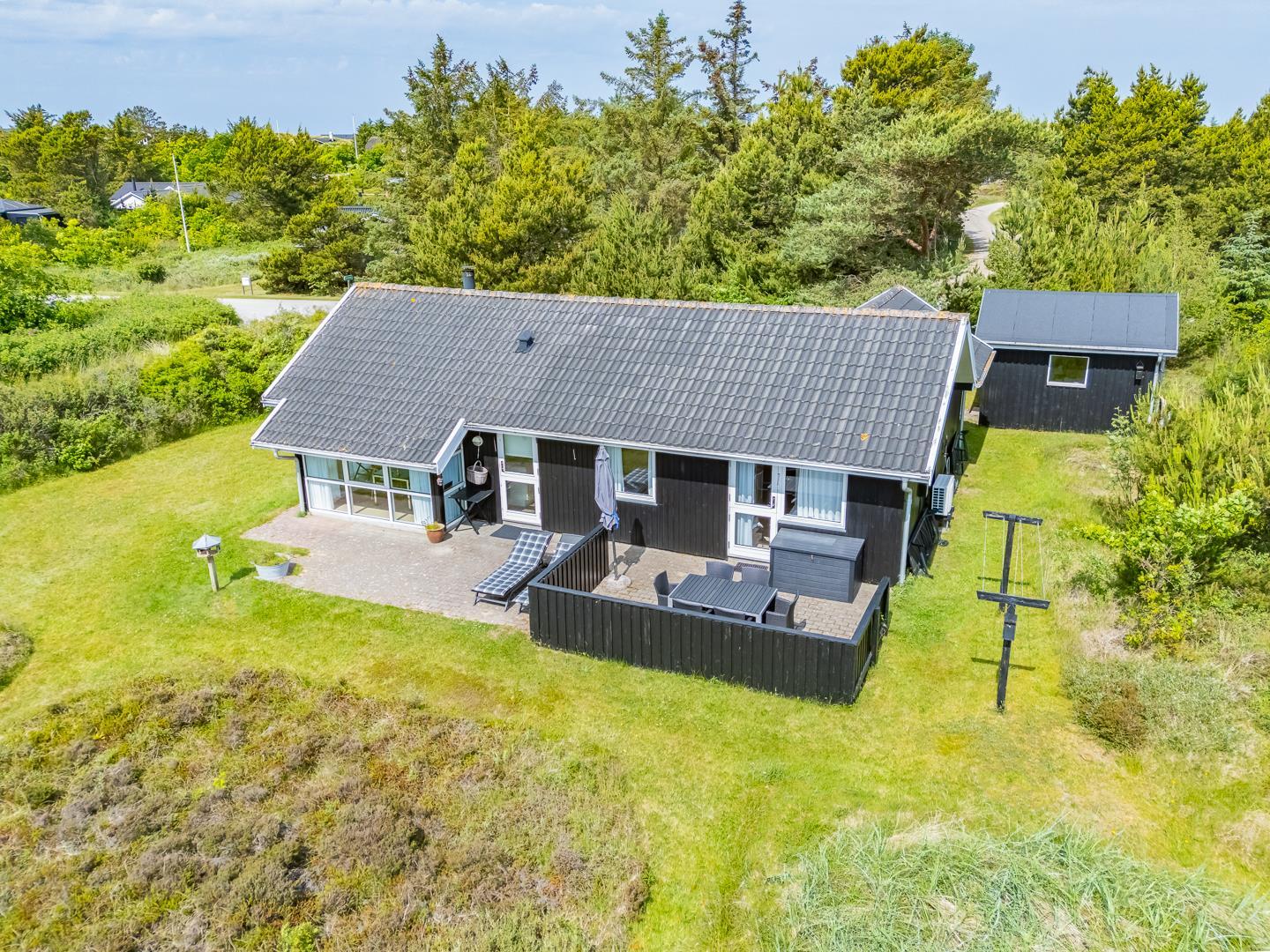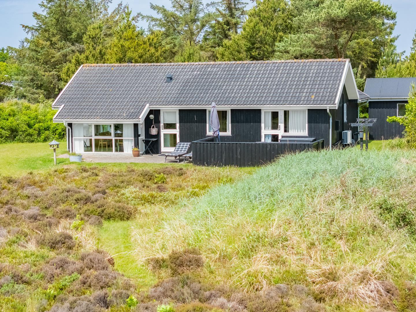 Hyggeligt sommerhus ved Henne Strand med sauna, brændeovn og stor naturgrund tæt på strand og indkøb.