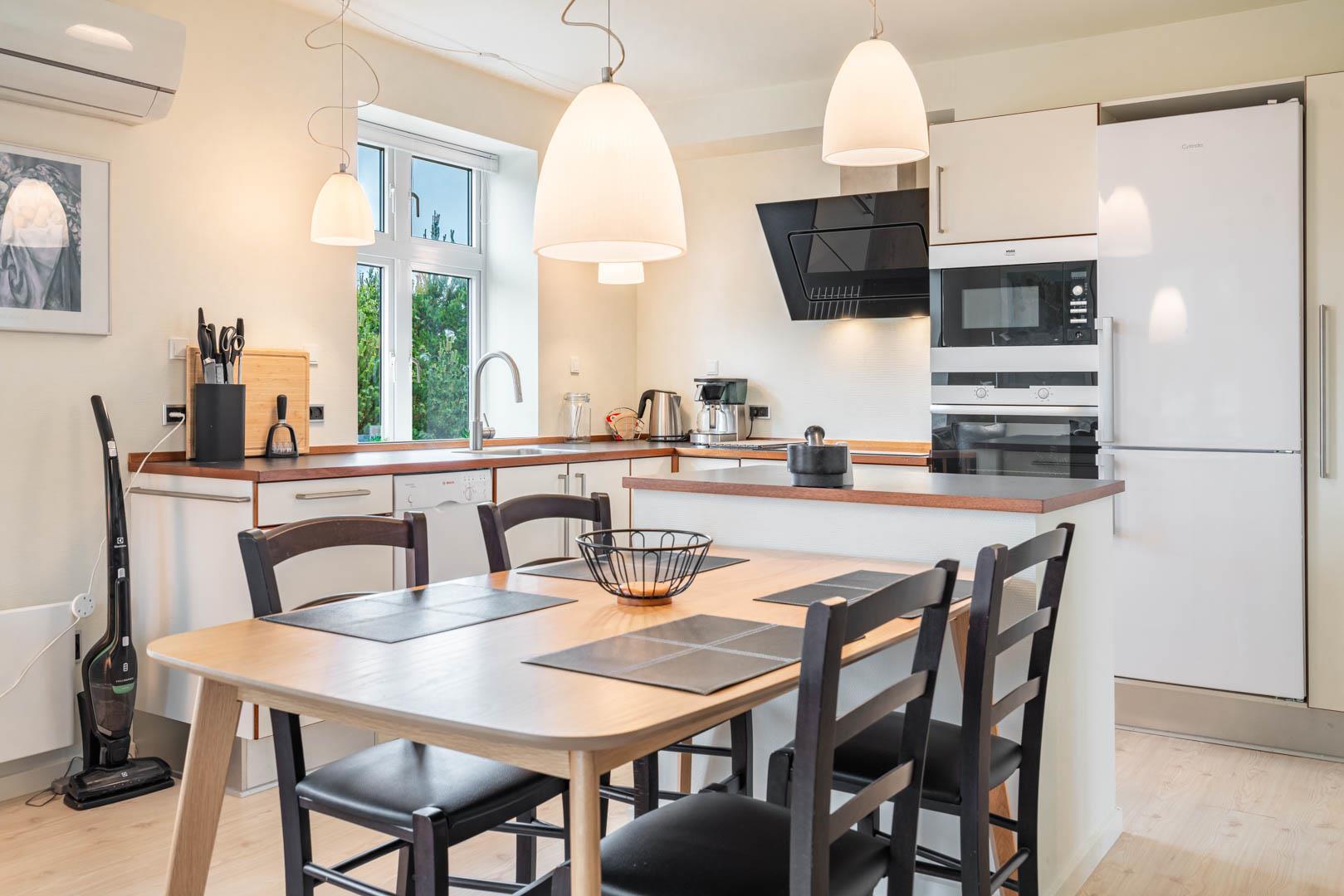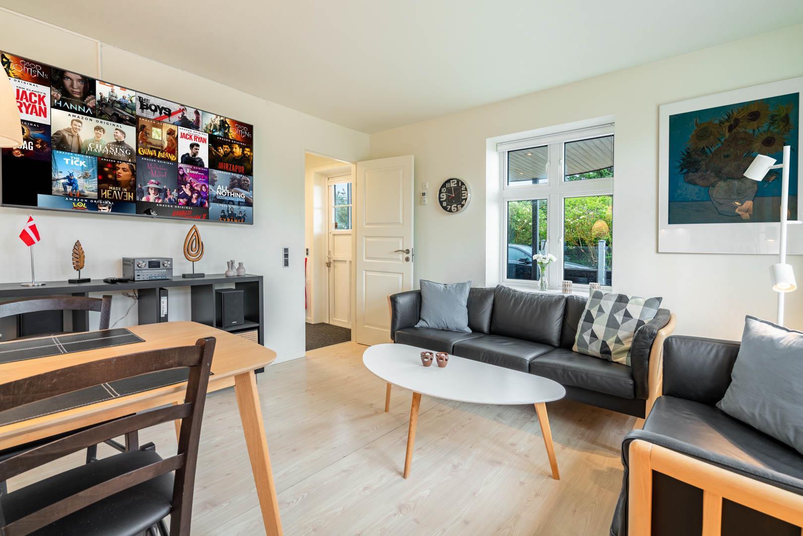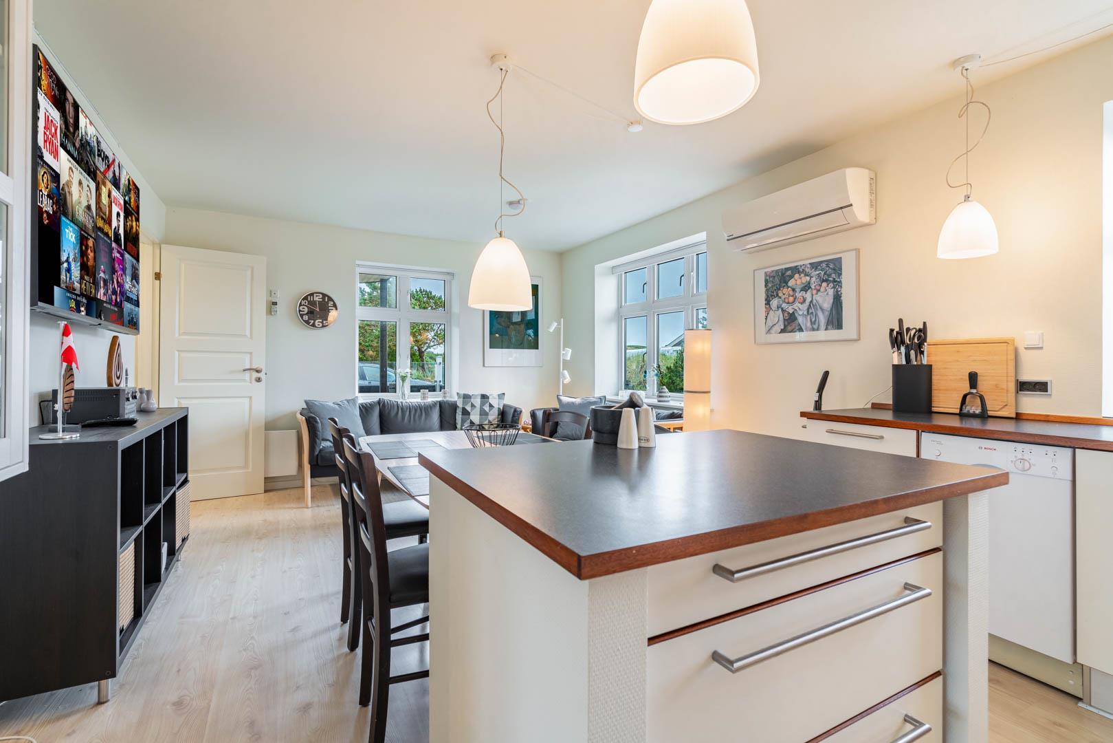 Veludstyret sydvendt kvalitetslejlighed i stueplan beliggende på en stor lukket naturgrund ikke langt fra Henne Strands centrum og vandet. Lejligheden er løbende blevet renoveret, så alt fremstår lyst og venligt. Der er trådløs internet (tag din egen pc´er med) TV i begge soverum. El klima-/varmepumpe anlæg (energibesparende). BEMÆRK: Følgende ting findes ikke direkte lejligheden, men i et fællesrum med vaskemaskine og tørretumbler, som betales ekstra med mønt-indkast.