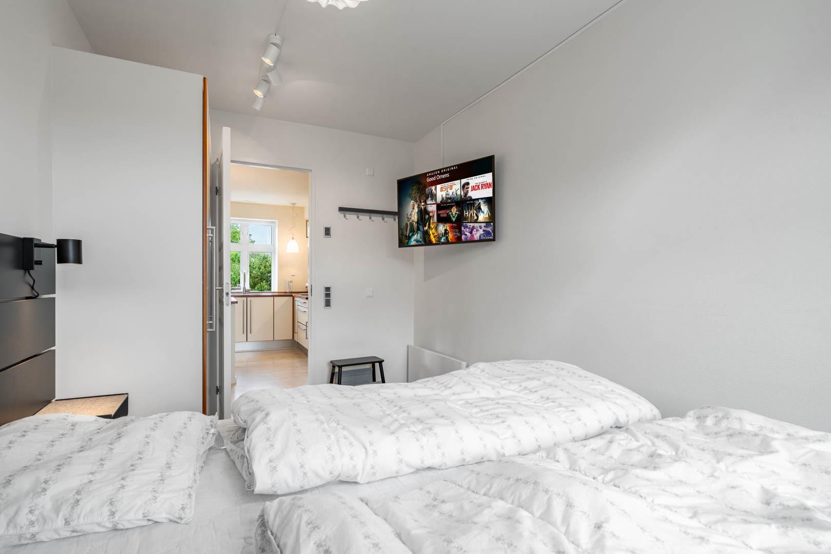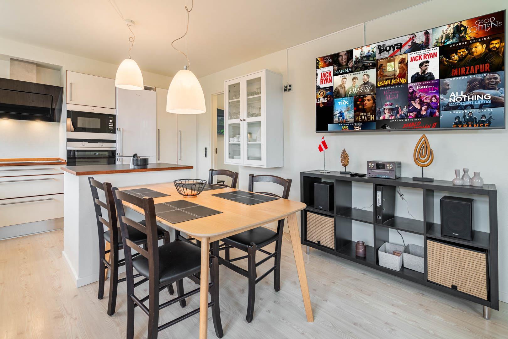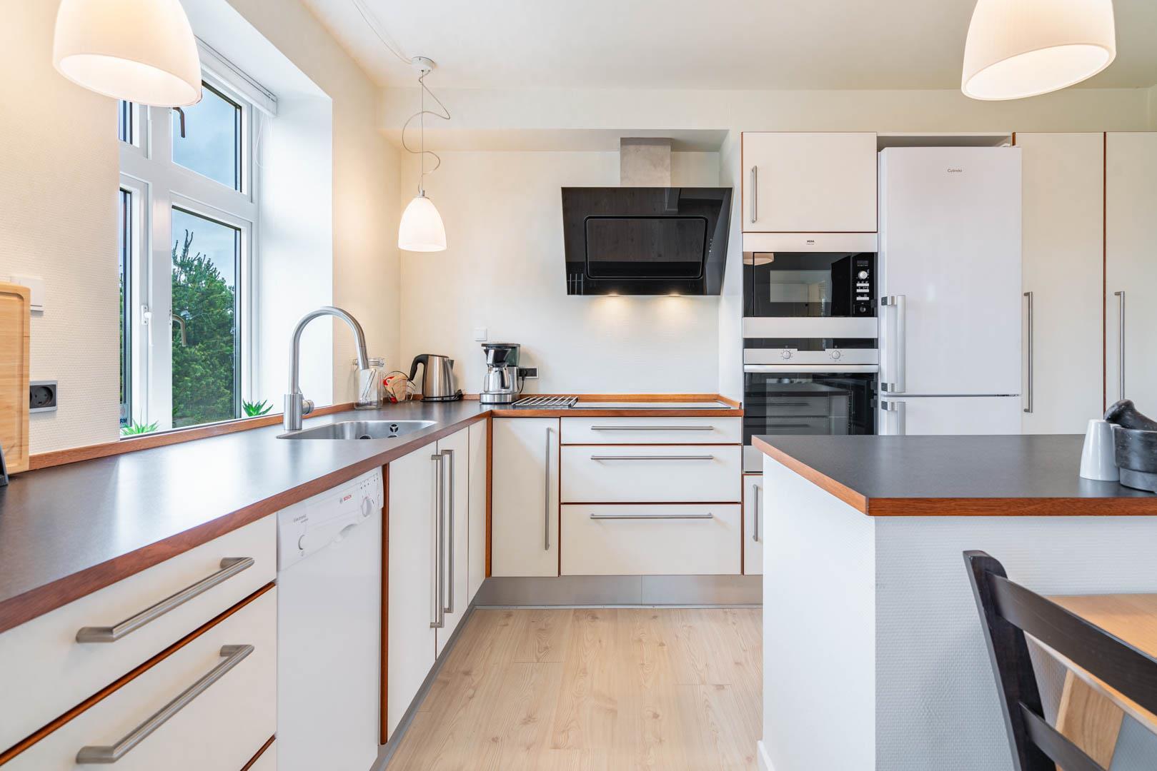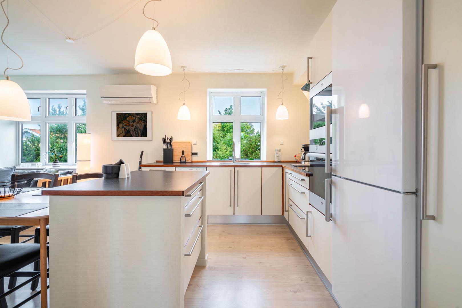 Veludstyret sydvendt kvalitetslejlighed i stueplan beliggende på en stor lukket naturgrund ikke langt fra Henne Strands centrum og vandet. Lejligheden er løbende blevet renoveret, så alt fremstår lyst og venligt. Der er trådløs internet (tag din egen pc´er med) TV i begge soverum. El klima-/varmepumpe anlæg (energibesparende). BEMÆRK: Følgende ting findes ikke direkte lejligheden, men i et fællesrum med vaskemaskine og tørretumbler, som betales ekstra med mønt-indkast.