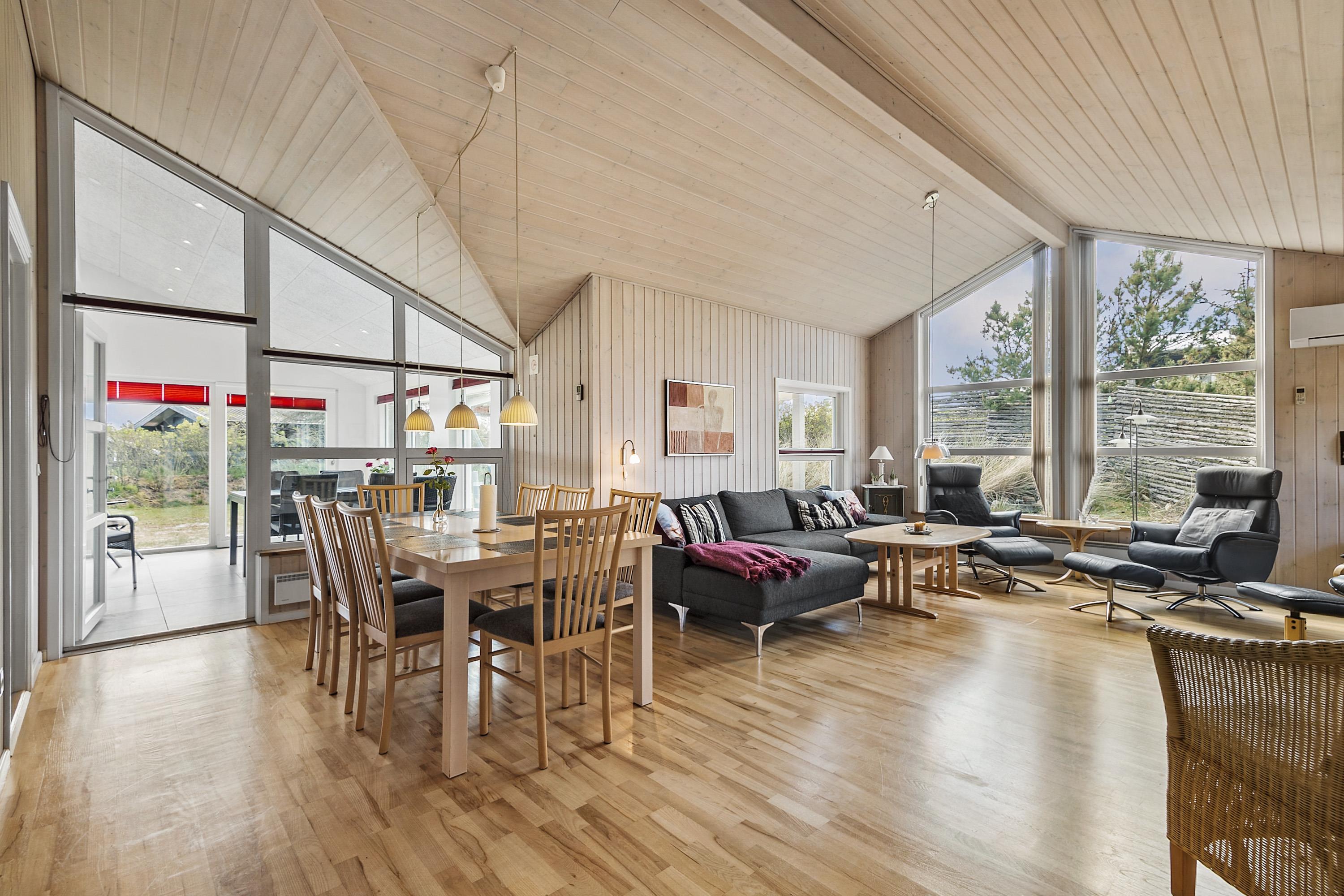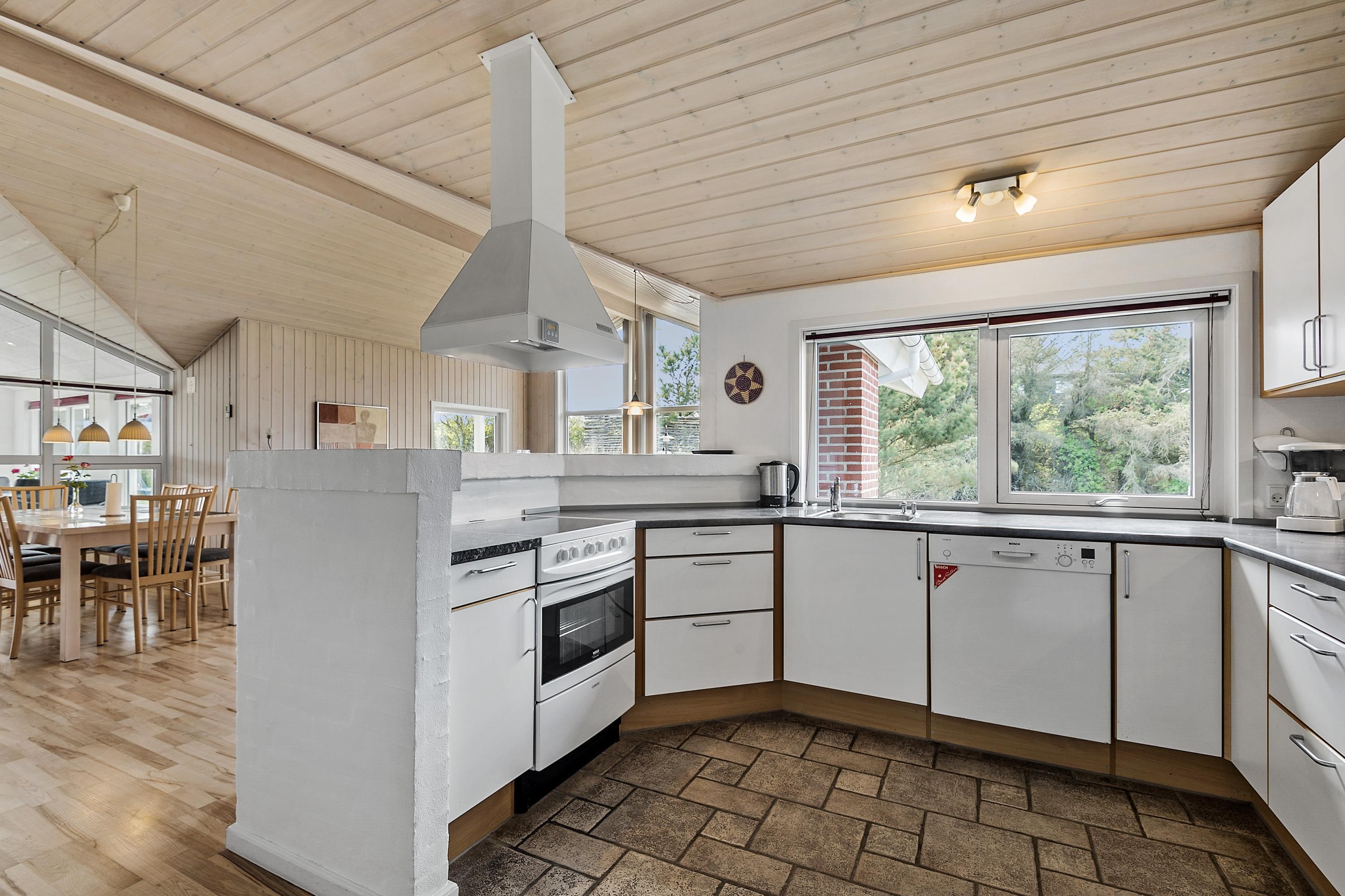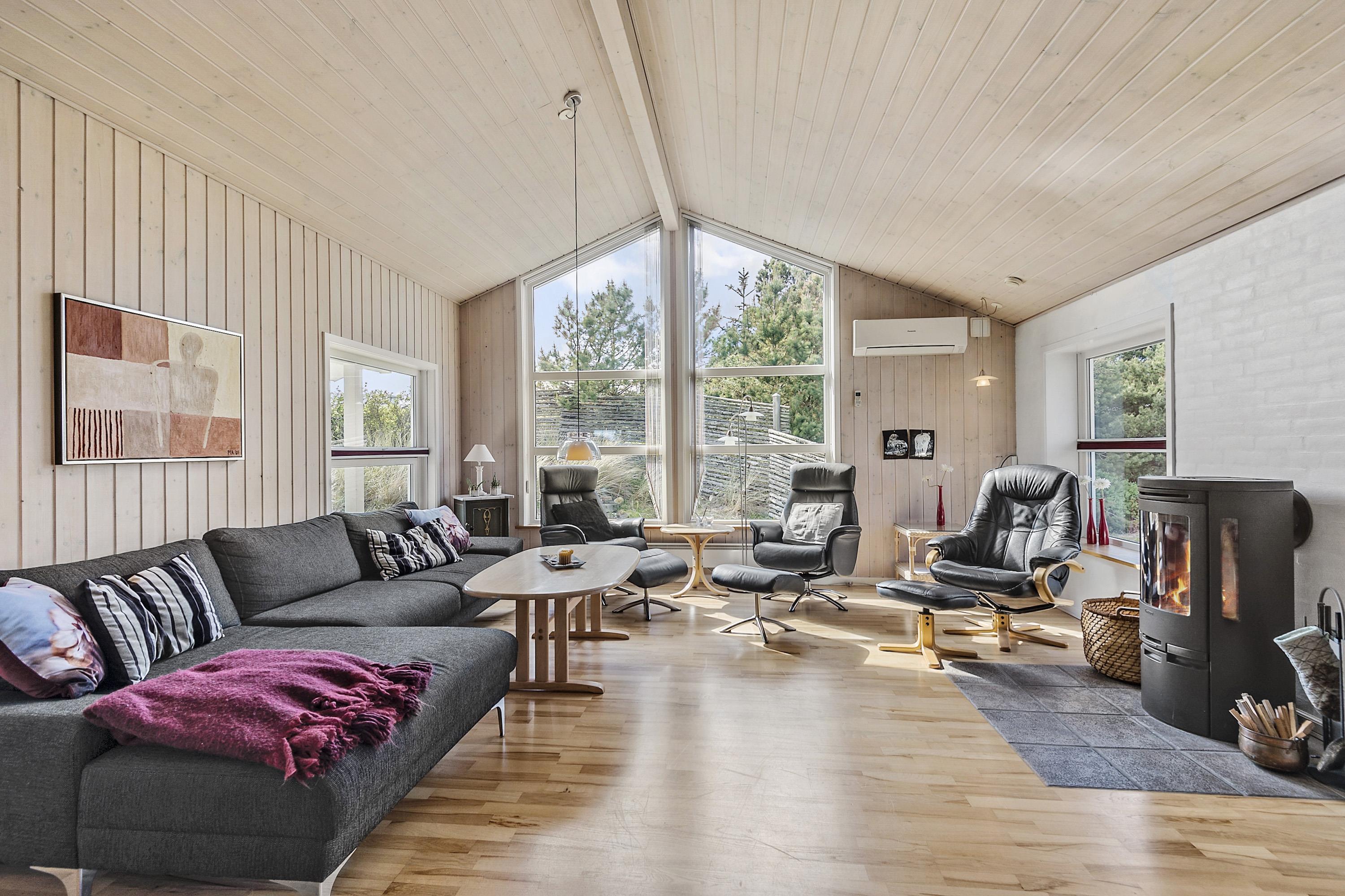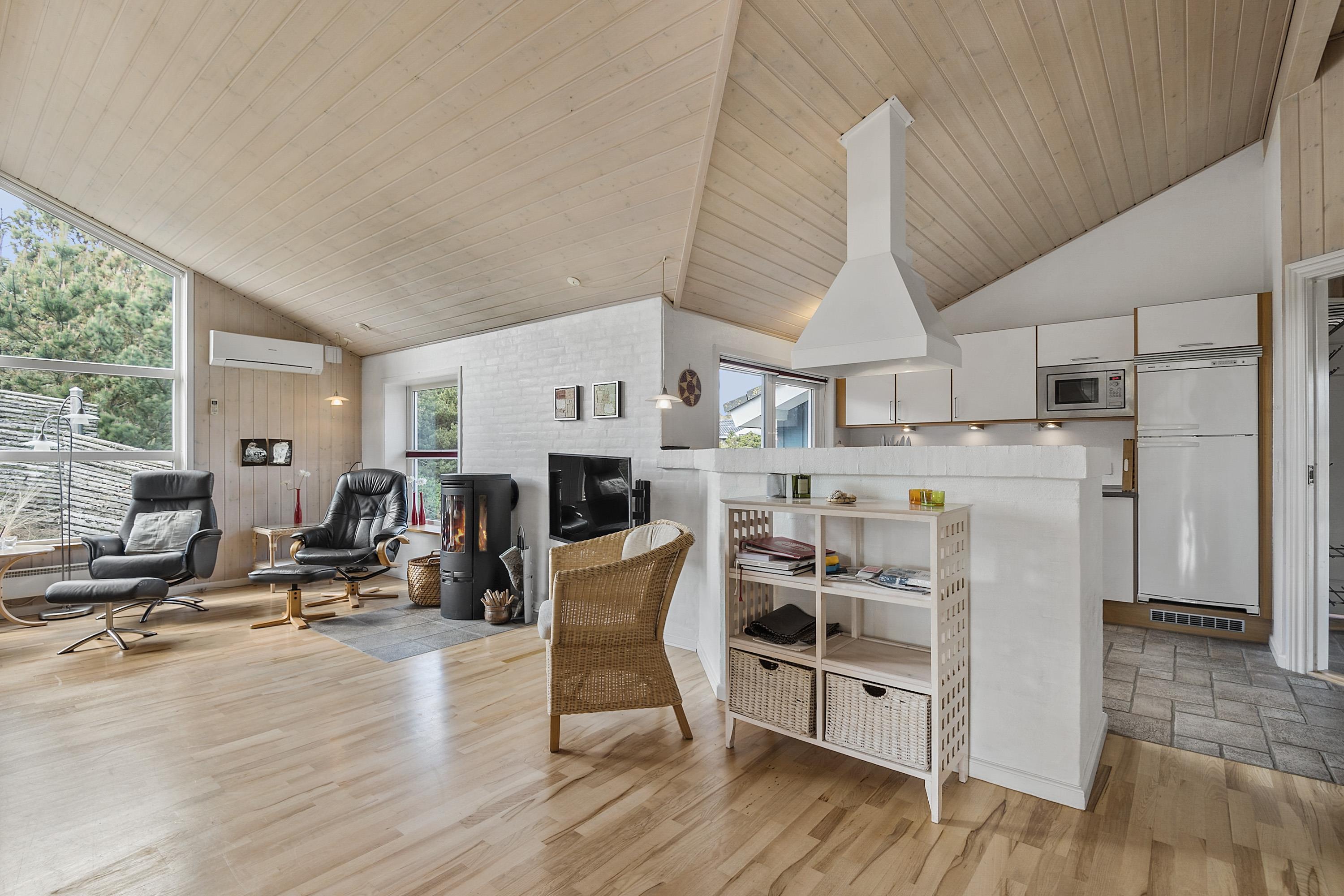 Huset er indrettet med åbent køkken op imod stuen. Hvor store vinduer og trægulv præsenterer stuen i et dejligt lys. I stuen finder du også en brændeovn som sørger for hyggen i den kolde tid på året.