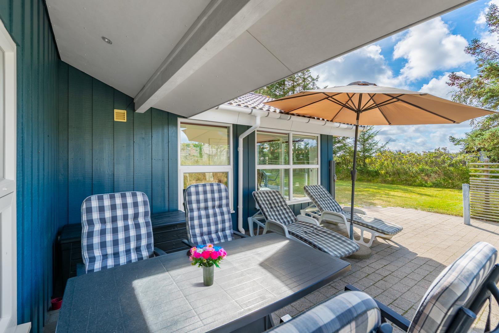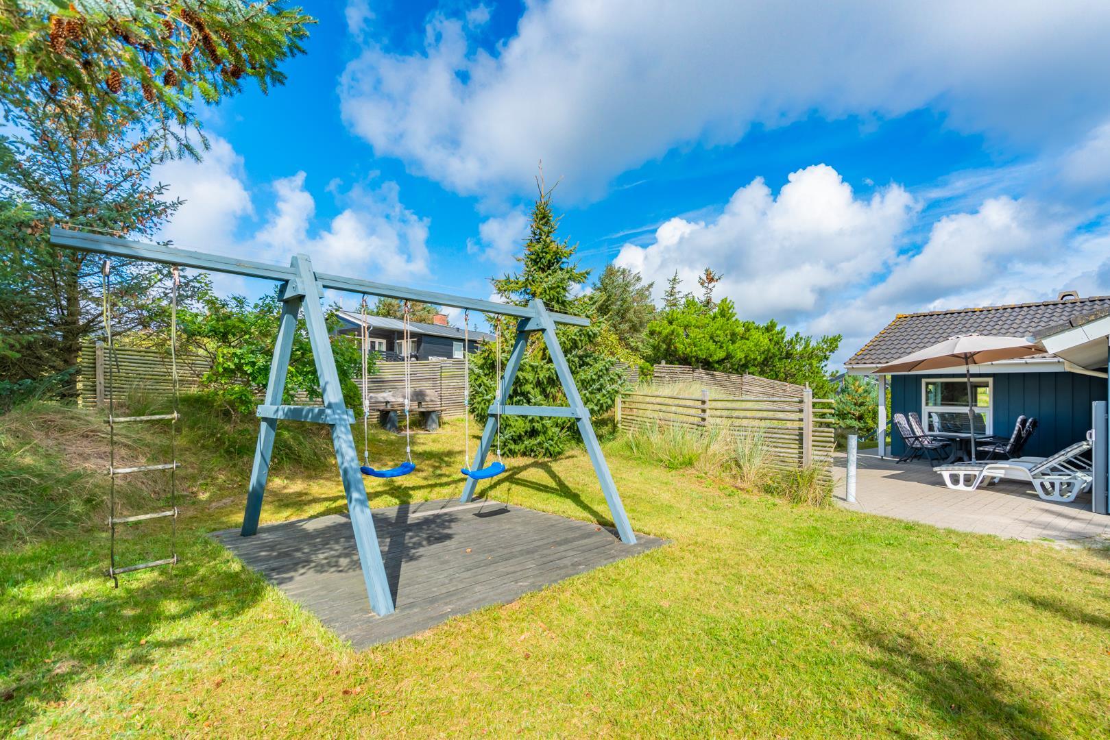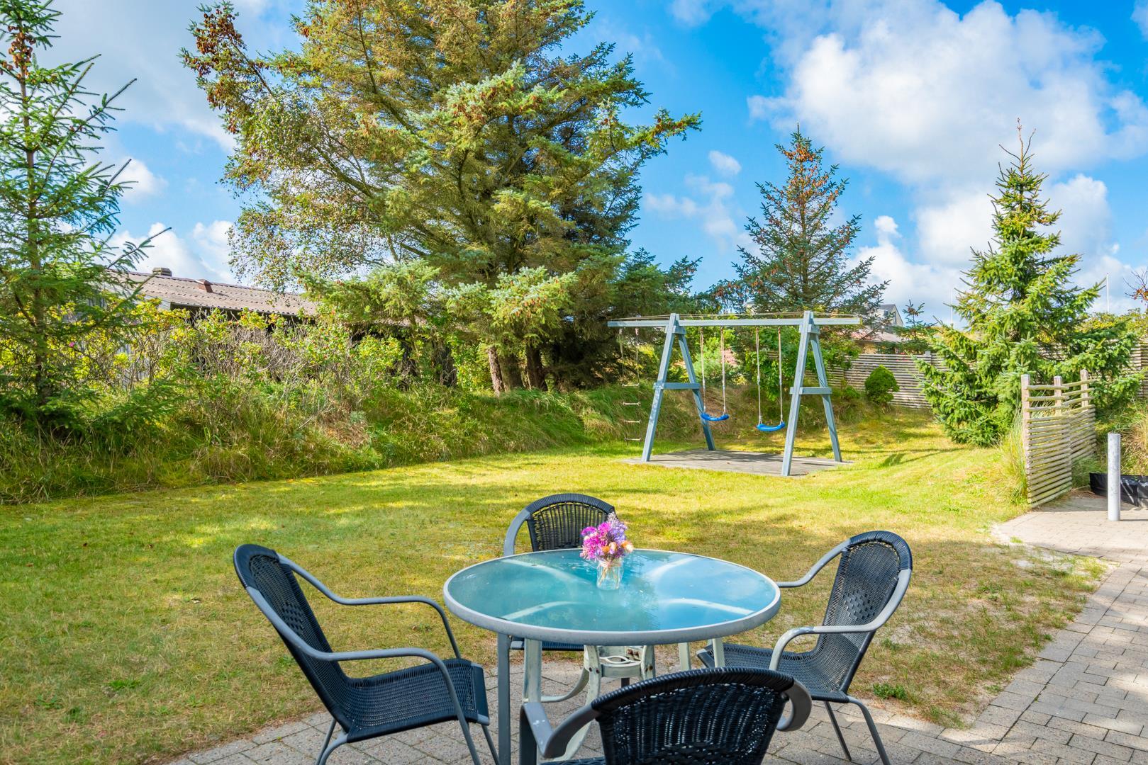 En dejlig terrasse med gode læ forhold hvor have møbler, liggestole og grill står til rådighed. Til husets små indbyggere står der gynge og sandkasse klar