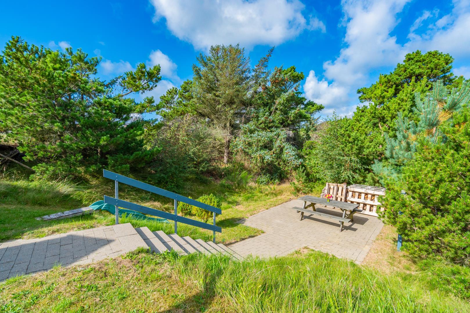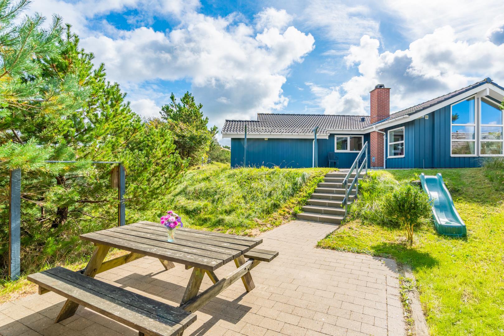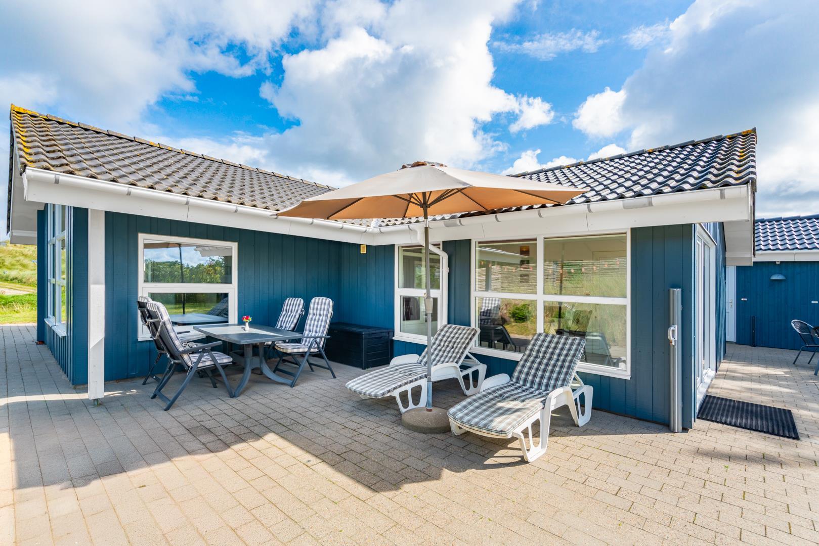 En dejlig terrasse med gode læ forhold hvor have møbler, liggestole og grill står til rådighed. Til husets små indbyggere står der gynge og sandkasse klar